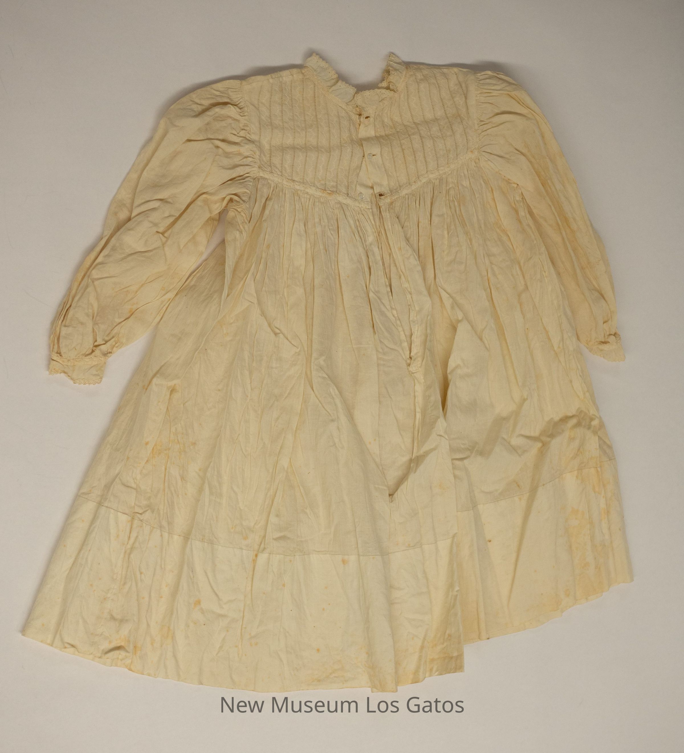 A small, long-sleeved, cream-colored dress. The majority of the dress is plain, with decorative vertical hem stitched embroidered fabric on the yoke and upper back of the dress. There is decorative eyelet detailing along the sleeve cuffs, as well as the neckline. The sleeves and waistline are gathered. The dress opens in the upper back, and closes with three small white buttons.Collection