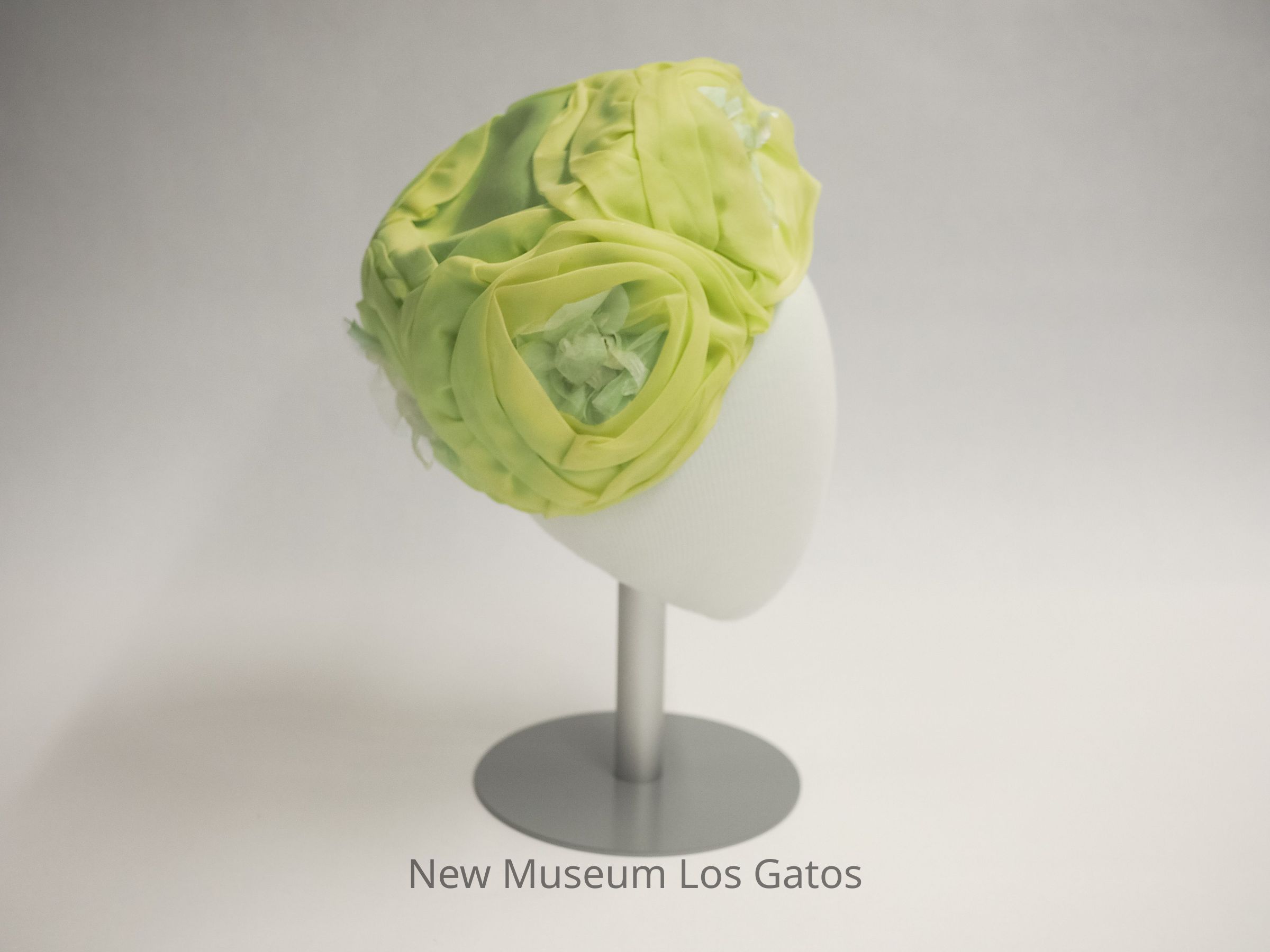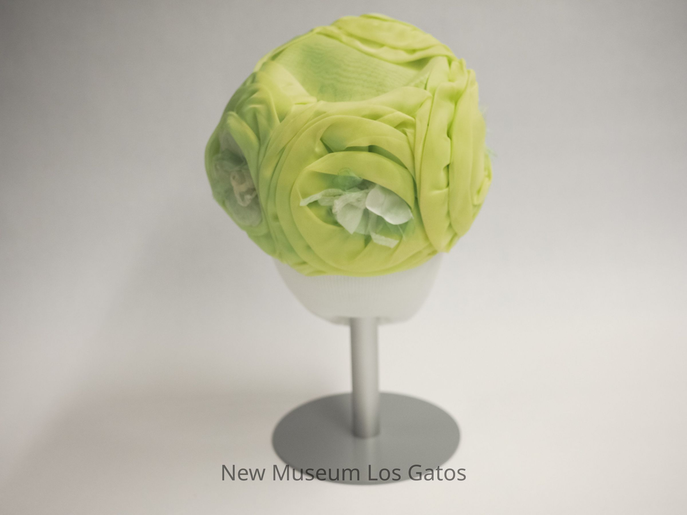 A light green nylon pillbox hat, with circular fabric decorations and white accents.