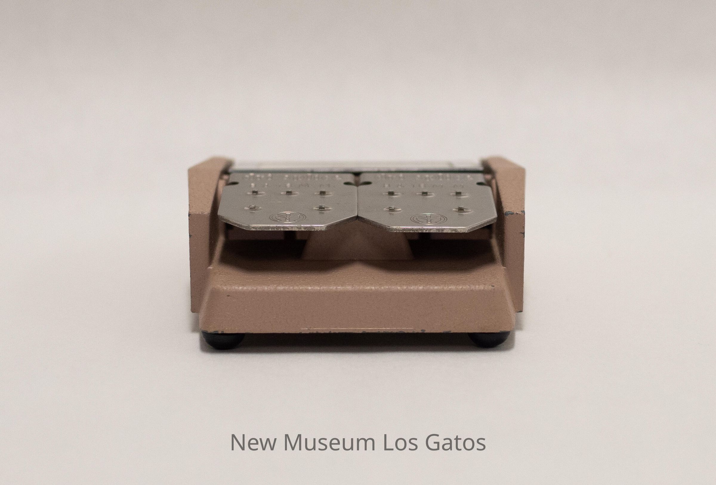 A vaguely rectangular, tan-colored metal film splicer, with accompanying box. The splicer has two silver metal tabs along the bottom that lift up and down independently, and one dark gray plastic tab with a gold label along the top, that also lifts up. The box is navy, white, and orange.Collection