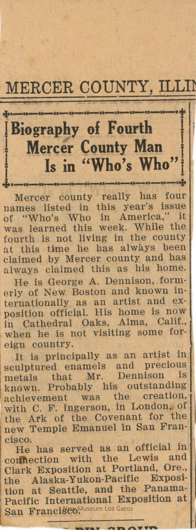 Newspaper clipping from the Aledo Times Record, from an unknown date. The article is about George Dennison, being elected to the list of Marquis' "Who's Who in America," and who is notable in Aledo, Illinois.Collection