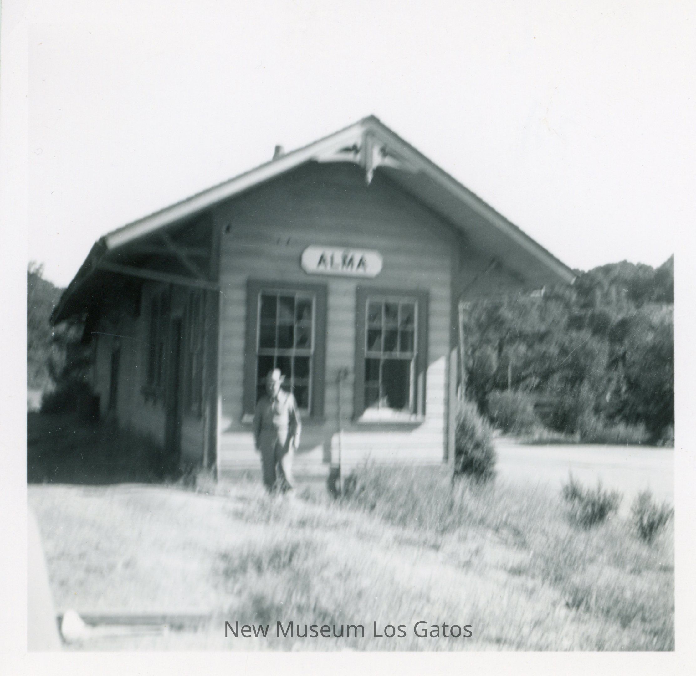 A black and white photograph featuring (presumably) the Alma train station. The station is in the center of the image, with a man standing in front of the building. There are trees and hills in the background. The image is blurry, and surrounded by a white border.Collection