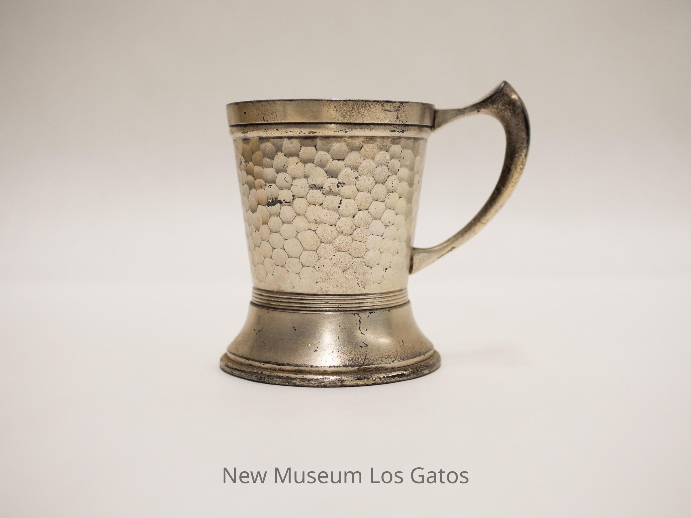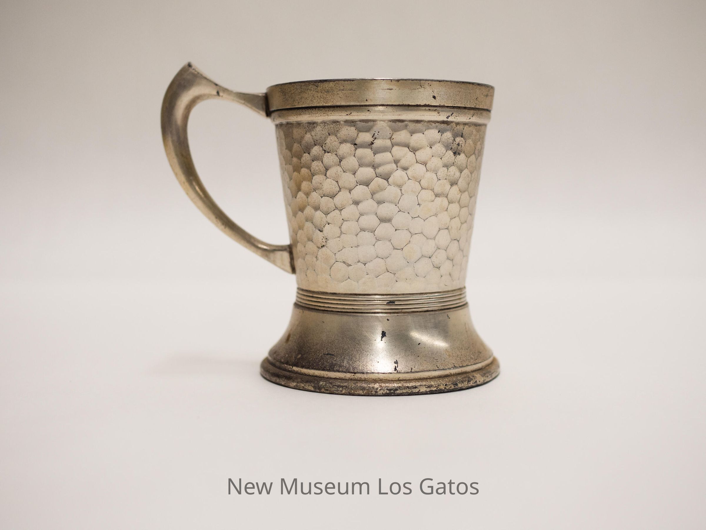 Aluminum cup with decorative hammering pattern. Appears to be missing the bottom.