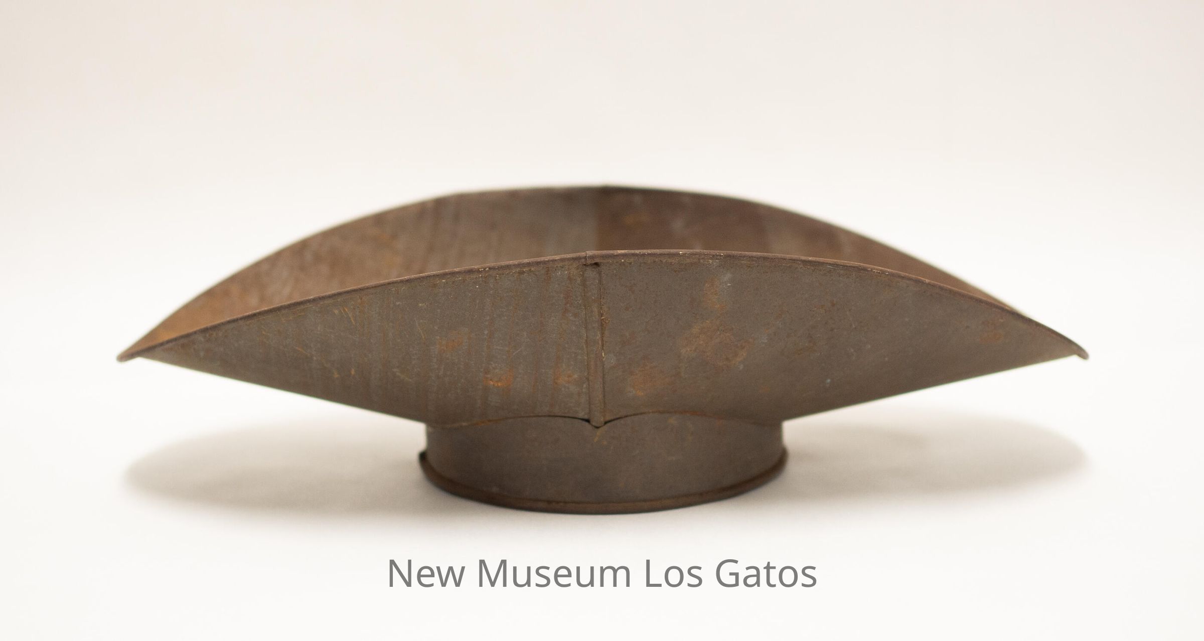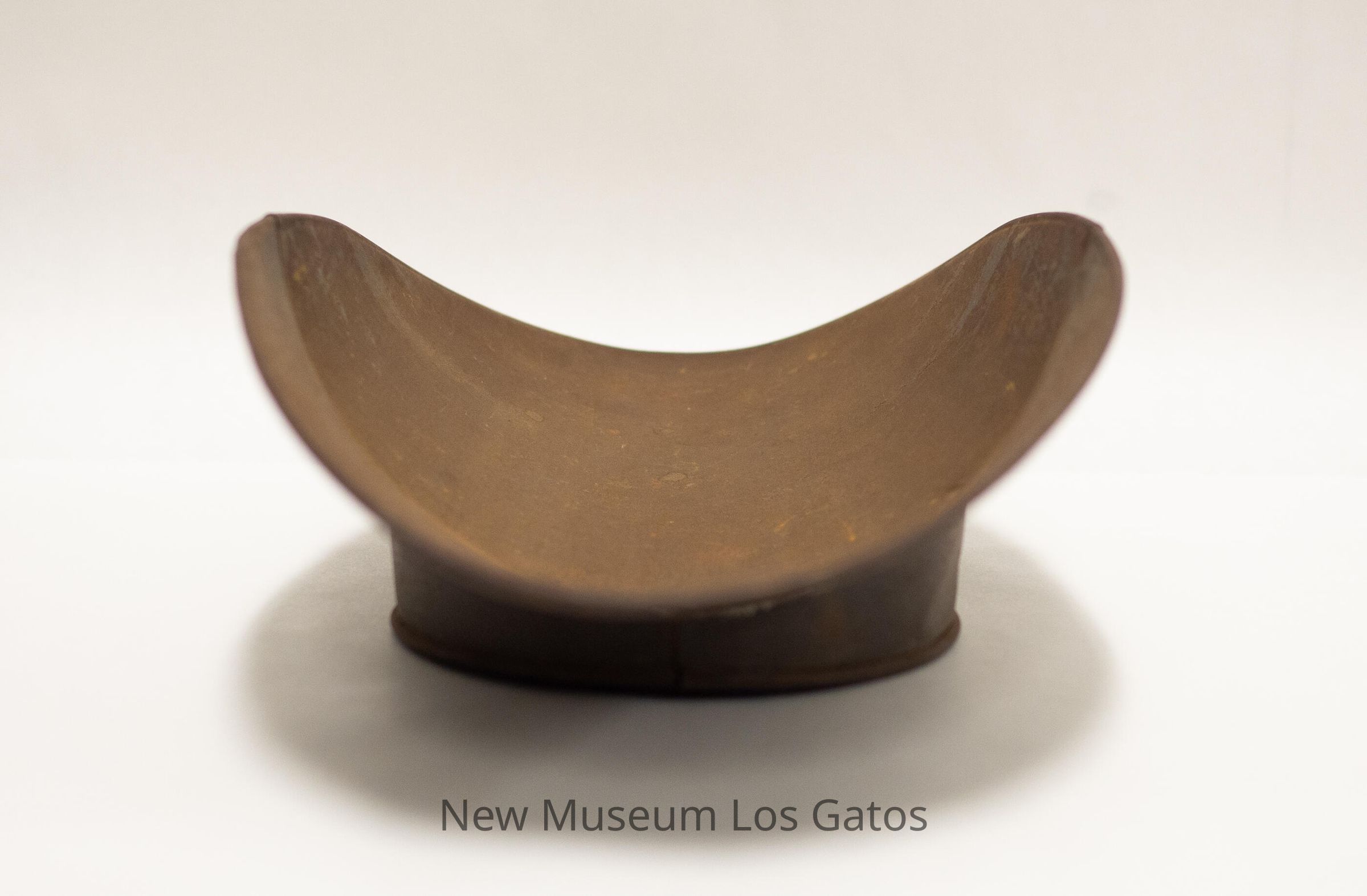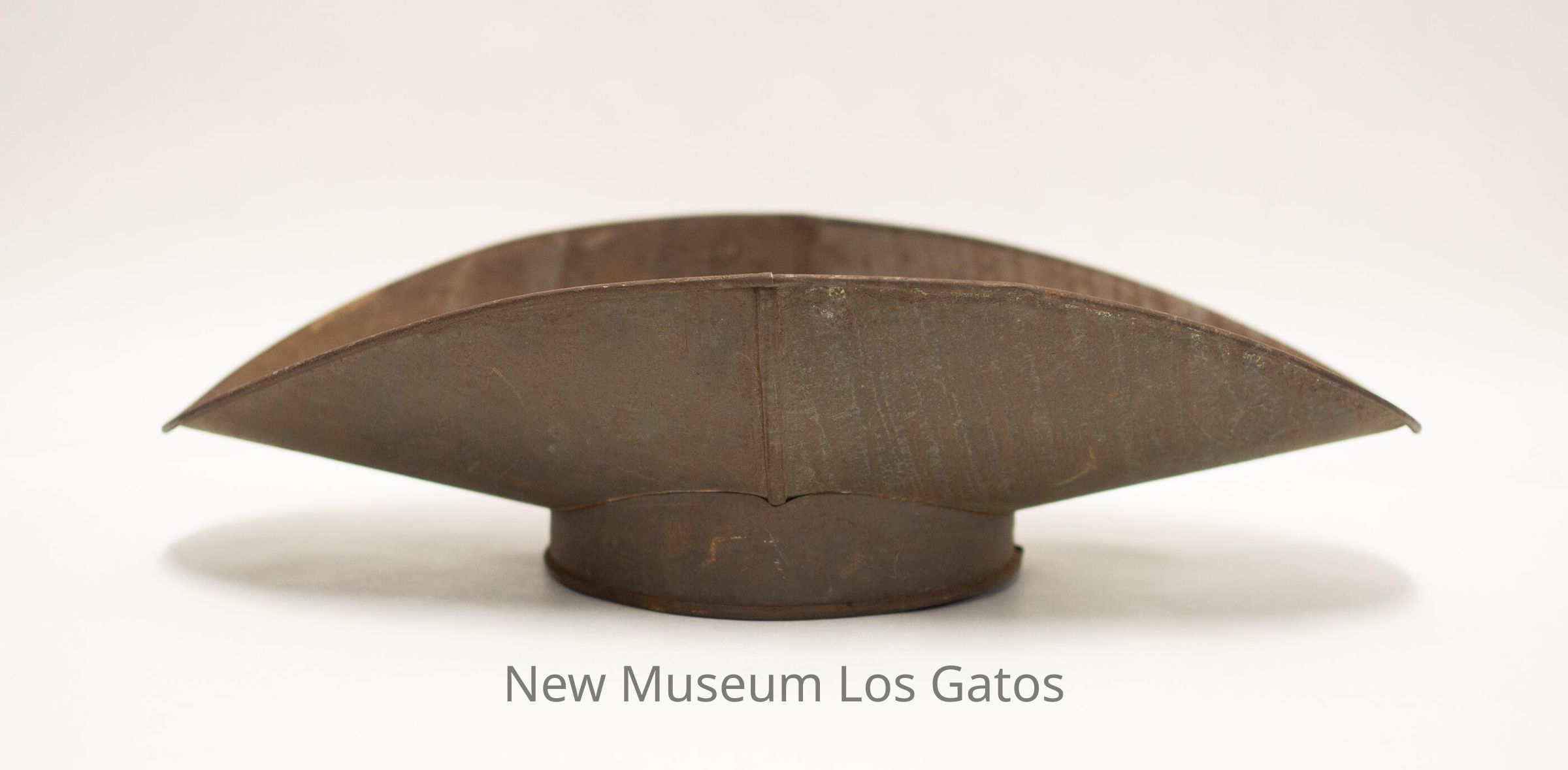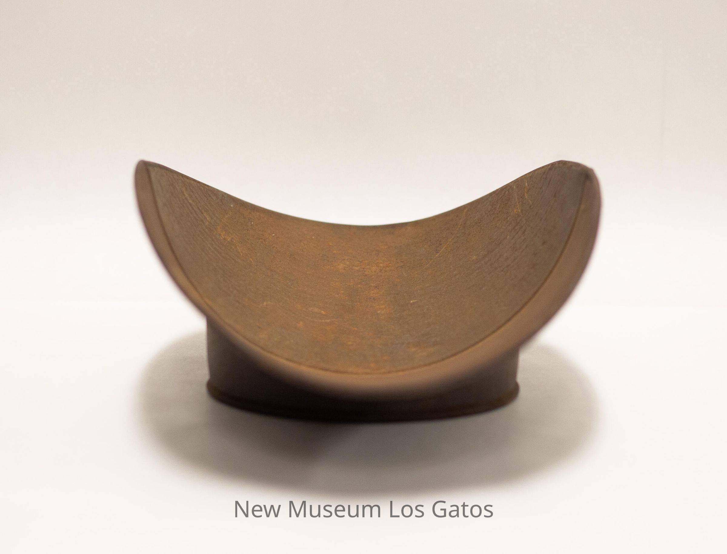 A large, metal scooped bowl, similar in appearance to a taco shell. There is a circular metal base attached to the bottom of the bowl.Collection