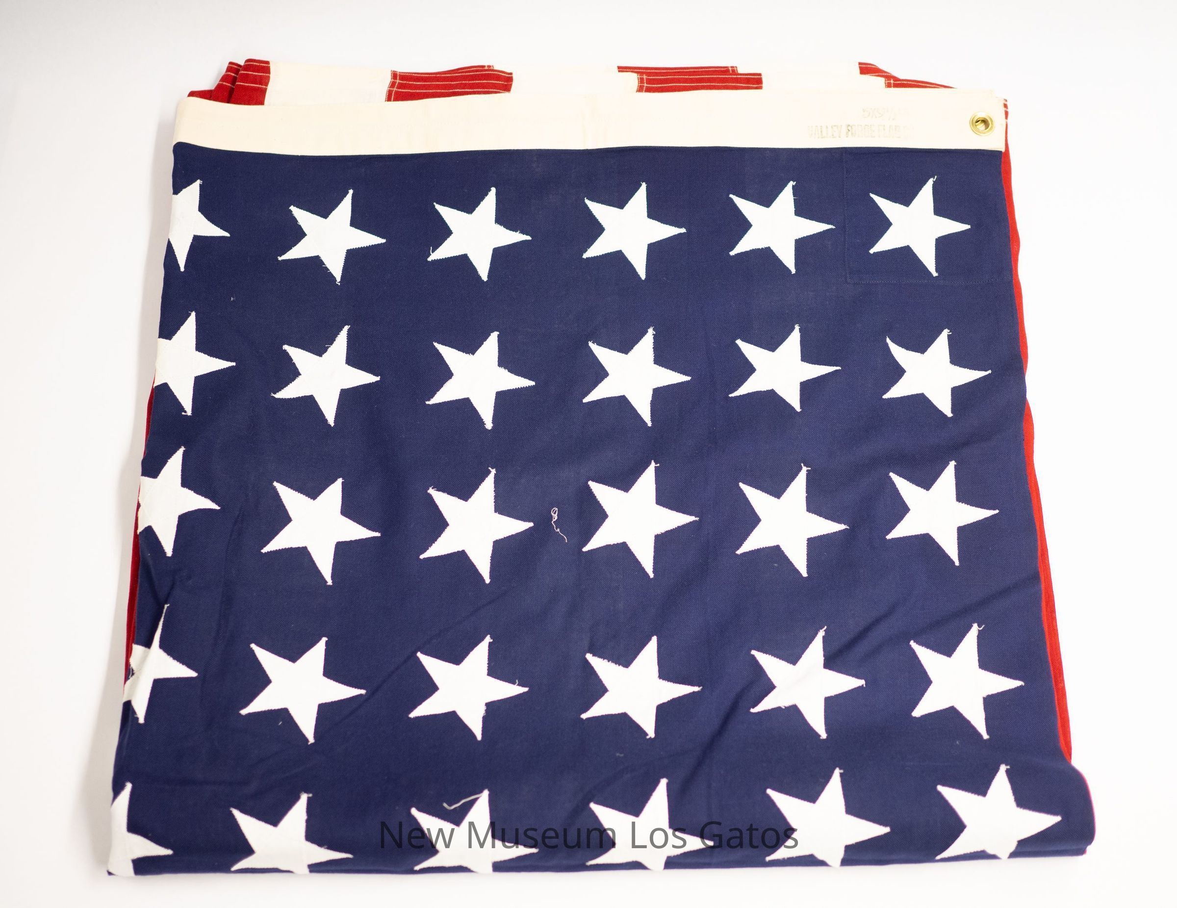 A full size, 48 star American flag. There is a white cloth strip along the left side, with two brass grommets, one at the top and one at the bottom.Collection