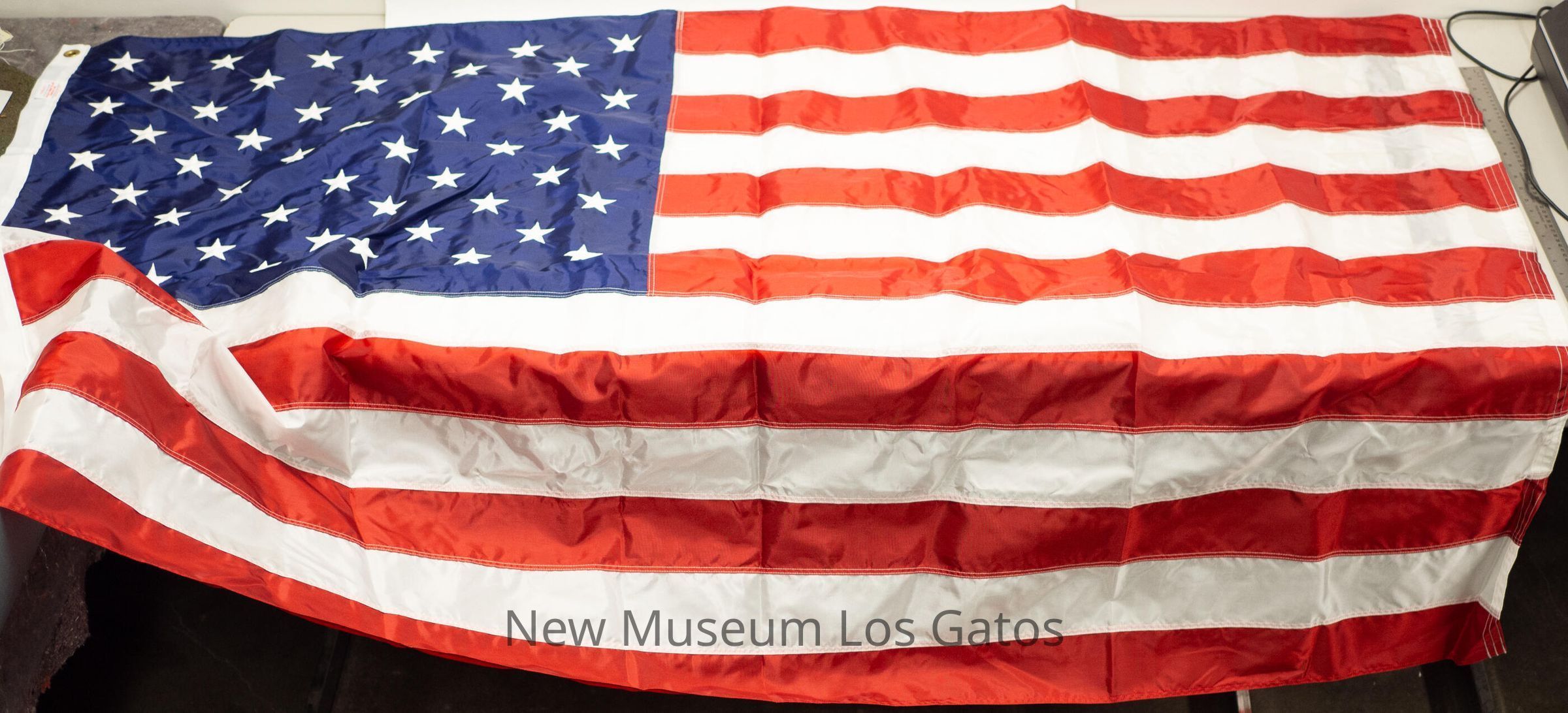Full size, 50 star American Flag. There is a white cloth strip along the left side, with two brass-ringed holes, one at the top and one at the bottom.Collection