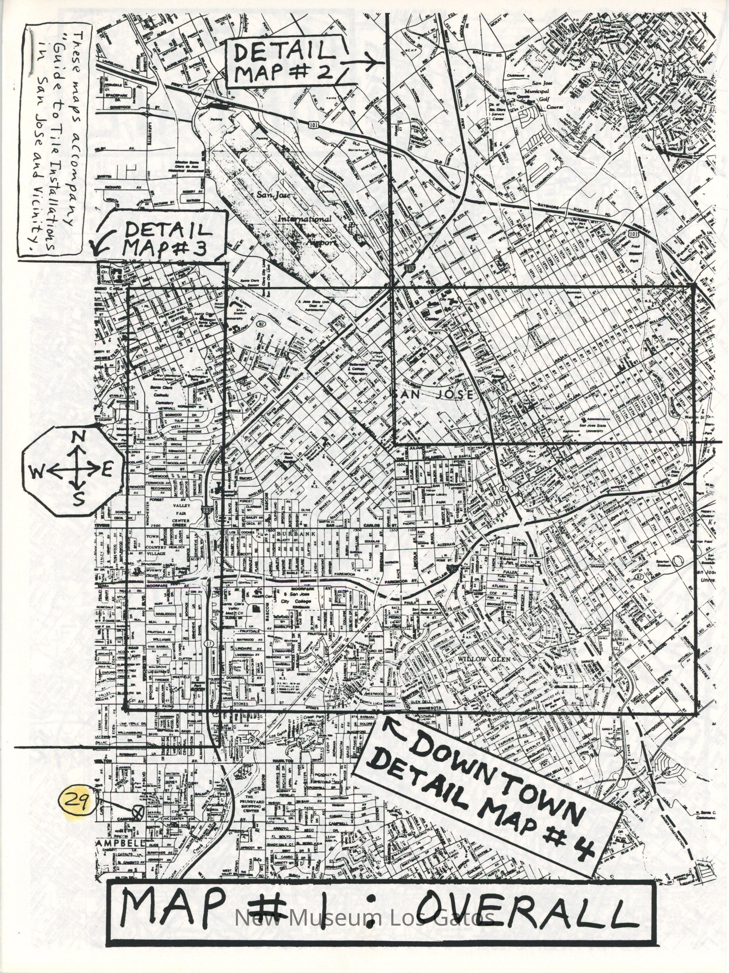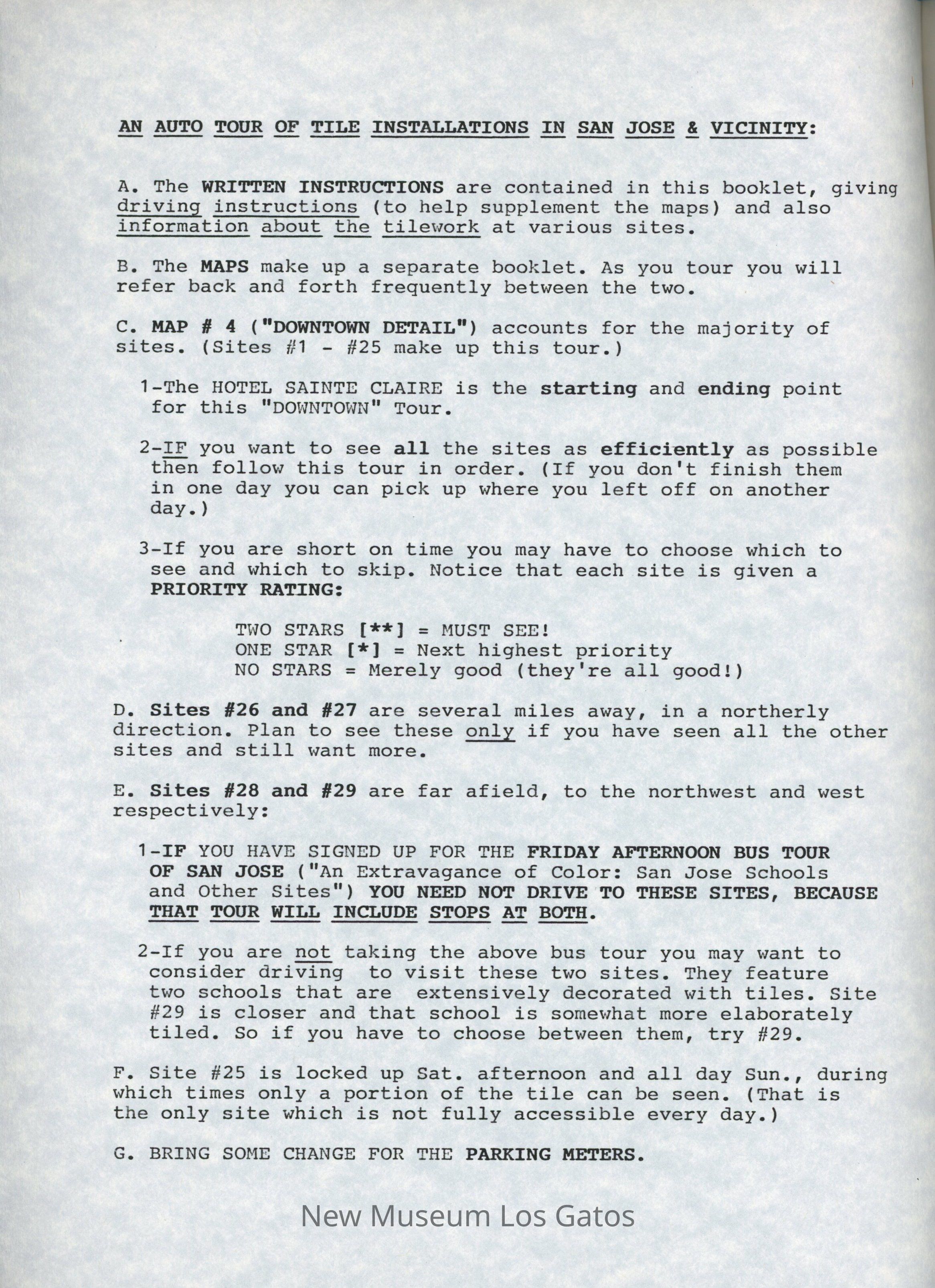 Black and white paper stapled booklet, containing a map and guide for an automobile tour of various sites of tile work in San Jose, and nearby cities. The cover is grey, the rest of the pages are black and white. The front cover has two black and white photographs of tiles. The map is seperate from the stapled booklet, tucked between the pages. The booklet contains several maps, timetable, detailed driving instructions, information on the sites, and an appendix of information about optional sites.Collection