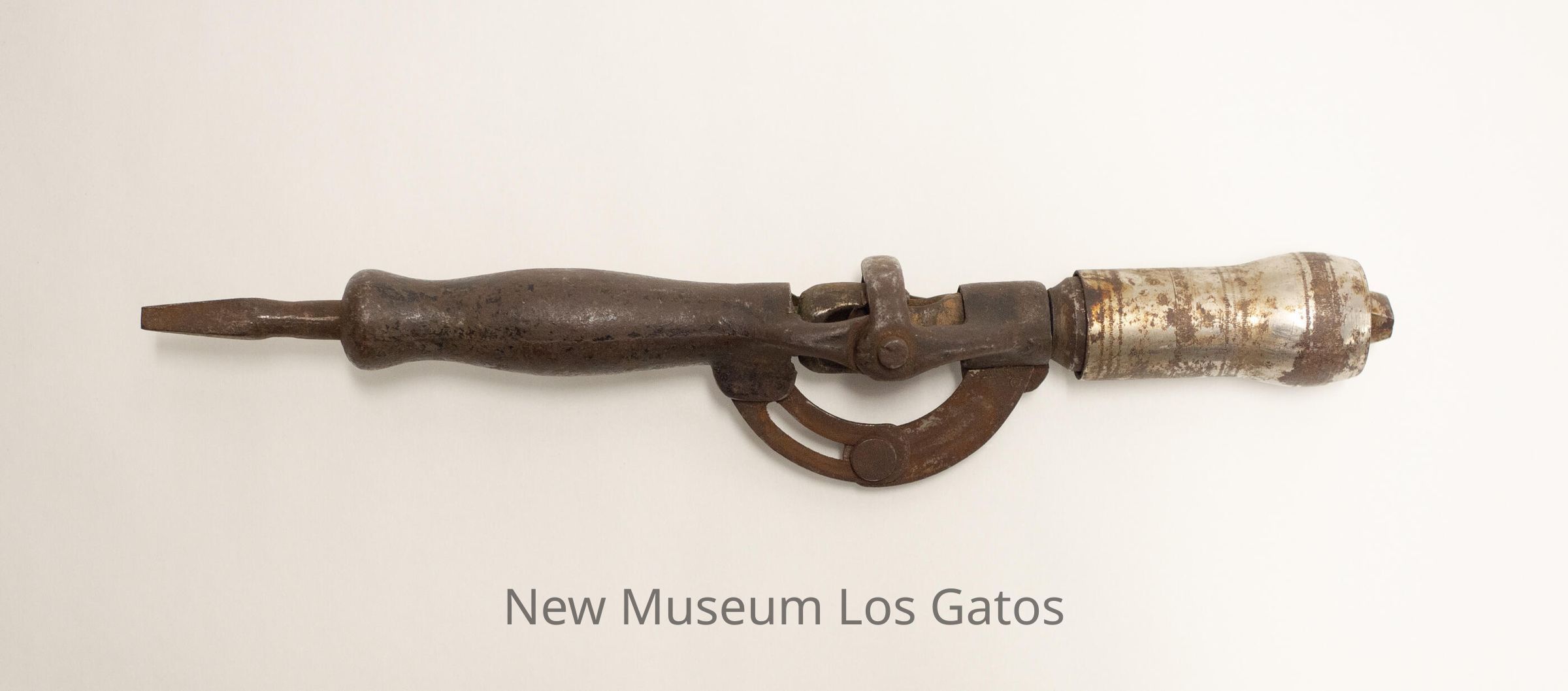 A metal tool that consists of two parts that join together at an adjustable center. One side has a handle with tapered, square tip at the end, while the other side has a short metal cylinder that widens at the end, and has clamps tucked inside the end.Collection