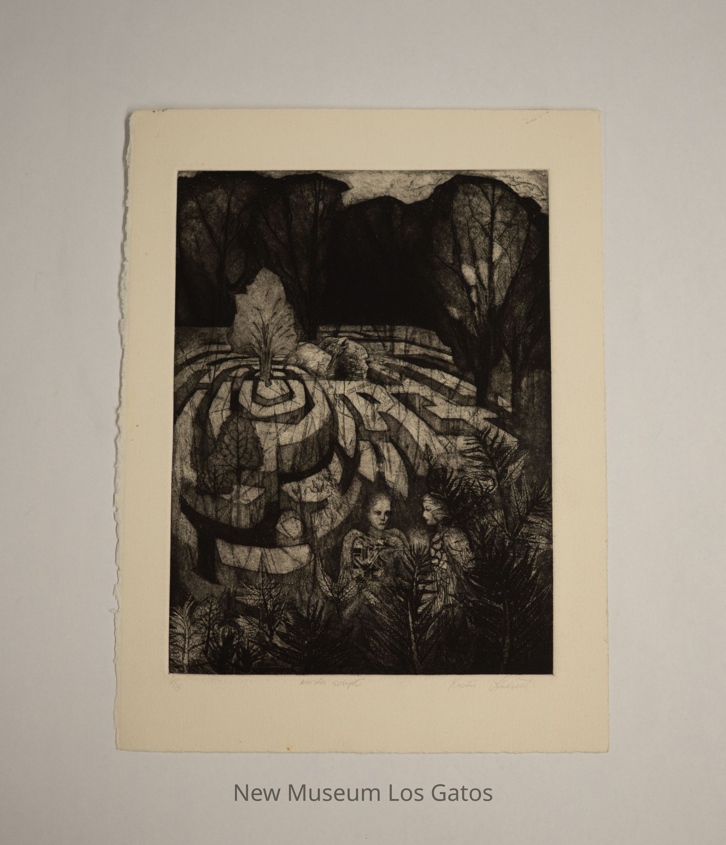 An intaglio; etching, softground, and aquatint print depicting a maze. The maze is roughly circular, with trees and foliage surrounding it and in it. There are two human figures in the foliage, in the foreground.
