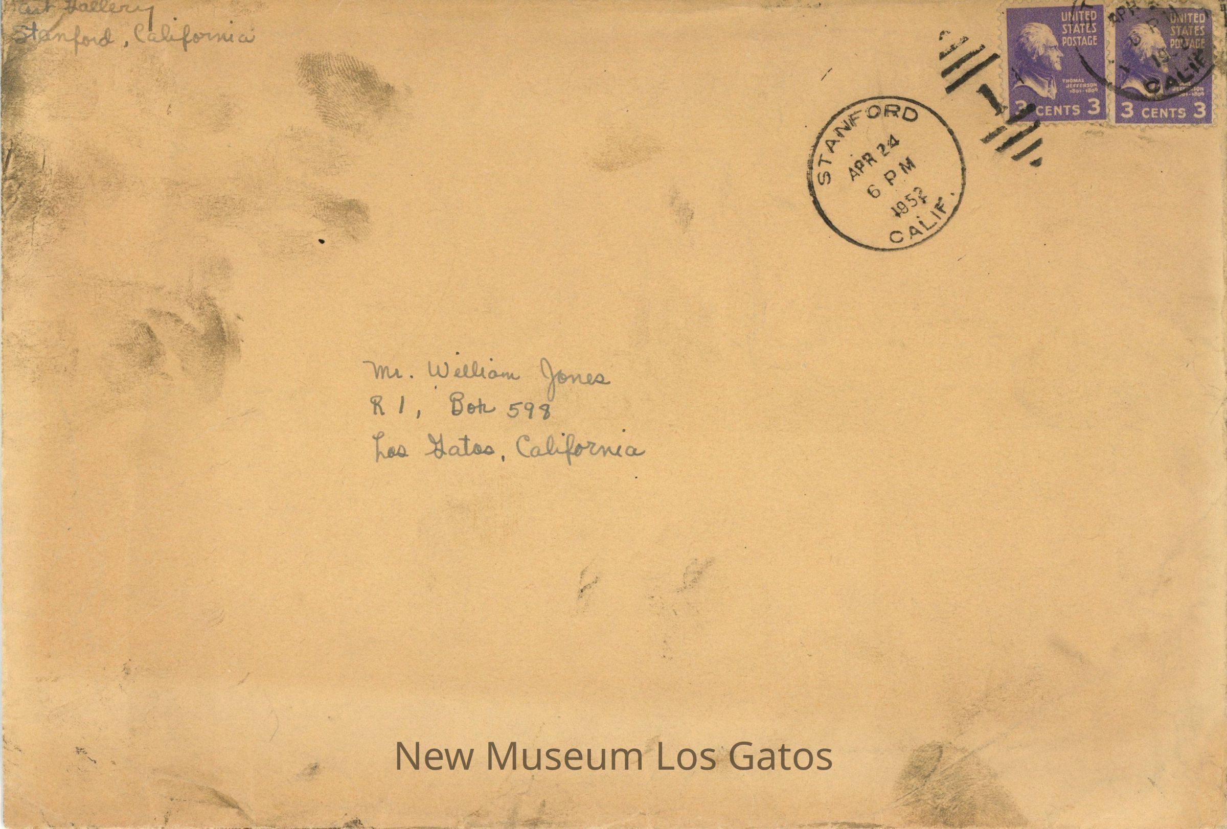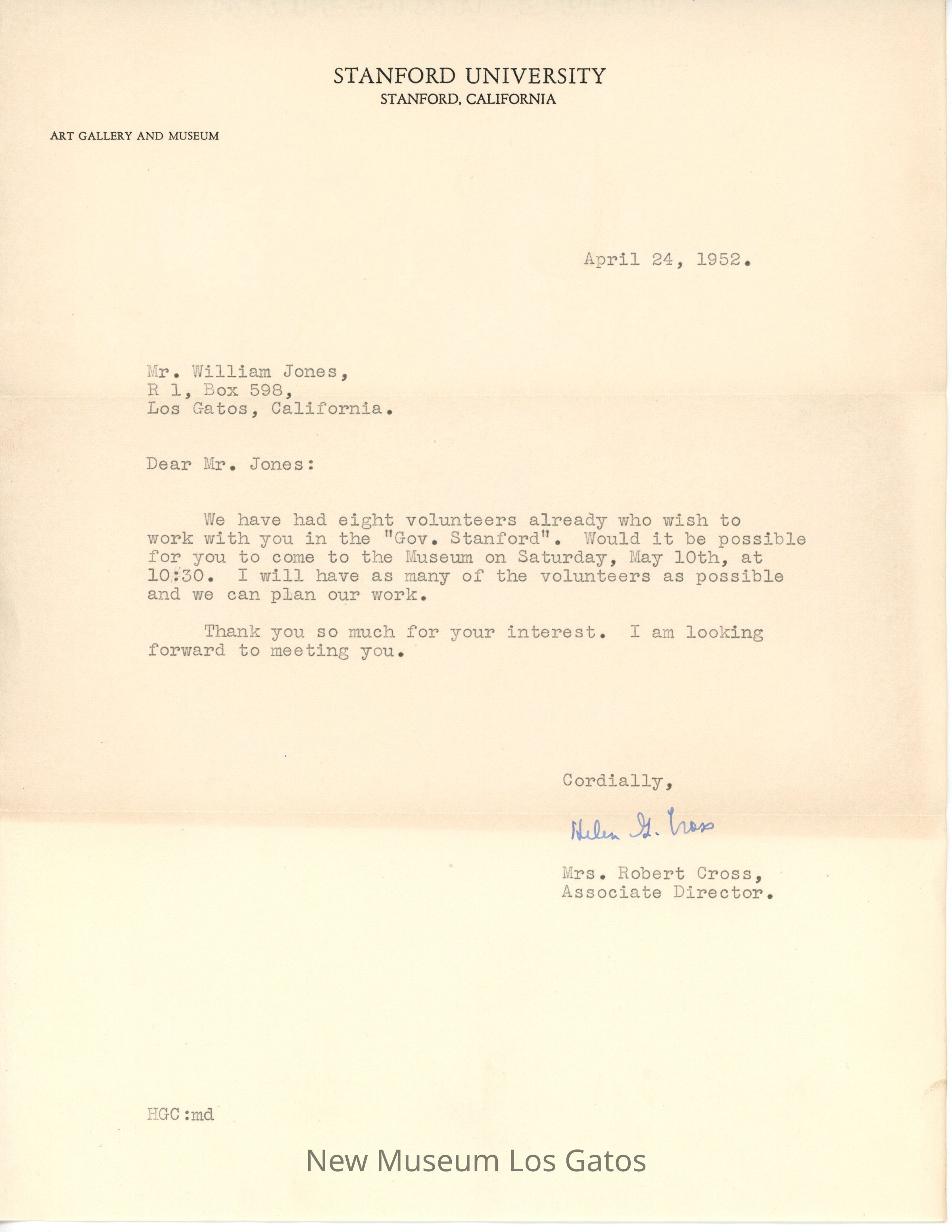 A typed letter to Billy Jones, from the Associate Director of the Stanford University Art Museum, inside an envelope that was mailed. The letter asks if Mr. Jones wants to come to the museum to meet with some volunteers who have offered to work with him on the "Gov. Stanford."Collection