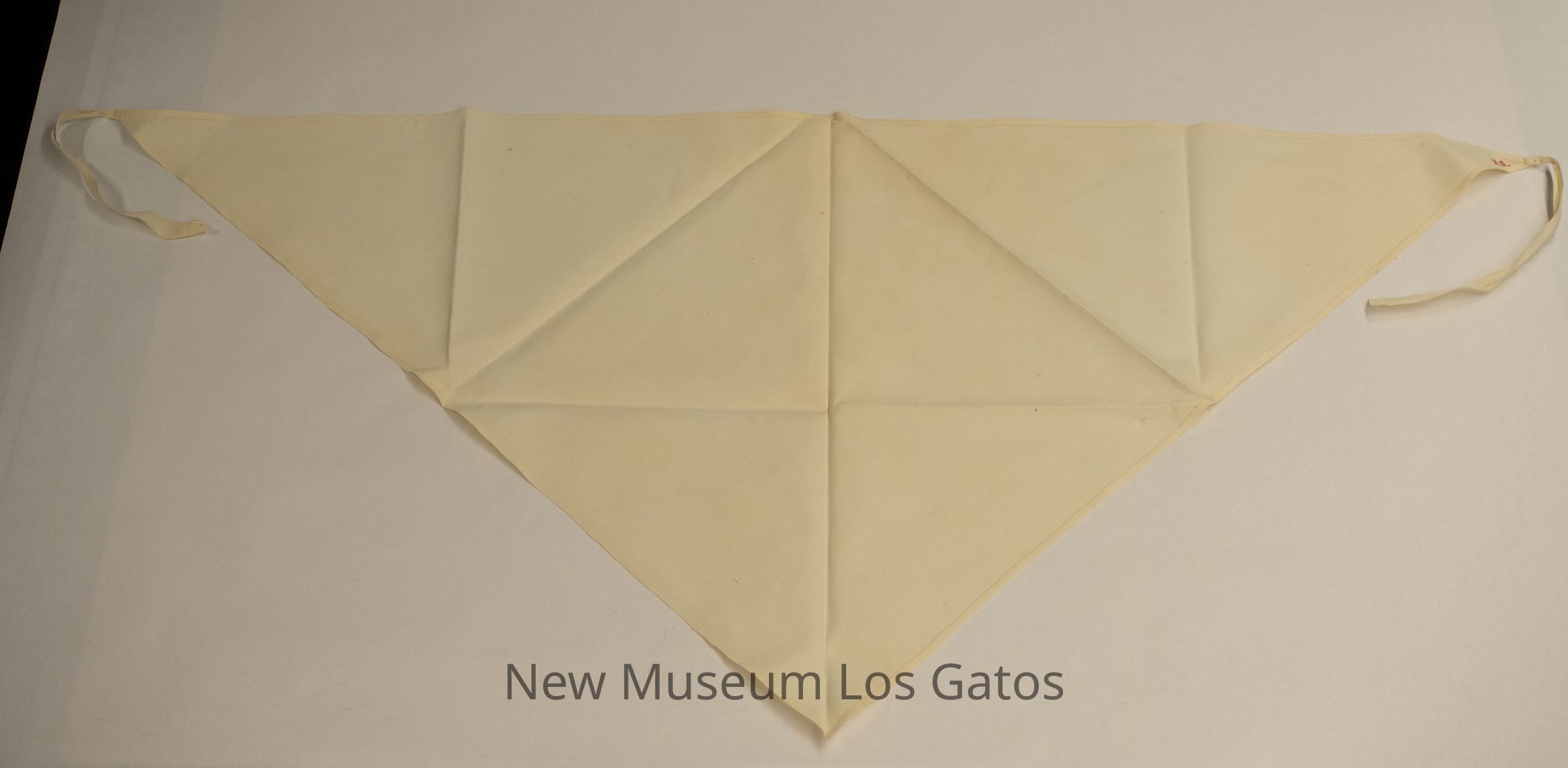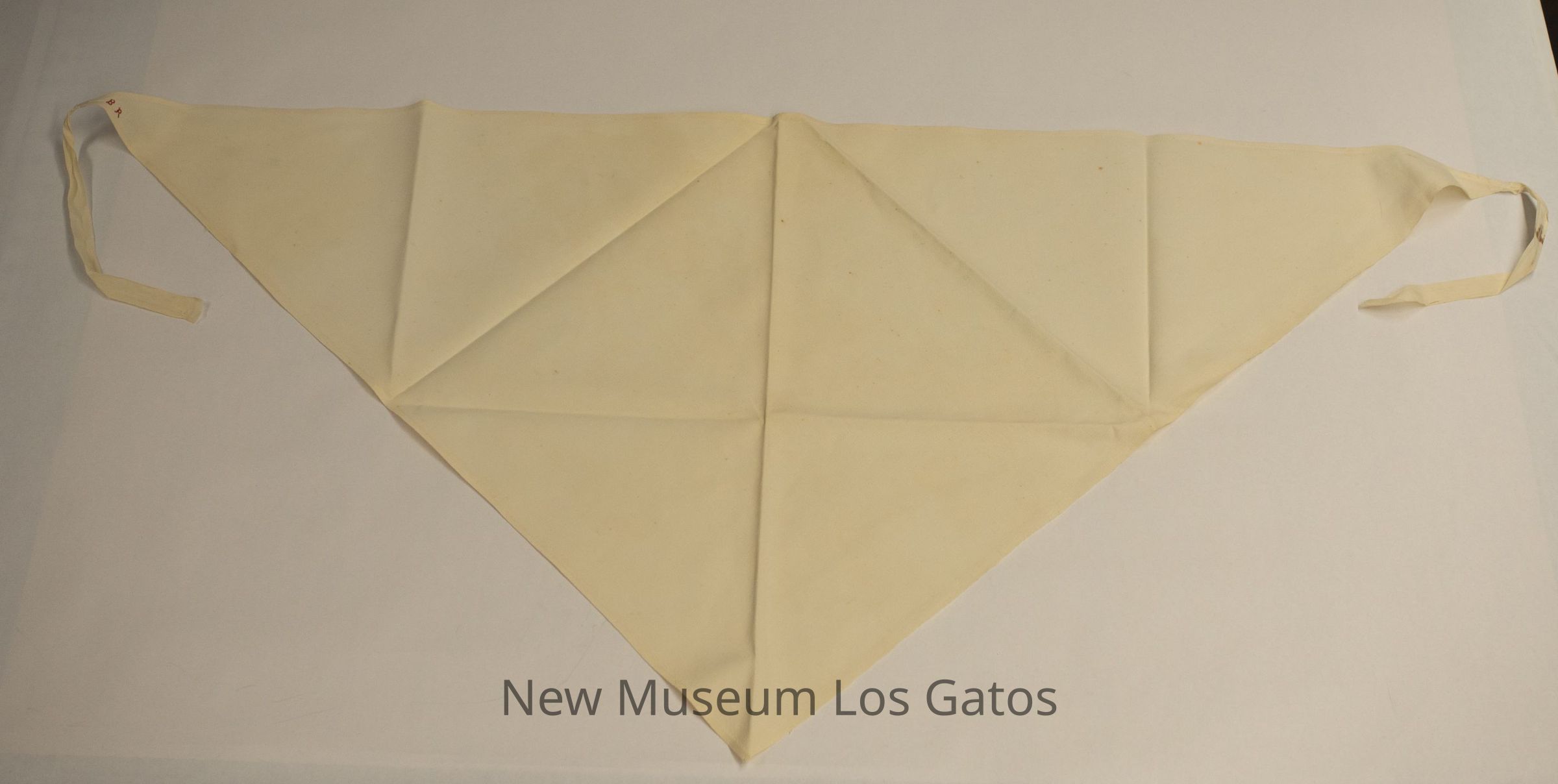 A triangular, plain cream-colored apron. There are two short fabric ties, attached to either side of the apron.Collection