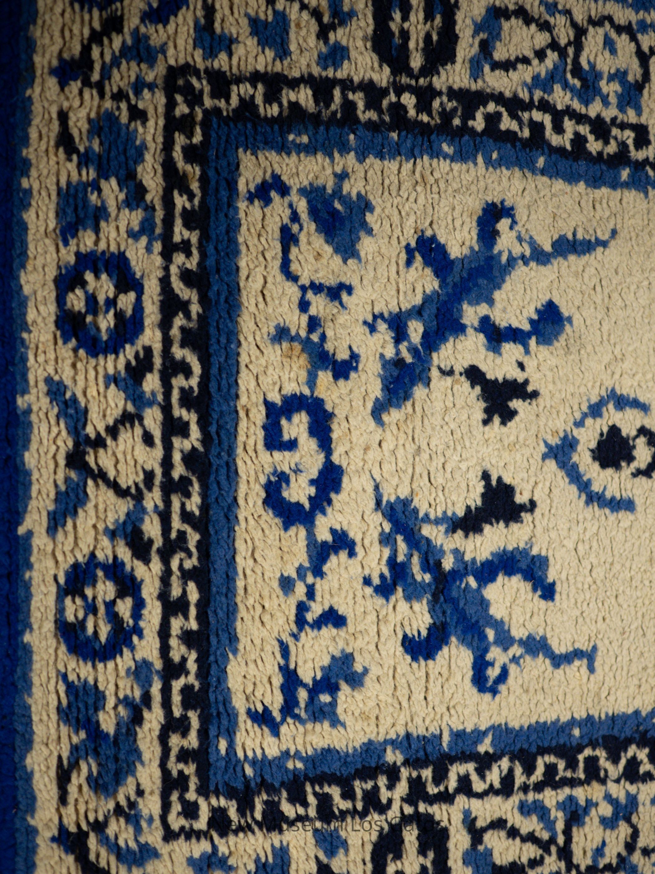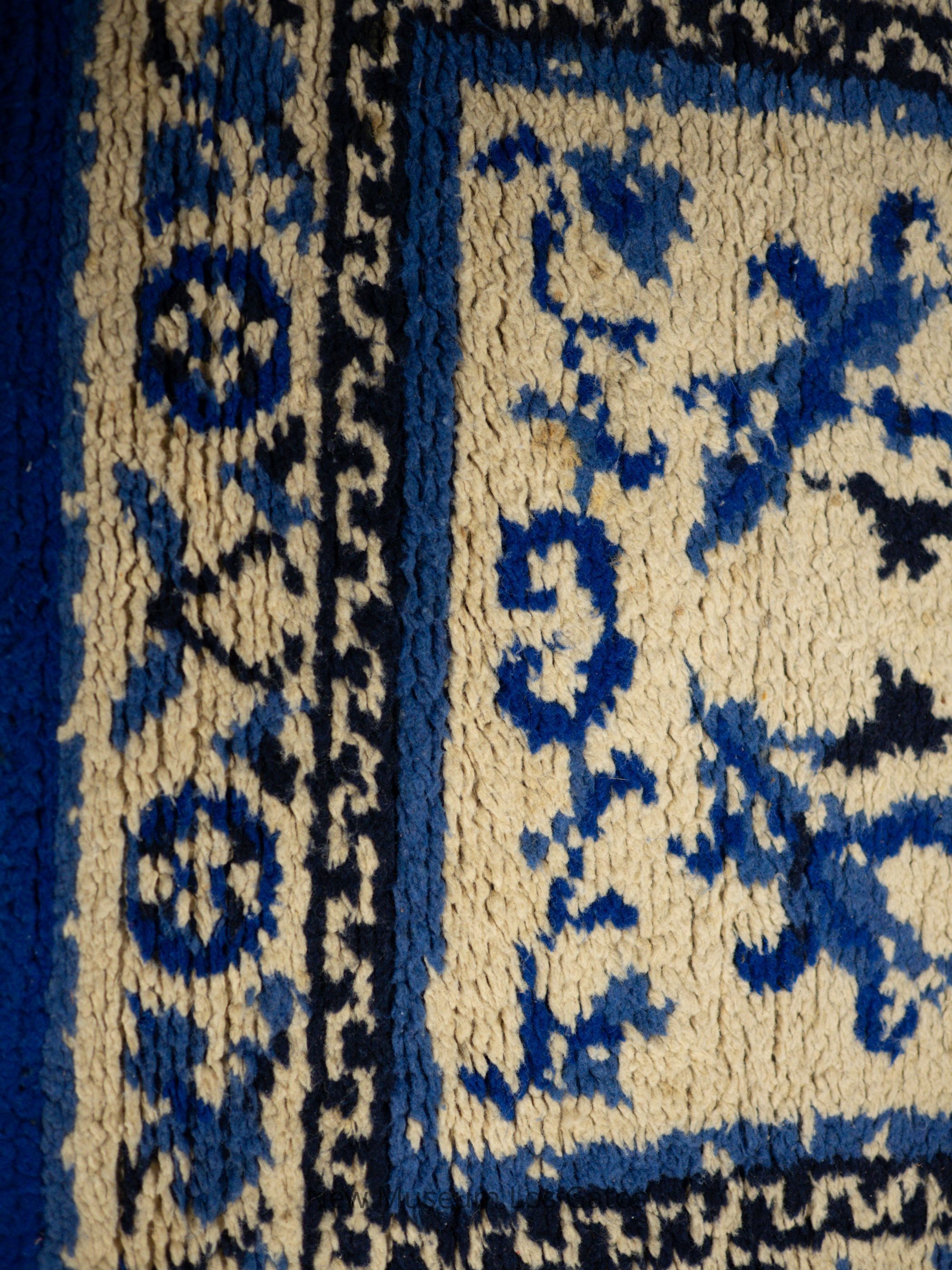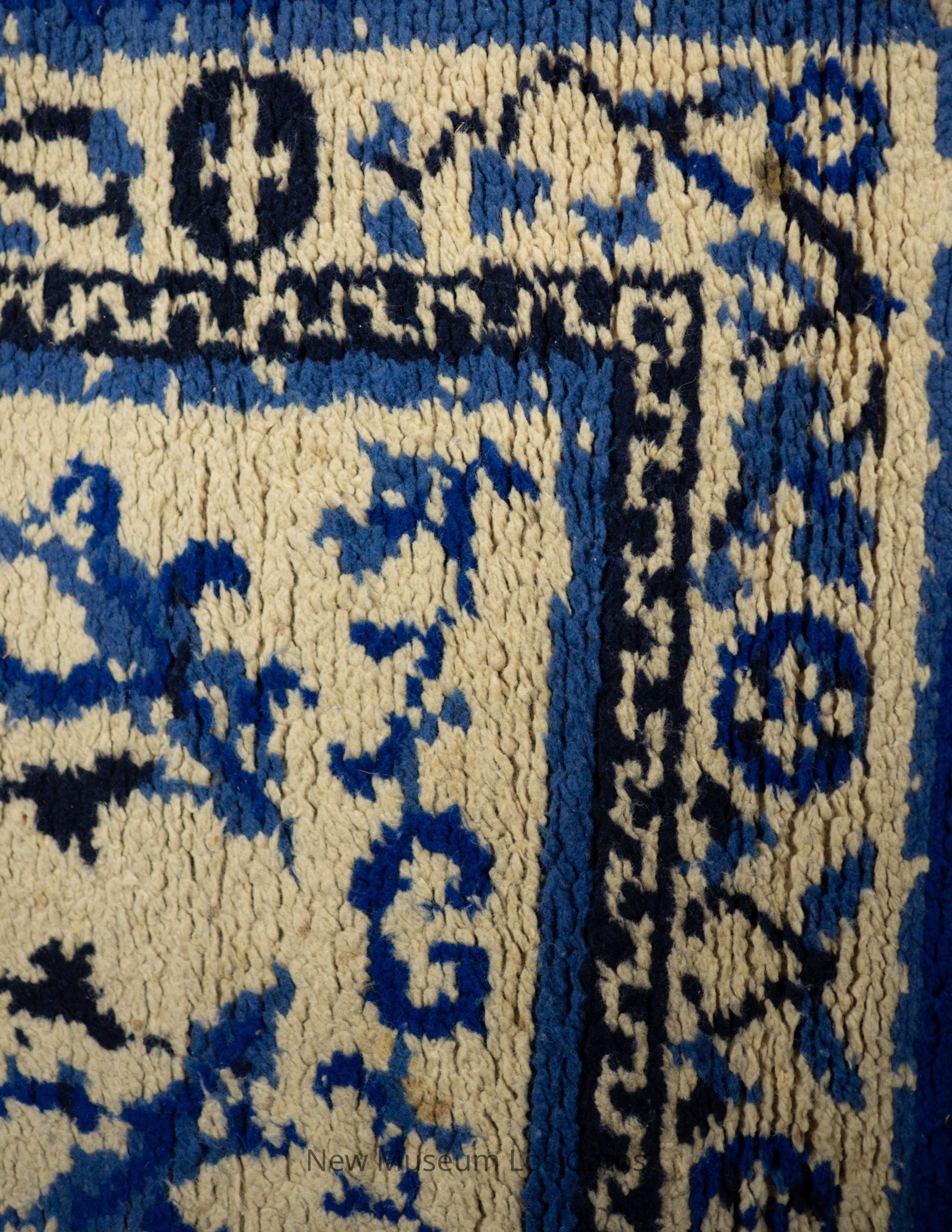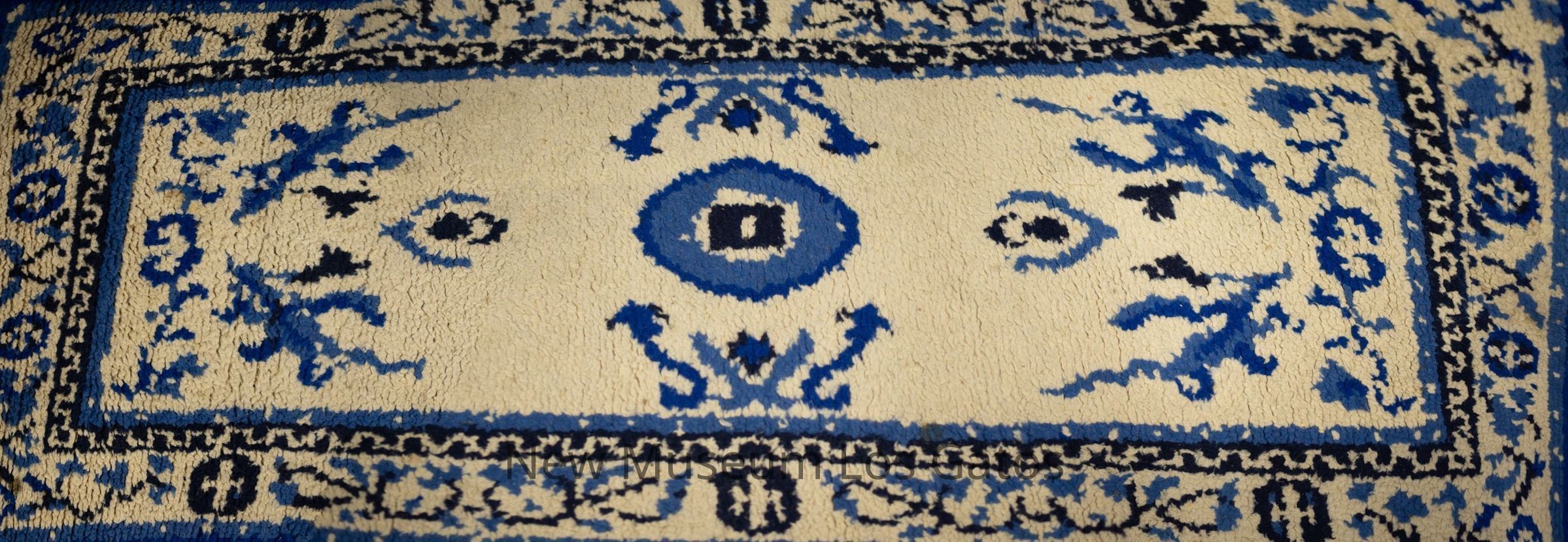 A stylized shag area rug, with an intricate pattern of blue, light blue, black, and white.Collection
