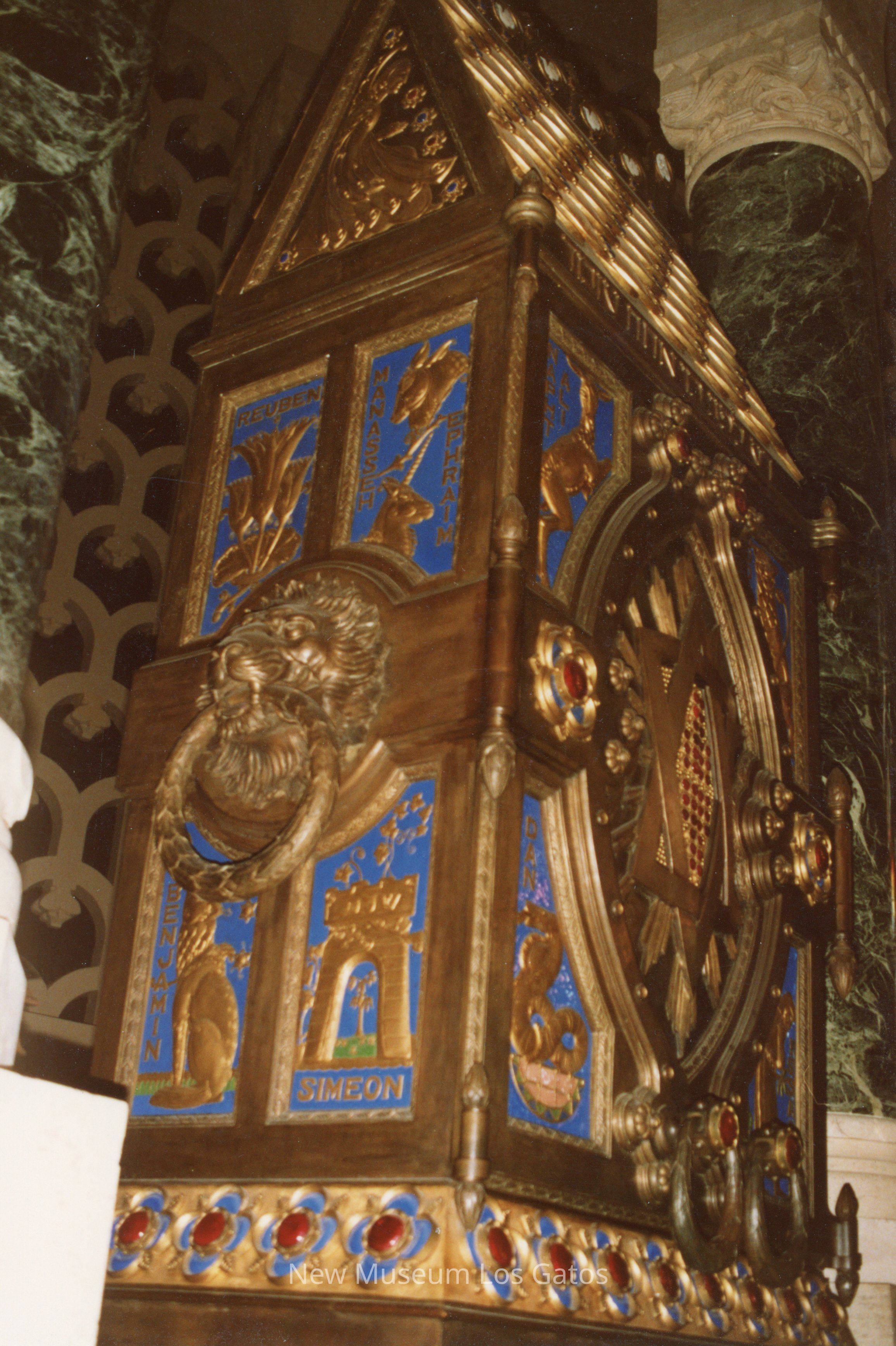 A color photograph featuring a side view of the Ark of the Covenant. The side with the doors is visible, as is one of the shorter sides, featuring a lion head with a circle in its mouth as well as four additional feature panels.Photograph Details