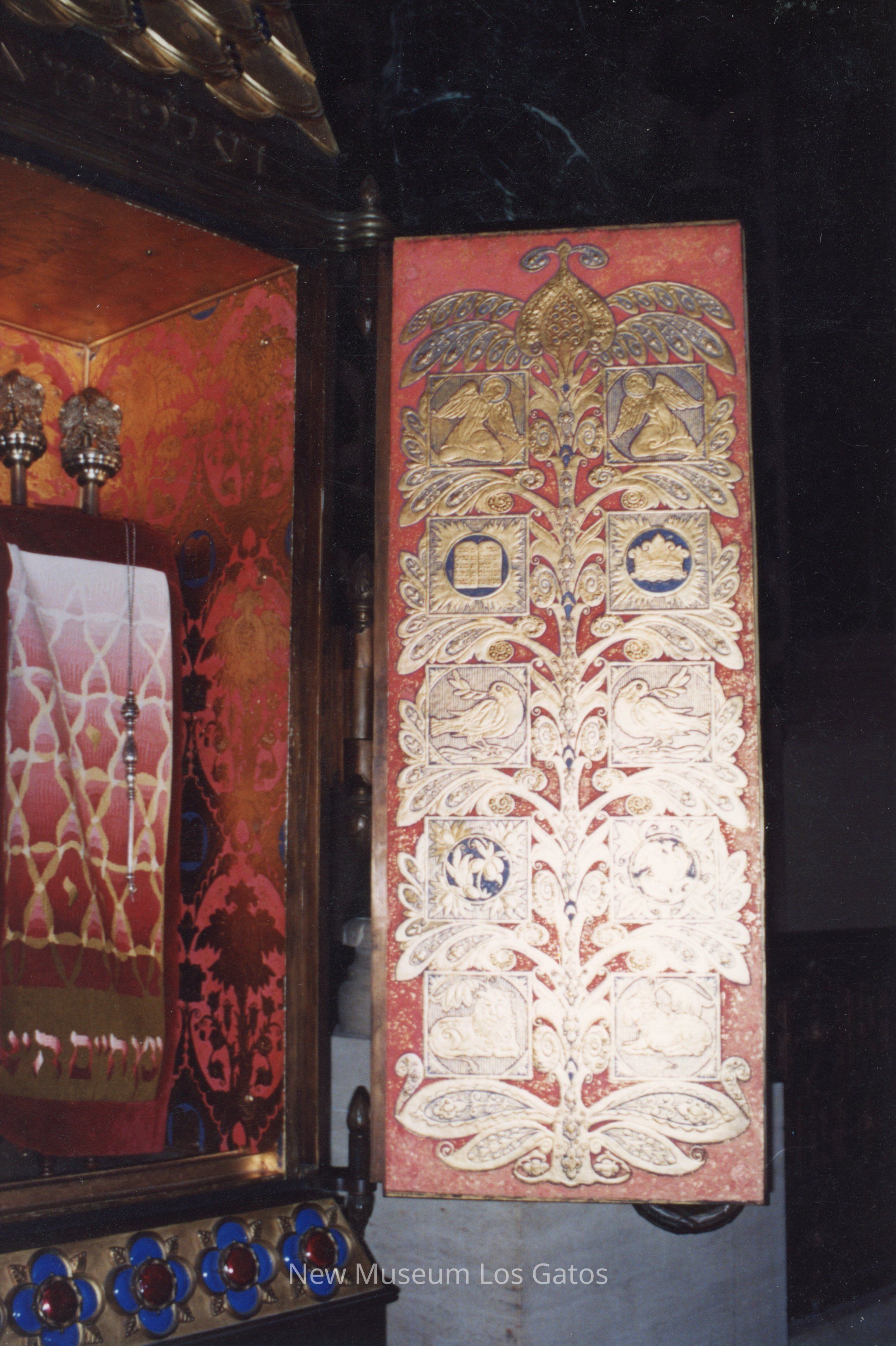 A color photograph featuring a partial view of the inside of the Ark of the Covenant. One of the doors is open, and inside is a red and gold fabric lining with silver and gold metalwork, as well as a fabric-covered Torah scroll, most likely.Photograph Details