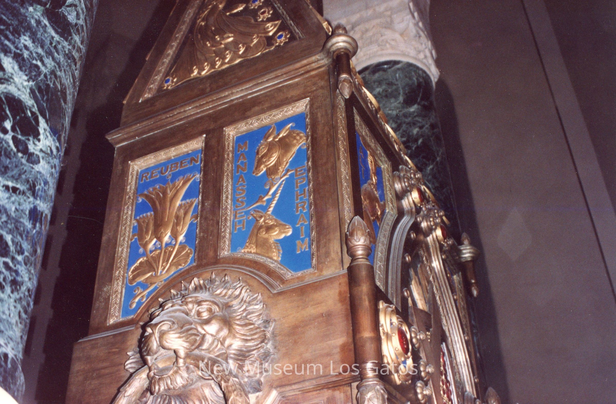 A color photograph featuring a partial view of one of the short sides of the Ark of the Covenant. The top half of the side is visible, which features the lion head in the center as well as the top two detail panels, one for Reuben and one for Manasseh and Ephraim.Photograph Details