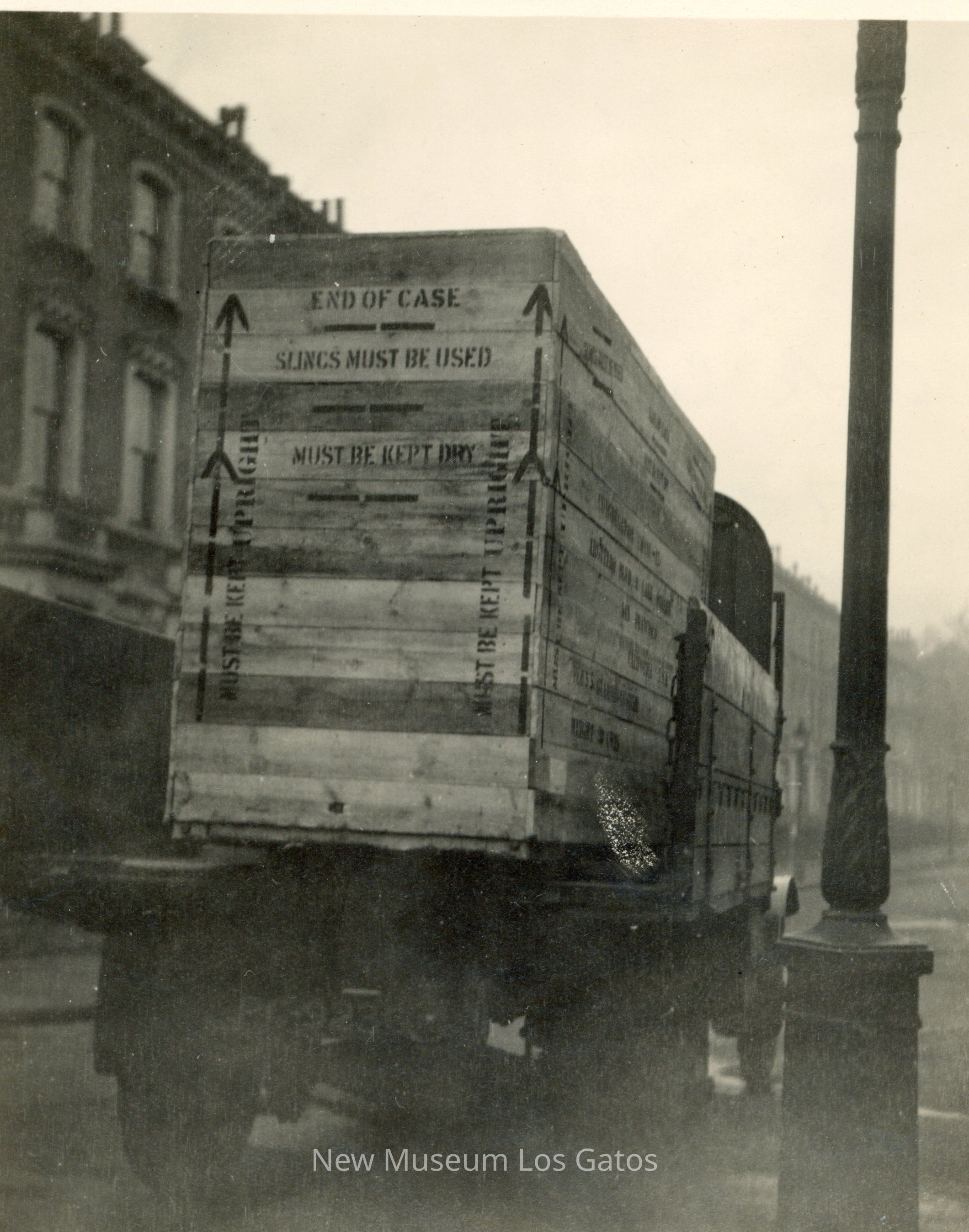 A black and white photograph of a truck transporting the Ark of the Covenant, on a street in London.Collection