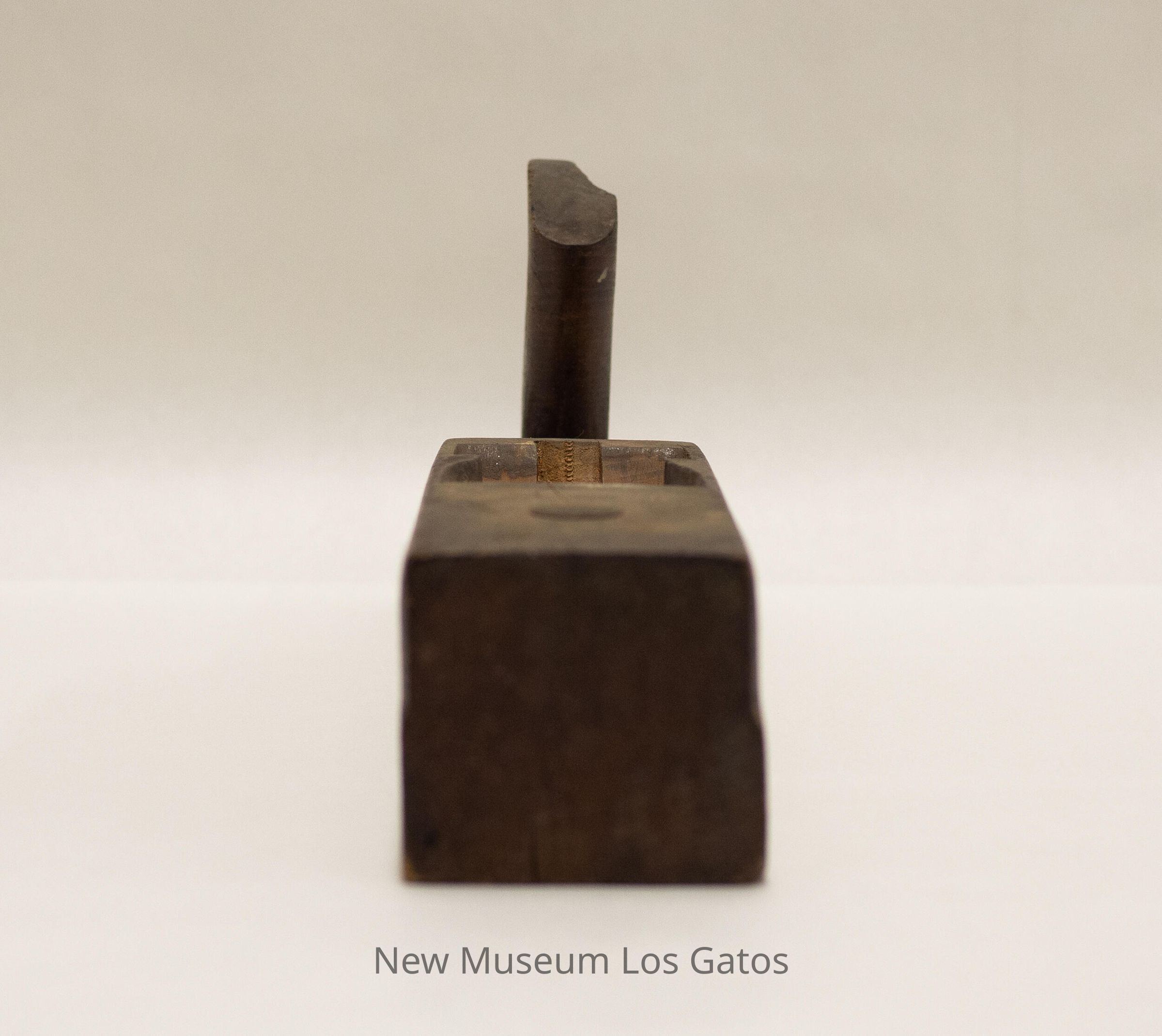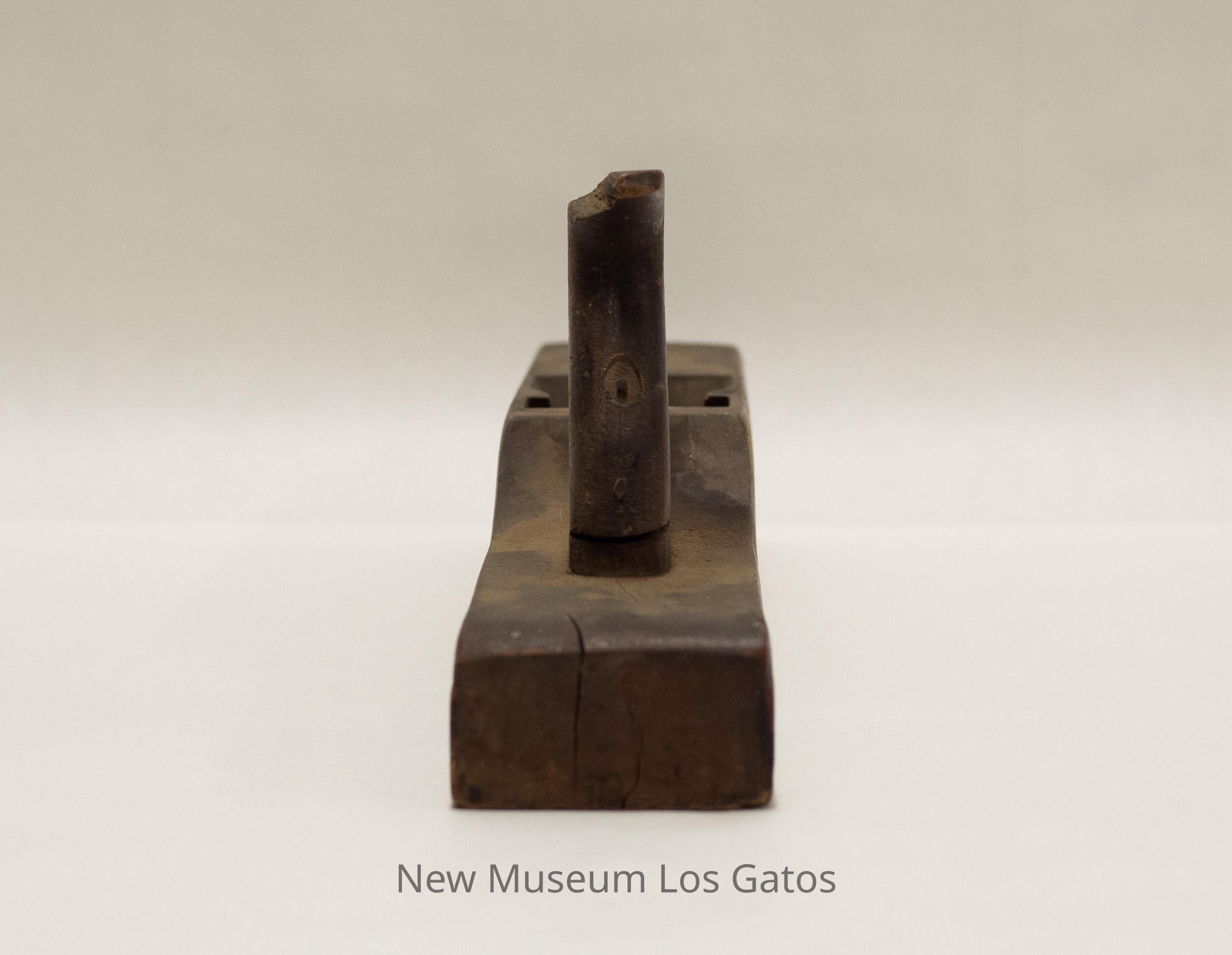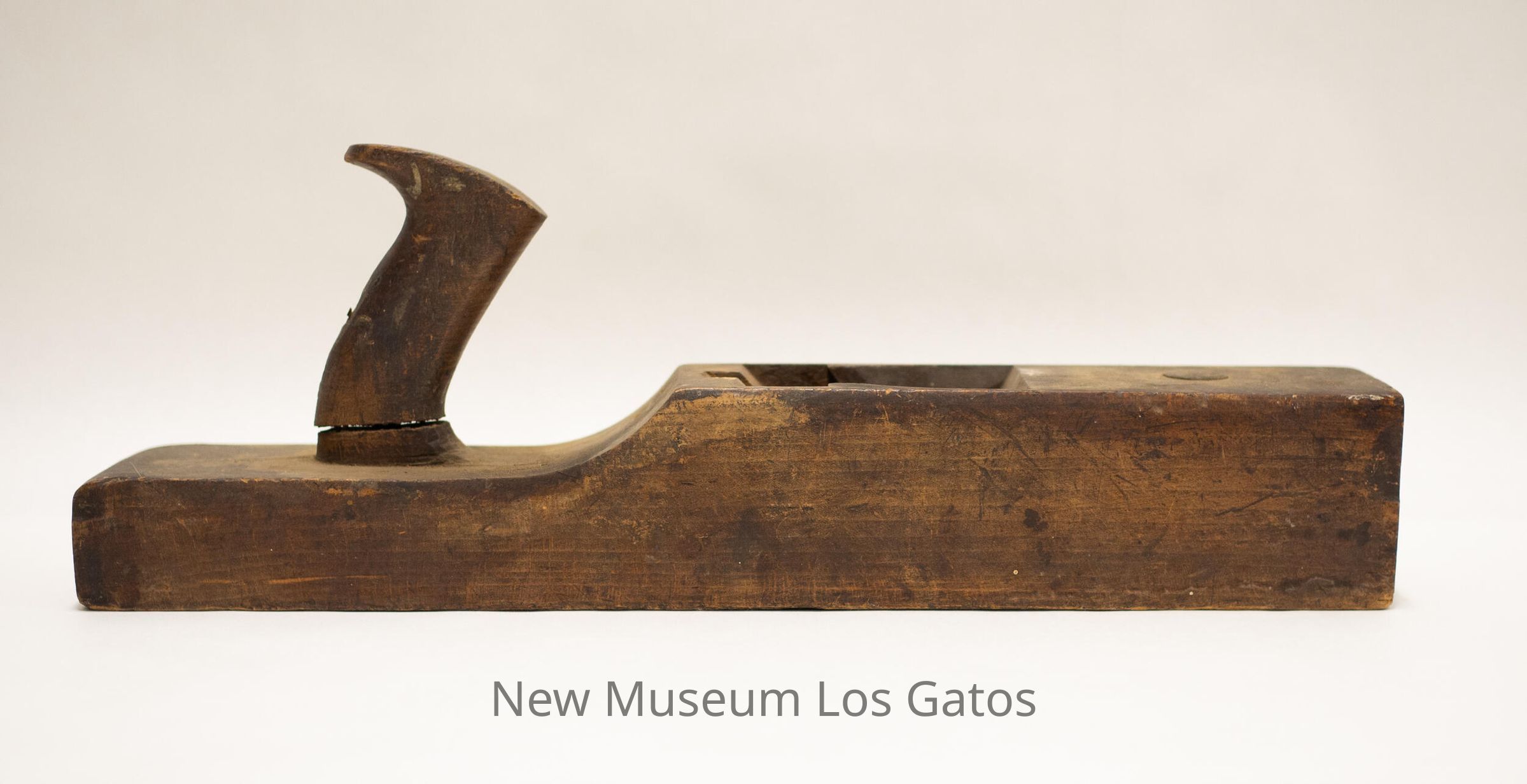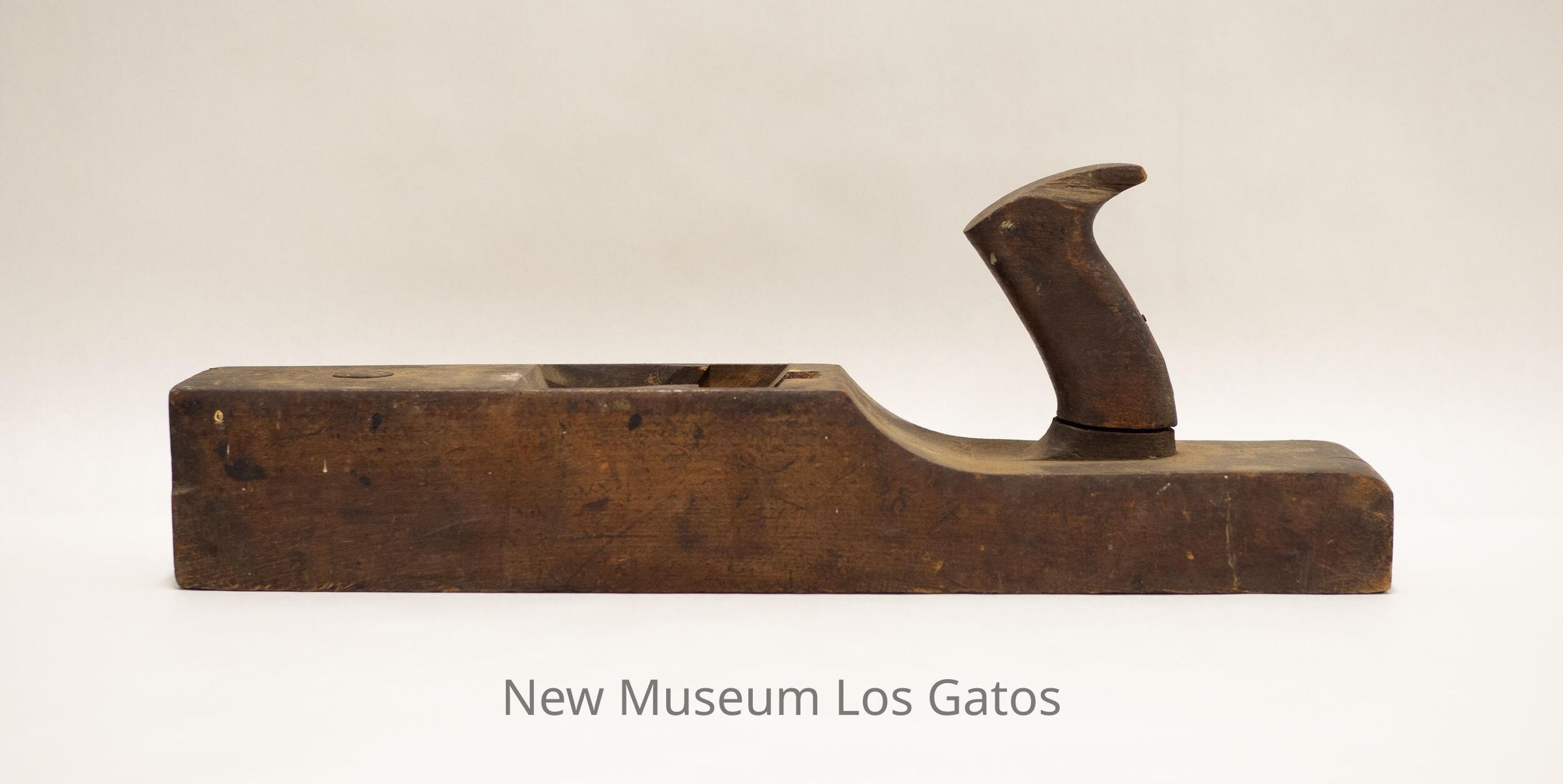 A long, antique wood plane, with a rectangular base. There is a slightly curved handle towards one end of the base, which is also thinner than the rest of the plane base. In the center of the base is a hole, with a slot where presumably the blades used to be.Collection
