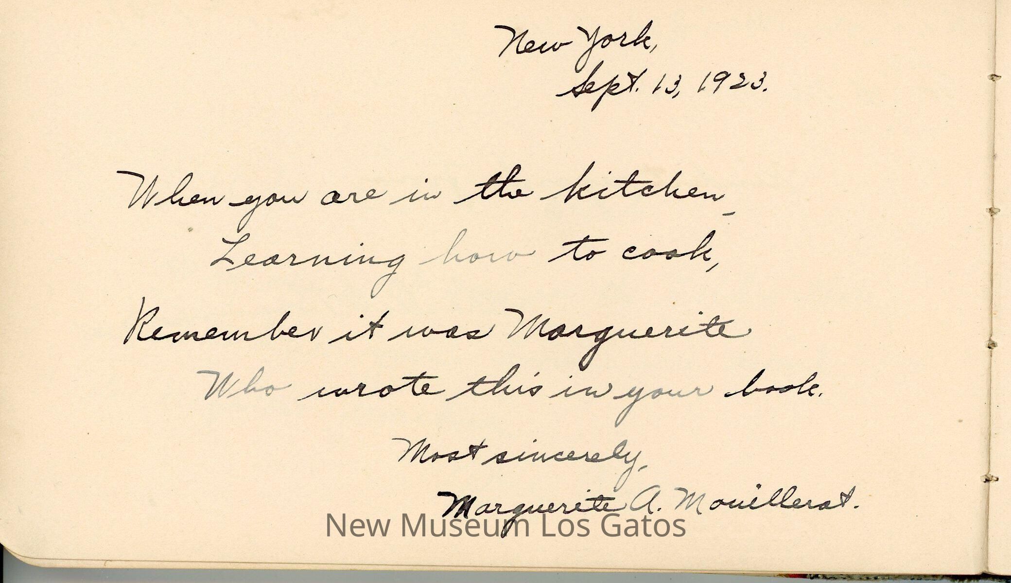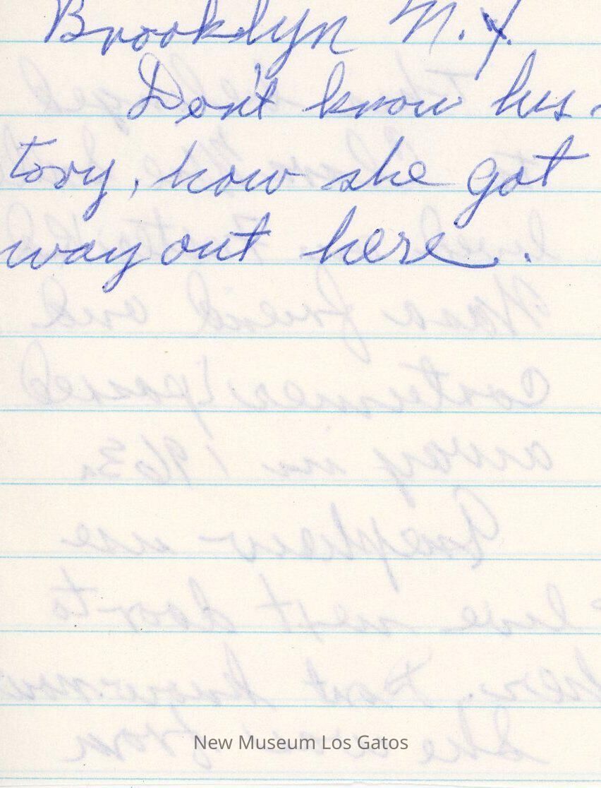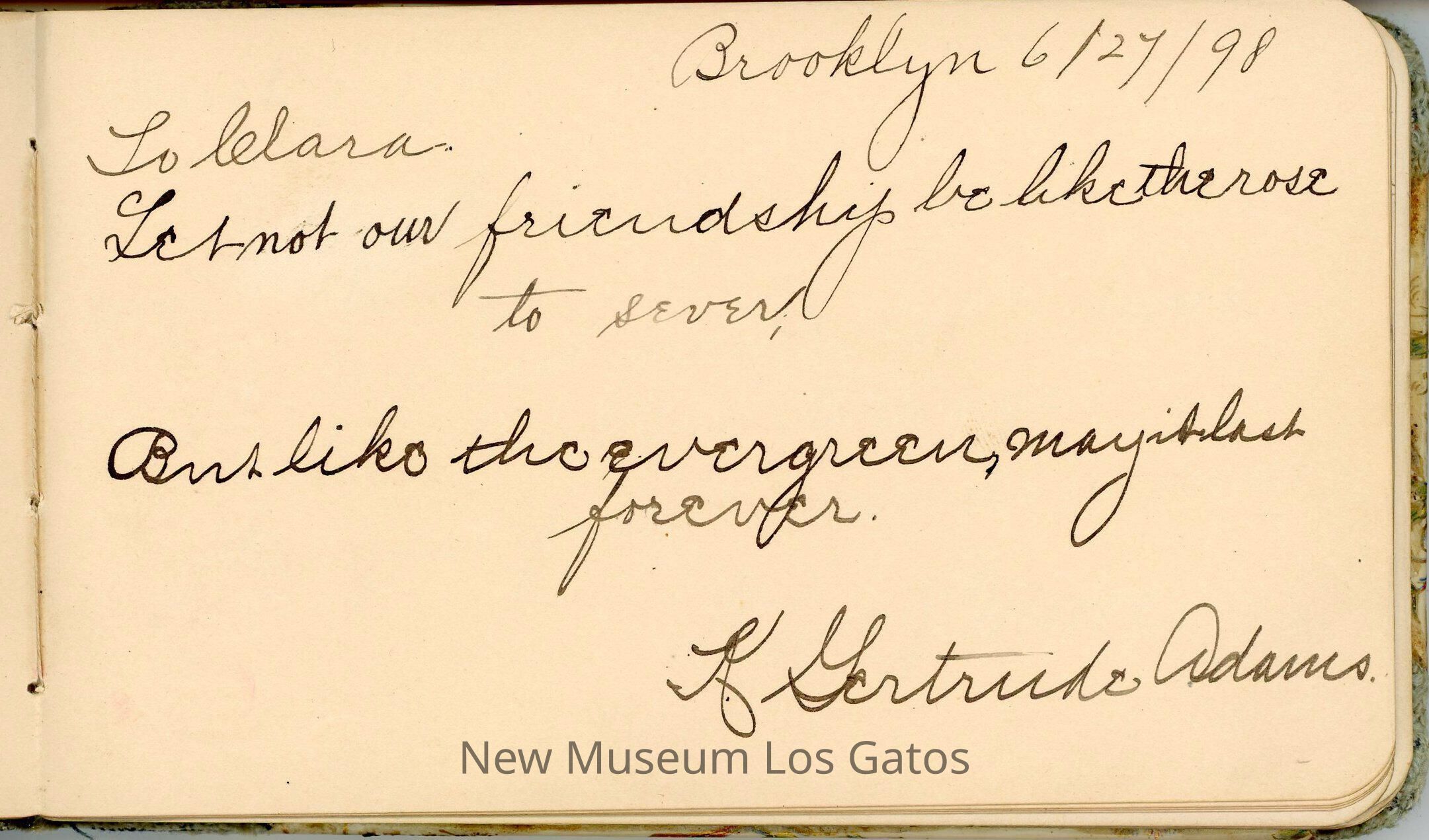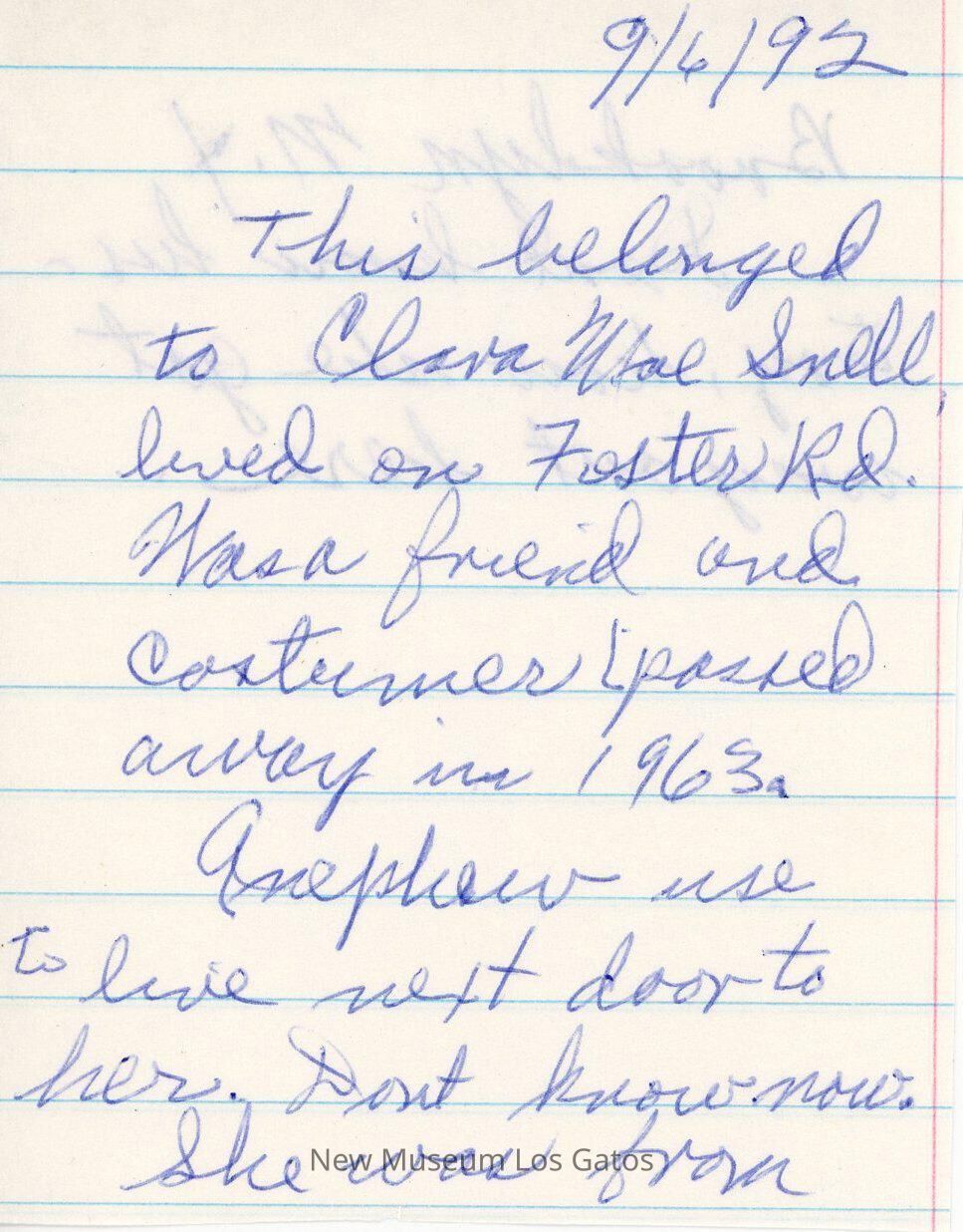 There was a note found inside the book which reads: "9/6/92 This belonged to Clara Mae Small, lived on Foster Rd. Was a friend and costumer (passed away in 1963. A nephew use to live next door to her. Don't know now. She was from Brooklyn N.Y. Don't know history, how she got way out here." There is no author for the note.