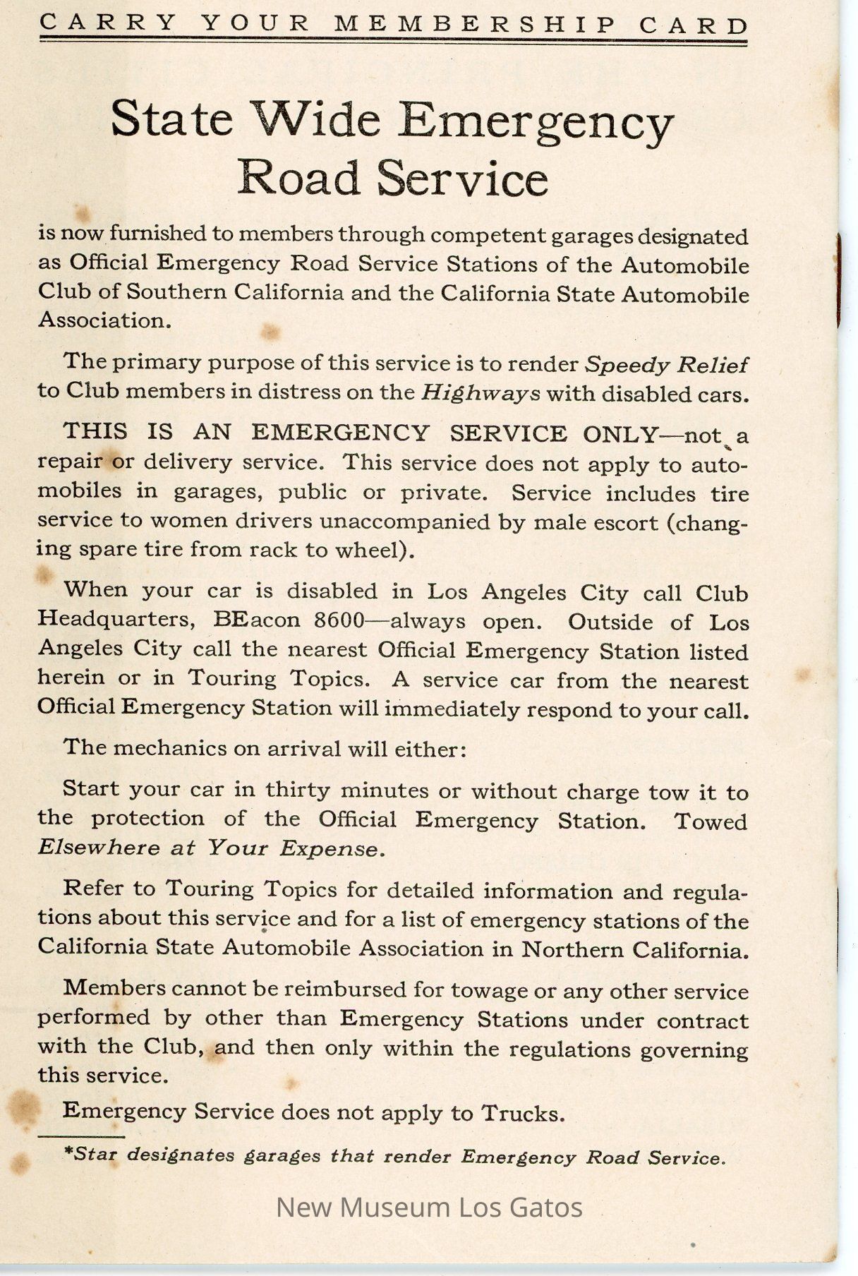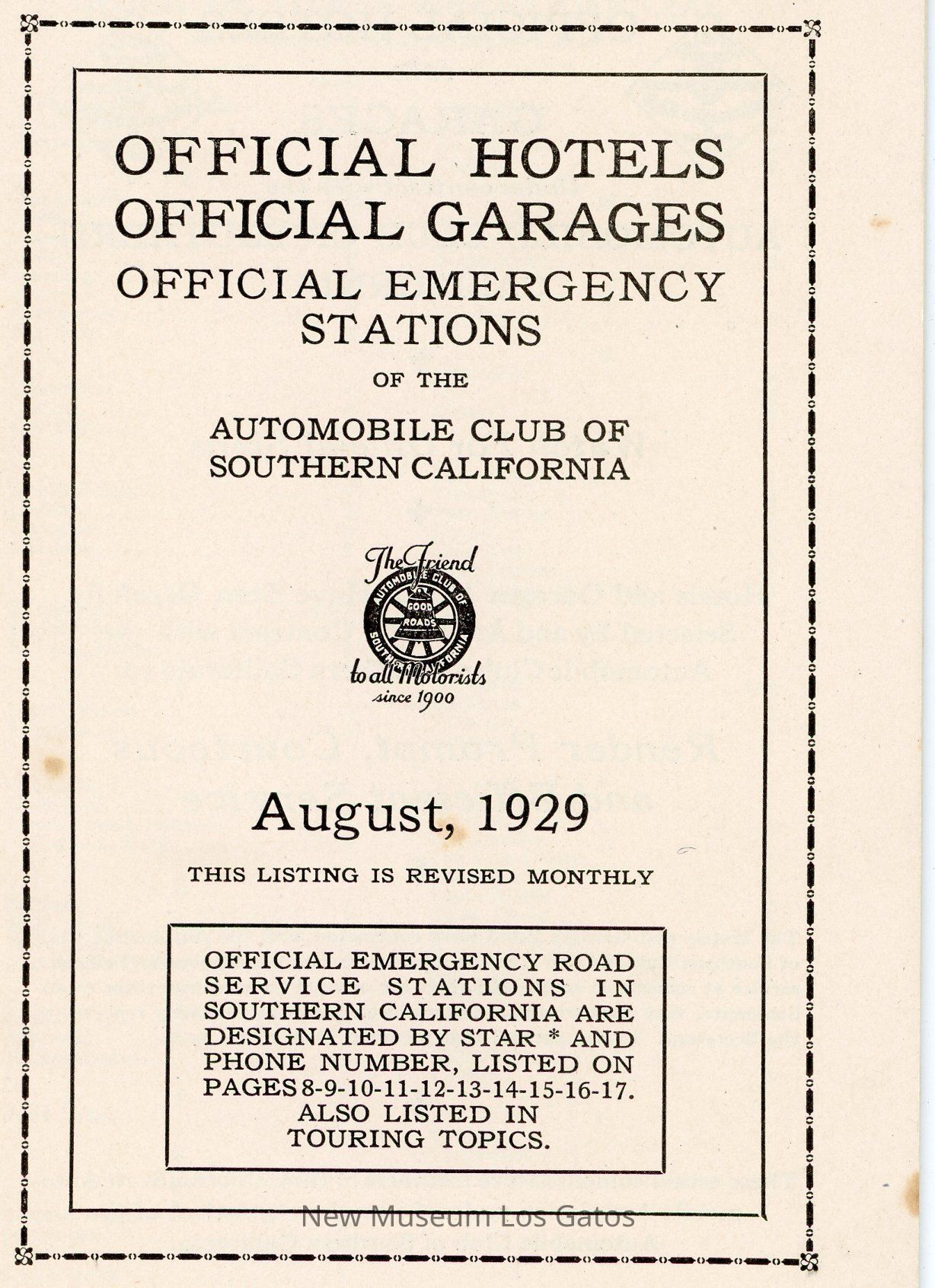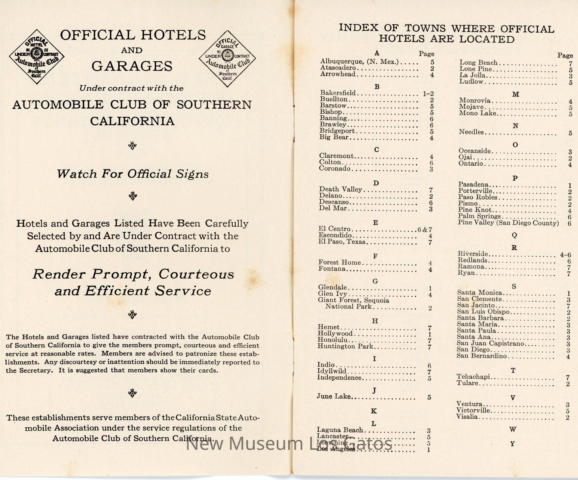 "Official Hotels Official Garages Official Emergency Stations of the Automobile Club of Southern California" guide, which lists the hotels, garages, and emergency service stations the club recommends by location.Collection