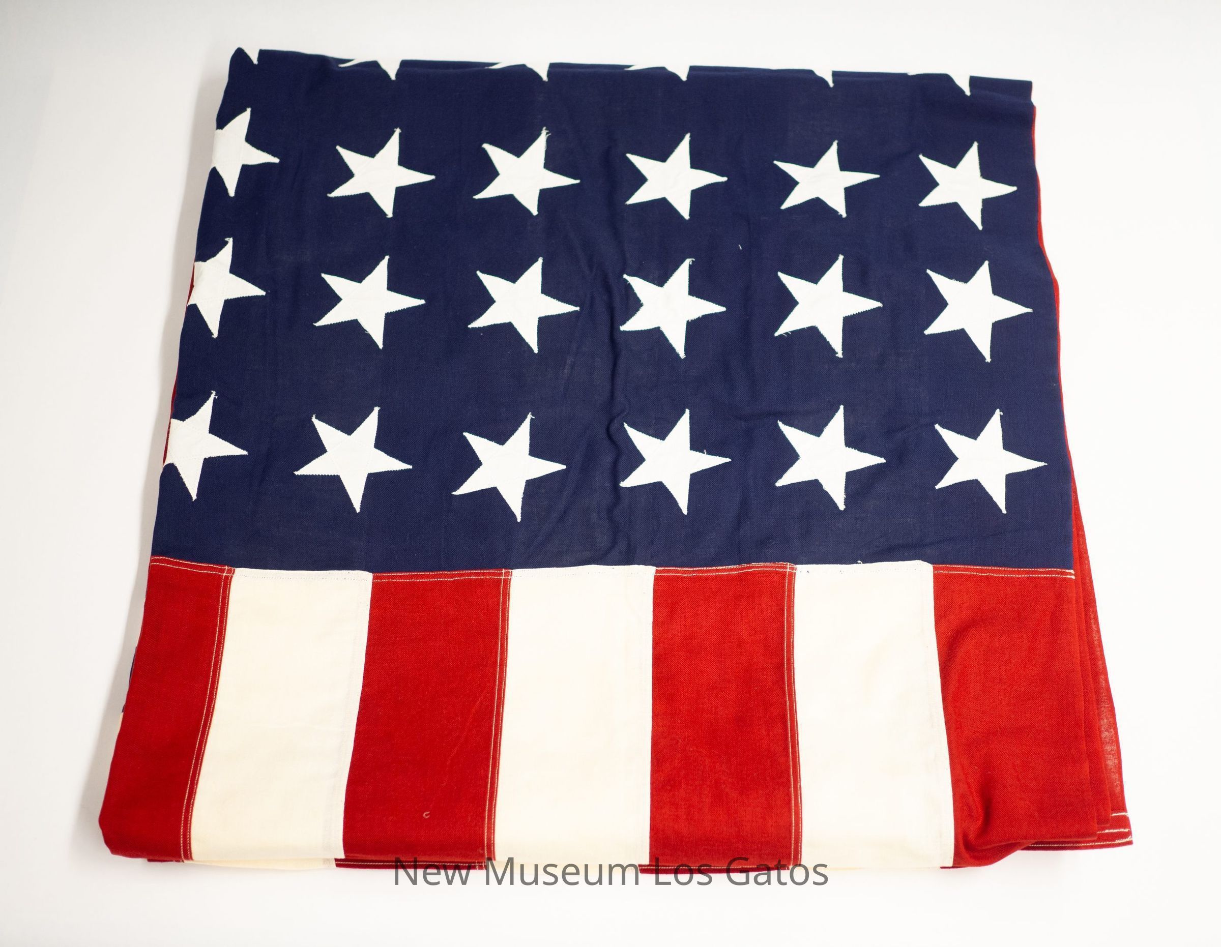 A full size, 48 star American flag. There is a white cloth strip along the left side, with two brass grommets, one at the top and one at the bottom.Collection