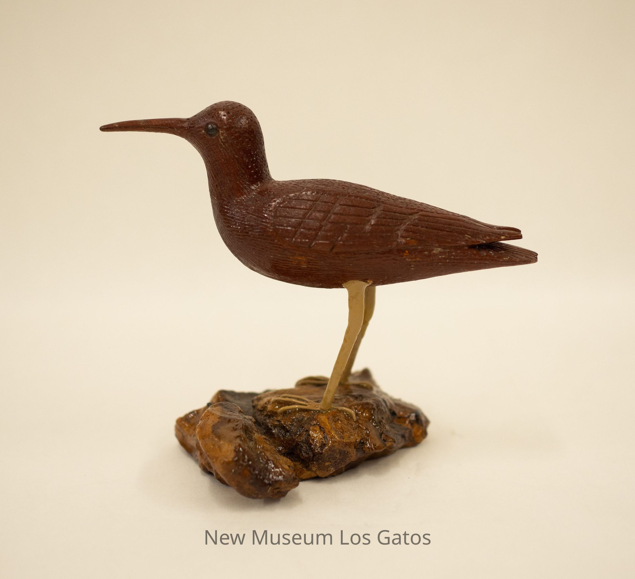 A reddish brown hand-carved wooden sculpture of a long-legged stilt. The bird is standing on an uneven wooden base.