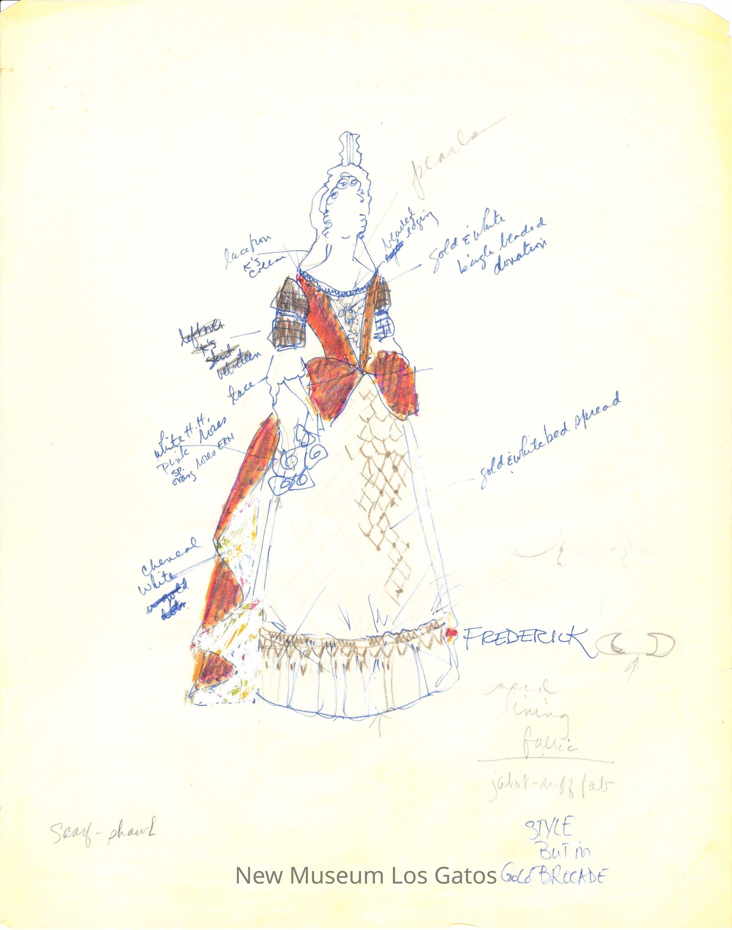Eleven pages of various preliminary costume renderings with notes, measurements, and thoughts for the 1975-76 California Actors Theatre production of "The Imaginary Invalid." The drawings are on large, semi-translucent pieces of paper.Type of Drawing