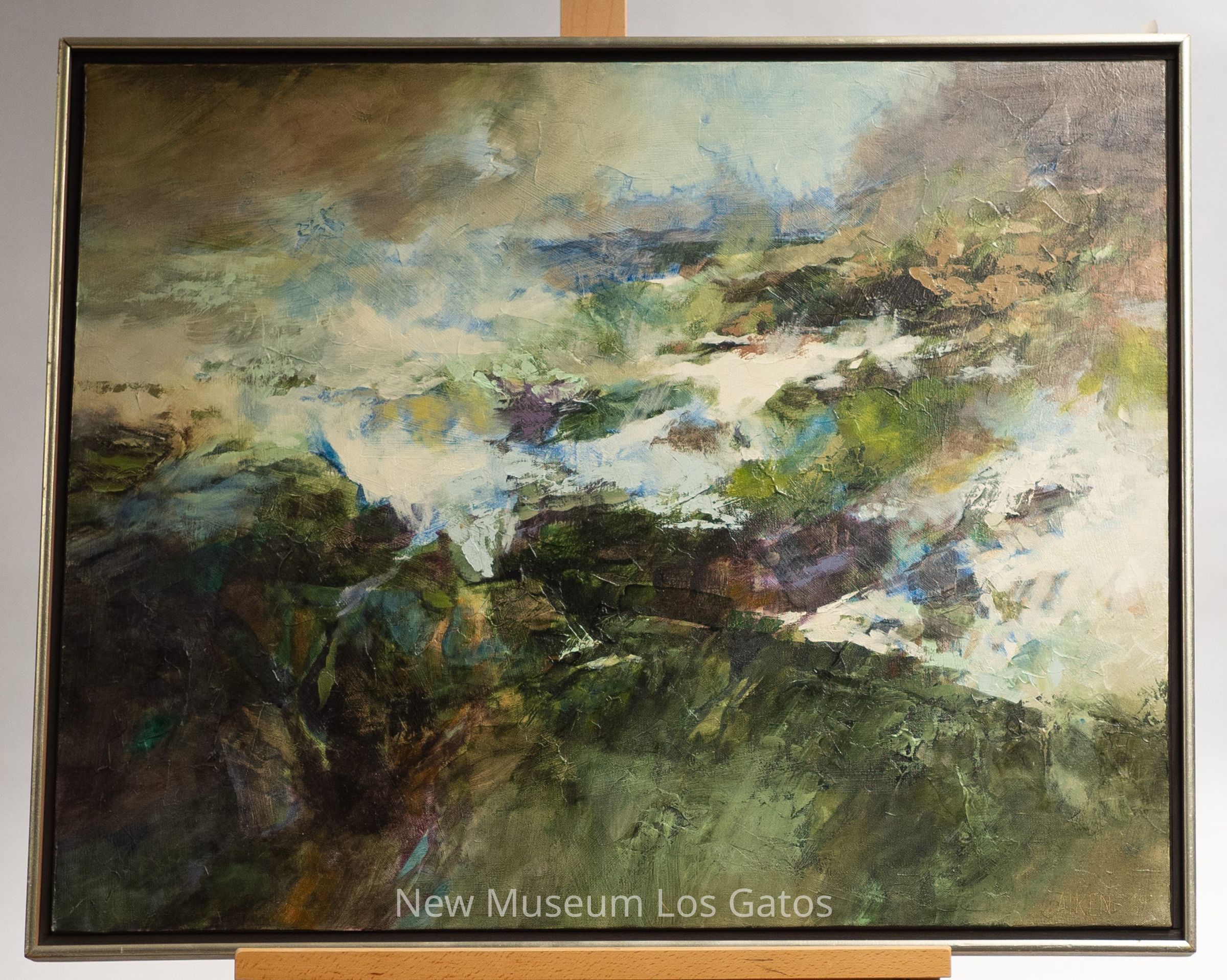 An oil painting of an abstracted seascape. The painting is inside of a thin wooden frame, painted silver.Type of Painting