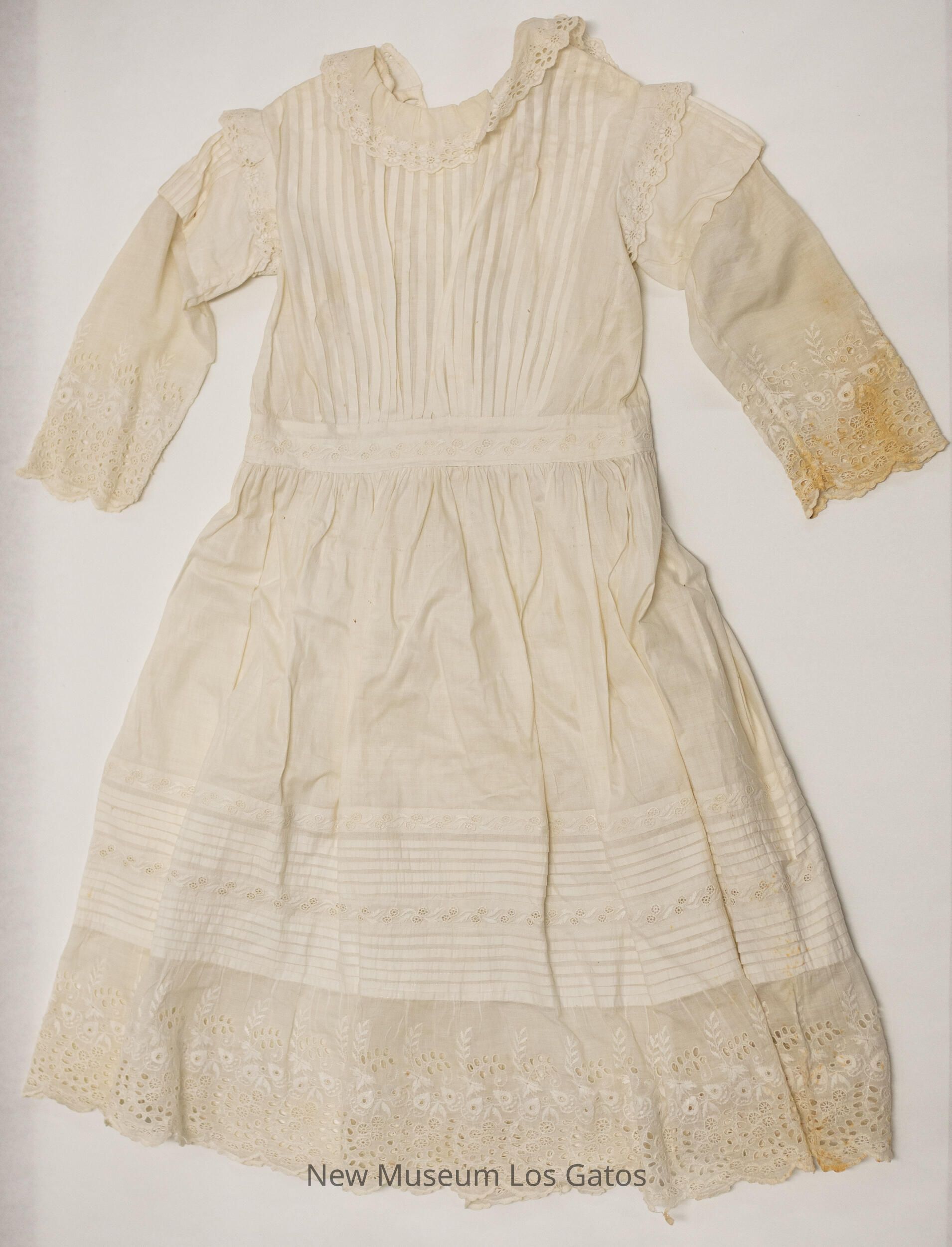 A small, white batiste dress. There is floral embroidery and eyelet detailing along the bottom of the dress, the bottom of the sleeves, the edge of the collar, and vertically along the shoulders. There are vertical, tucked stripe details on the bodice of the dress, and horizontally along the bottom section of the dress. There is also a decorative embroidered pattern of stars inside circles, with feathers that can be found on three horizontal bands: one at the waist, and the other two with the horizontal tucked stripes. The dress opens up at the back, and closes with nine small, white iridescent buttons.Collection