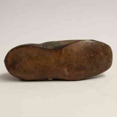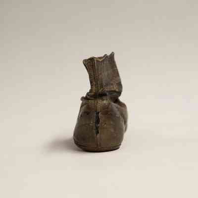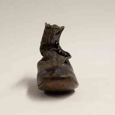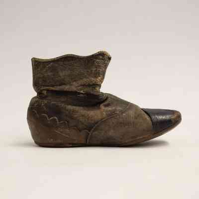 A single small, black leather children's boot, for the left foot. The boot has three black buttons running up the outer side, for opening and closing the boot.Collection