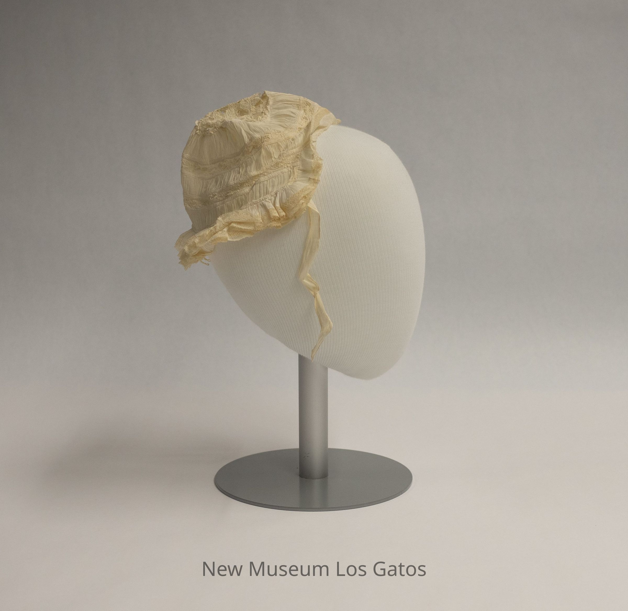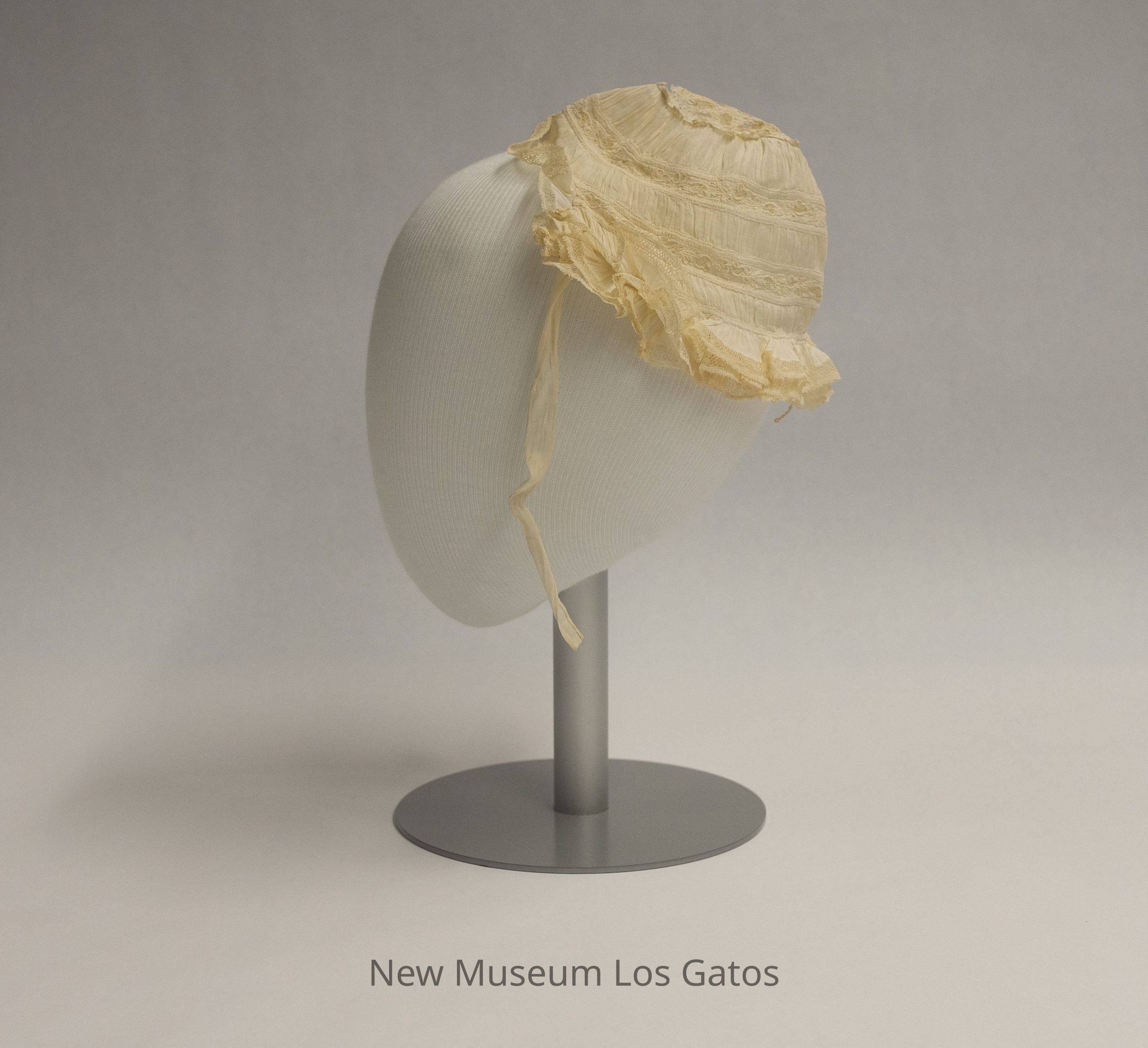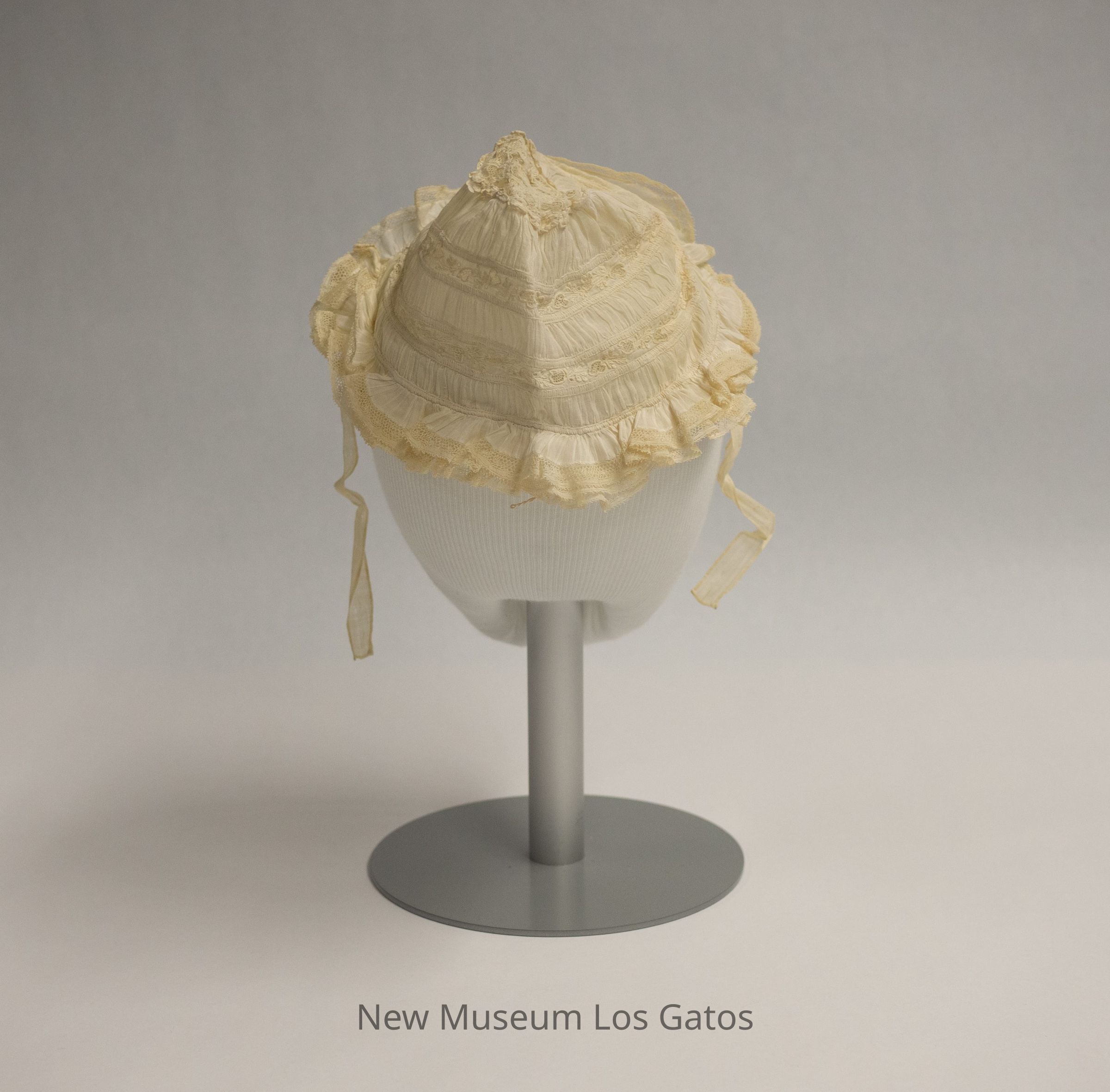 A white batiste baby bonnet, with lace trim and insets. There is a circle with inset lace shapes at the crown, with alternating bands of ruching and floral embroidery throughout the bonnet. There are three layers of fabric at the edge, each trimmed with netting. The bonnet has two ties, on opposite sides from each other.