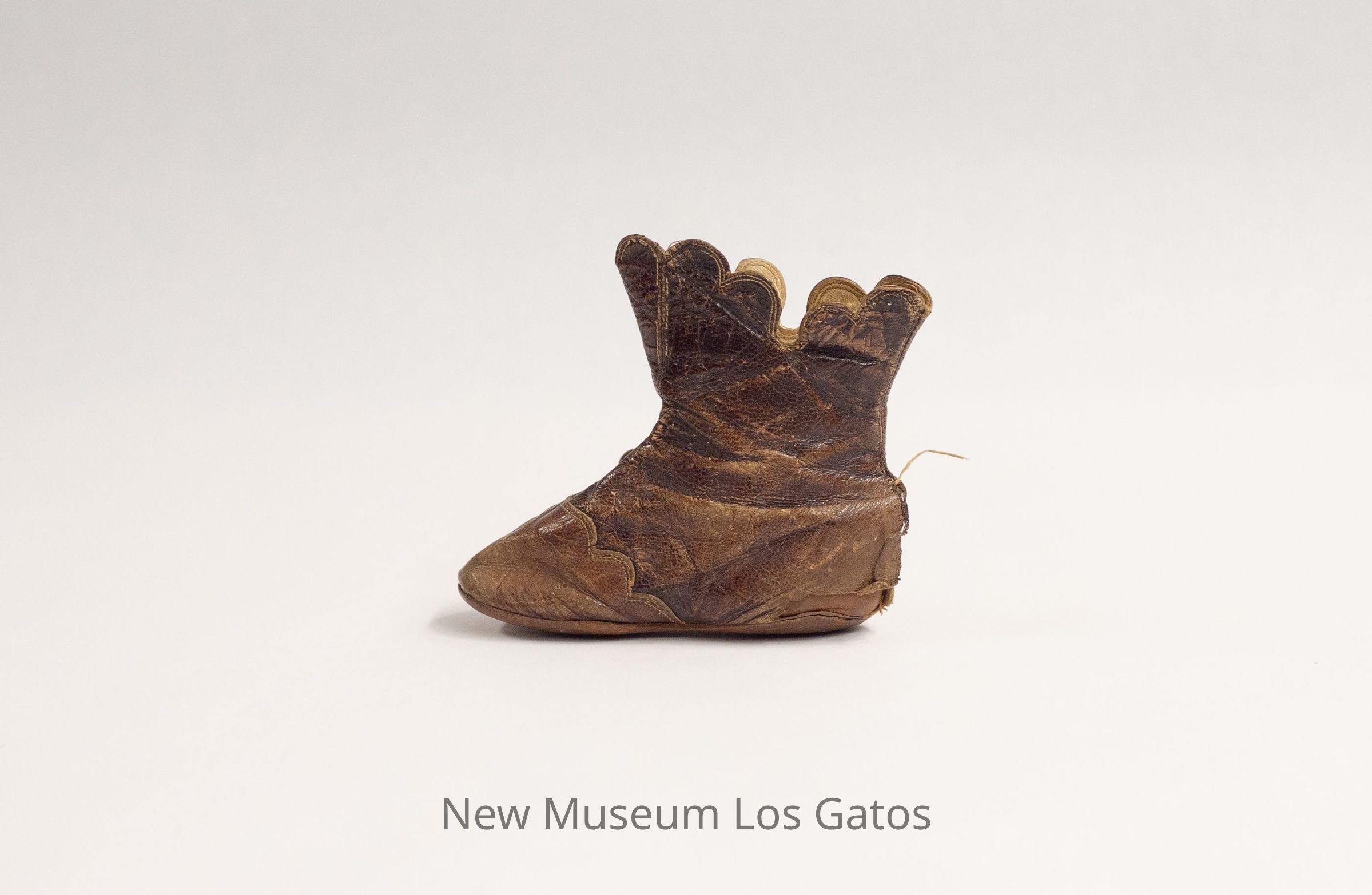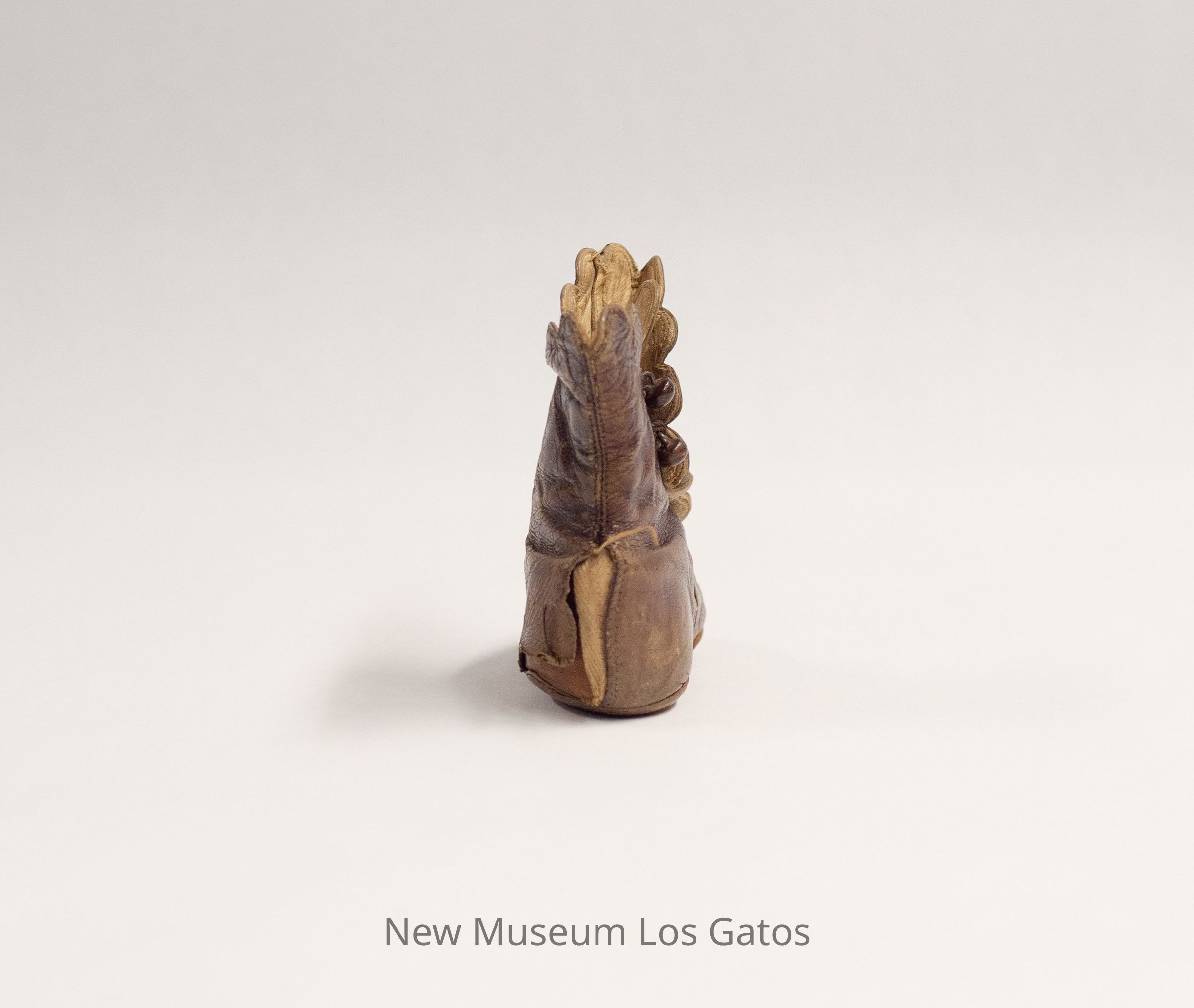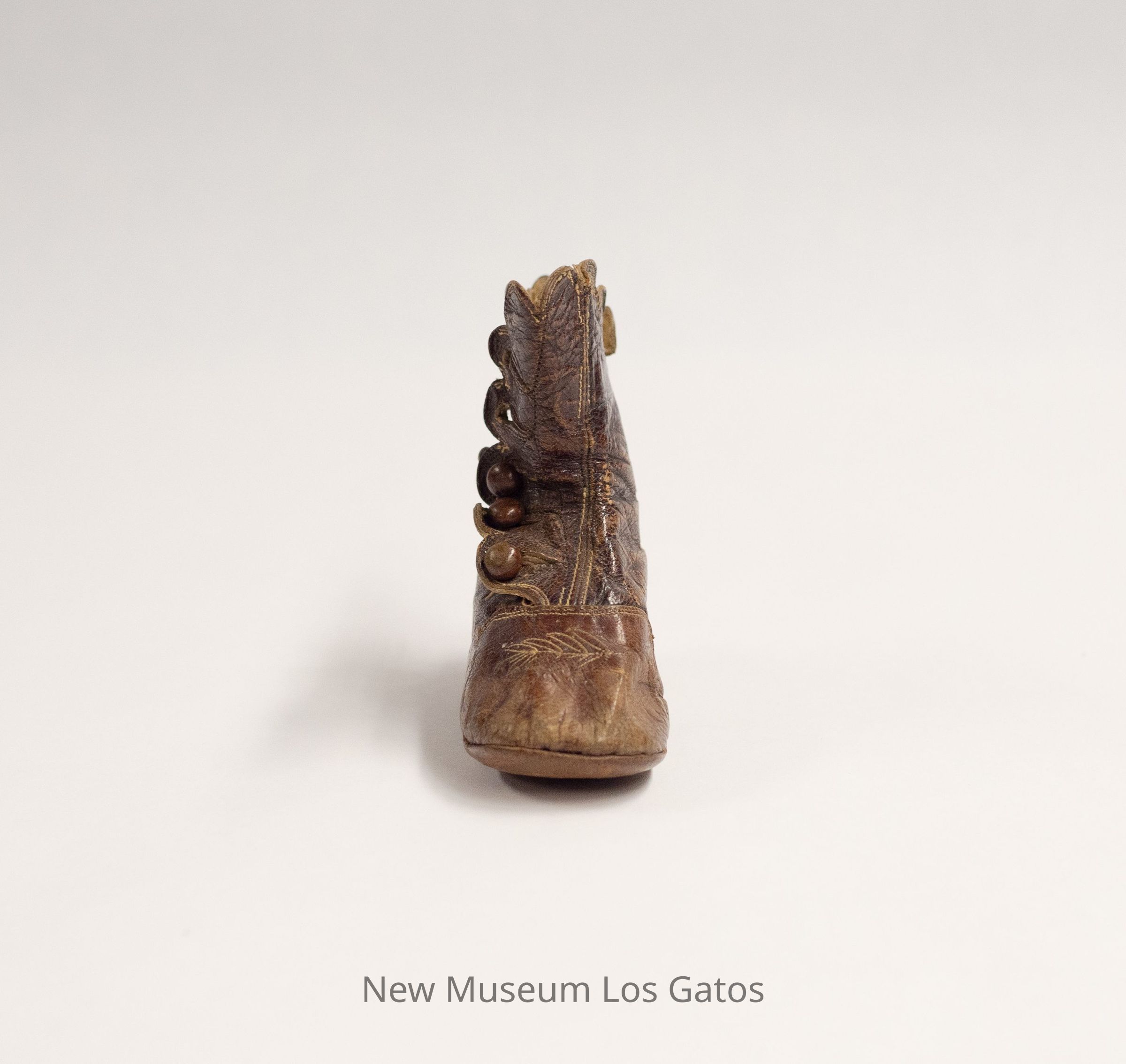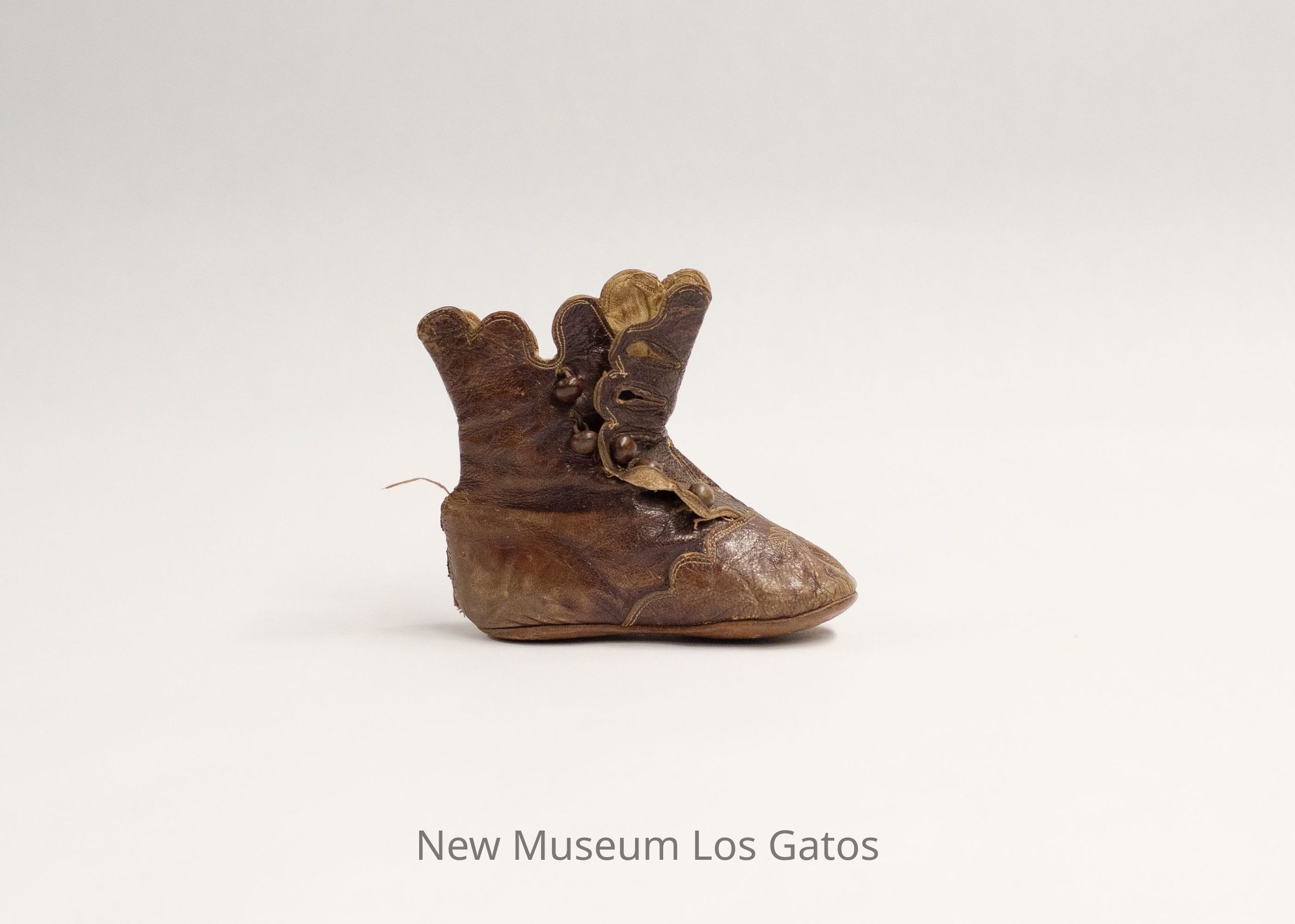 A single brown leather baby's boot, for the right foot. The interior of the boot is white. There are five brown buttons running along the exterior side of the boot. The toe features decorative leaf stitching.Collection