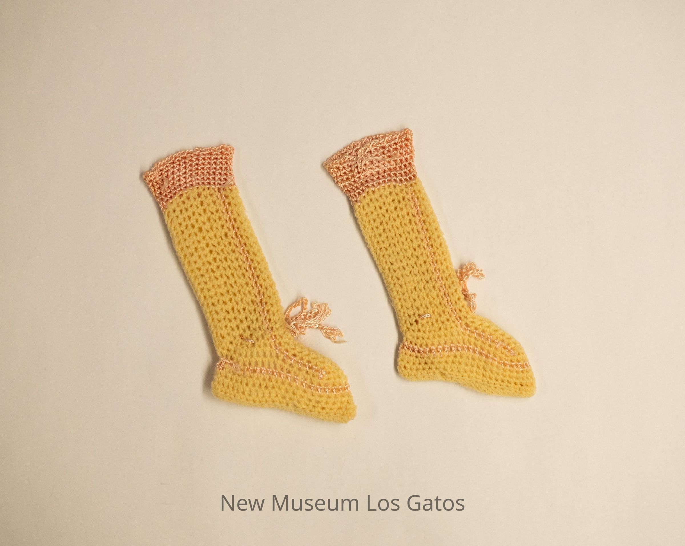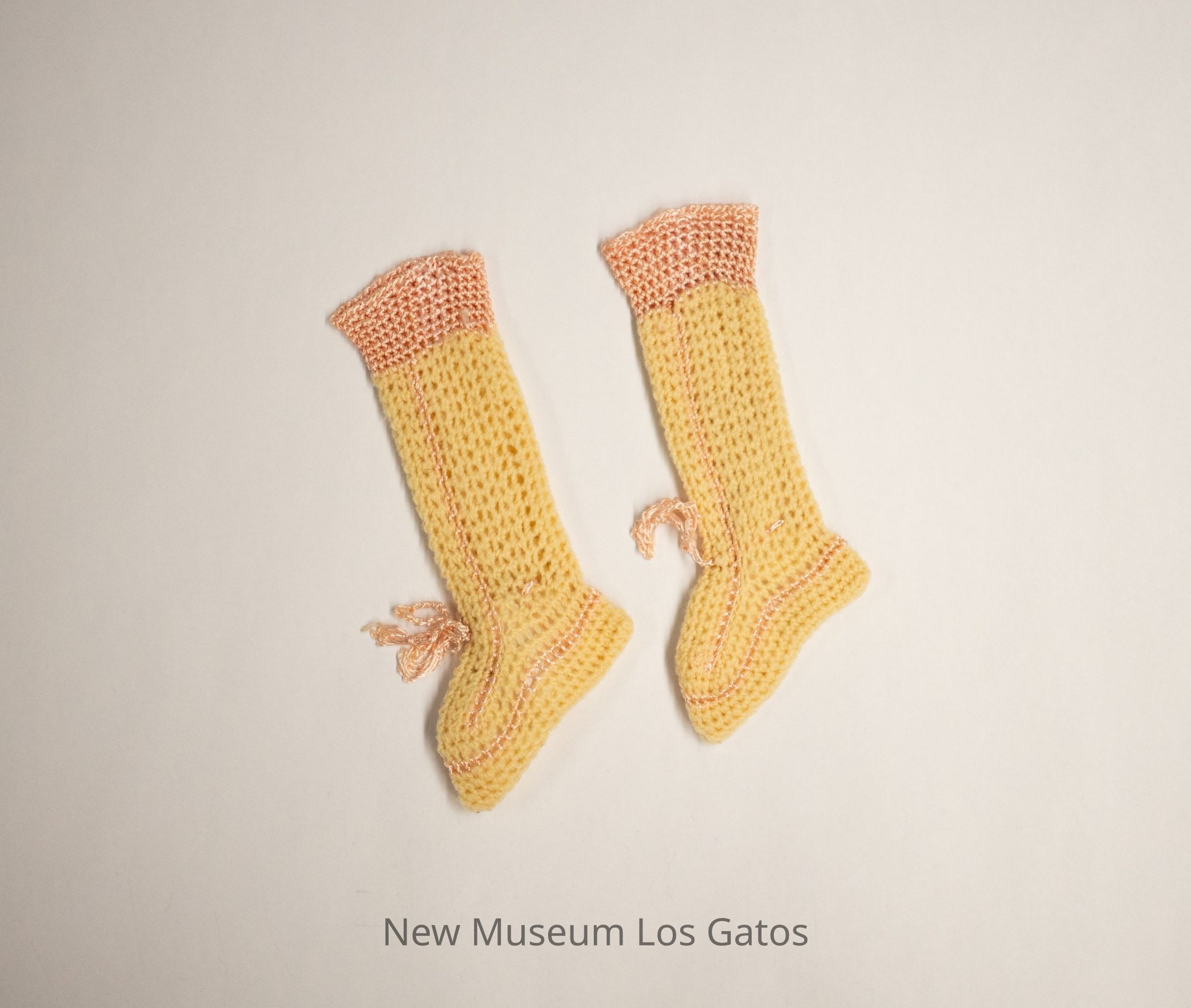 A pair of cream-colored crocheted baby bootees, with pink detailing. The tops of the bootees are made out of shiny pink thread, and there are two vertical shiny pink lines down the front, as well as two horizontal shiny pink lines across the foot. There is also a shiny pink bow on the front of each bootee, where the foot section meets the leg section.Collection