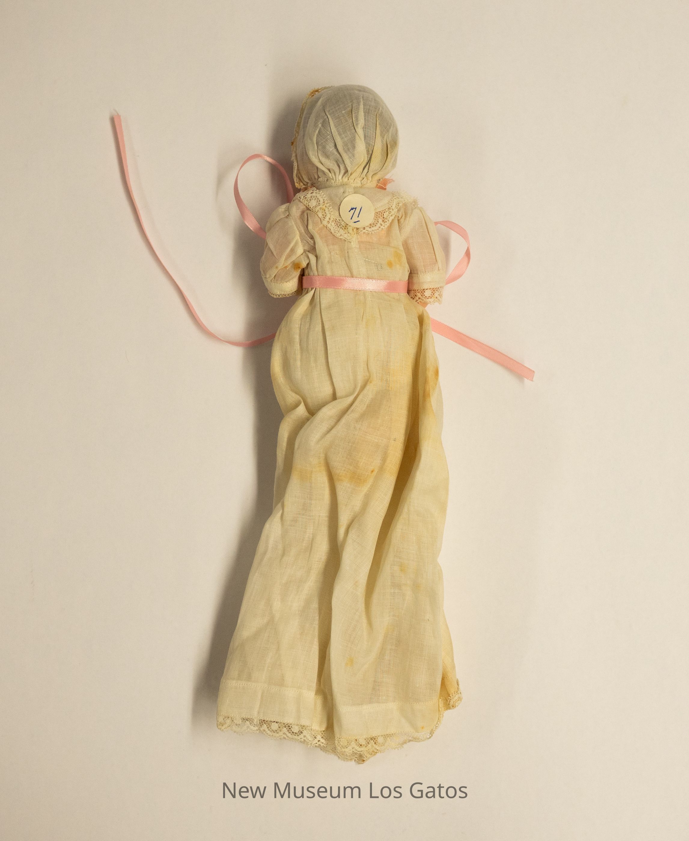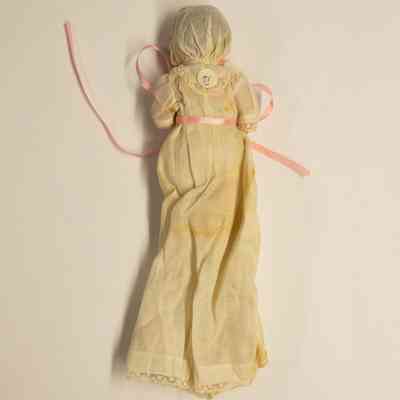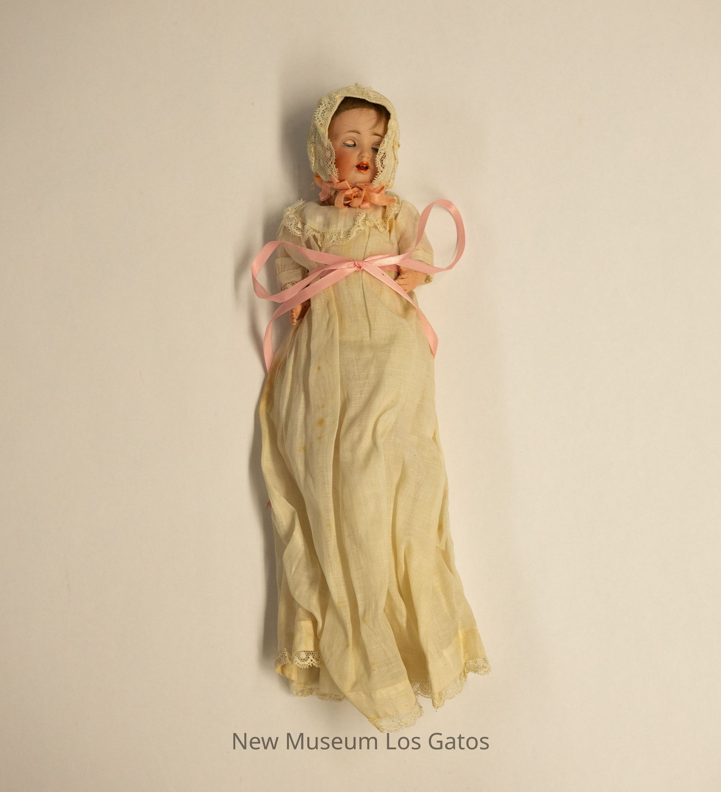 A bisque baby doll. The doll is wearing a long white christening dress with lace trim along the hem, the sleeves, and the neckline, with a pink ribbon tied around the waist. The baby is also wearing a white bonnet with lace trim. The doll's eyes open and close as it is raised and lowered.Collection
