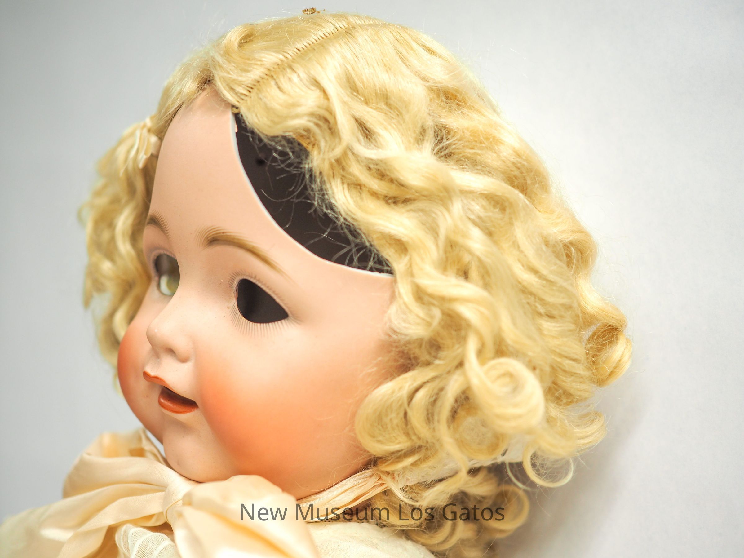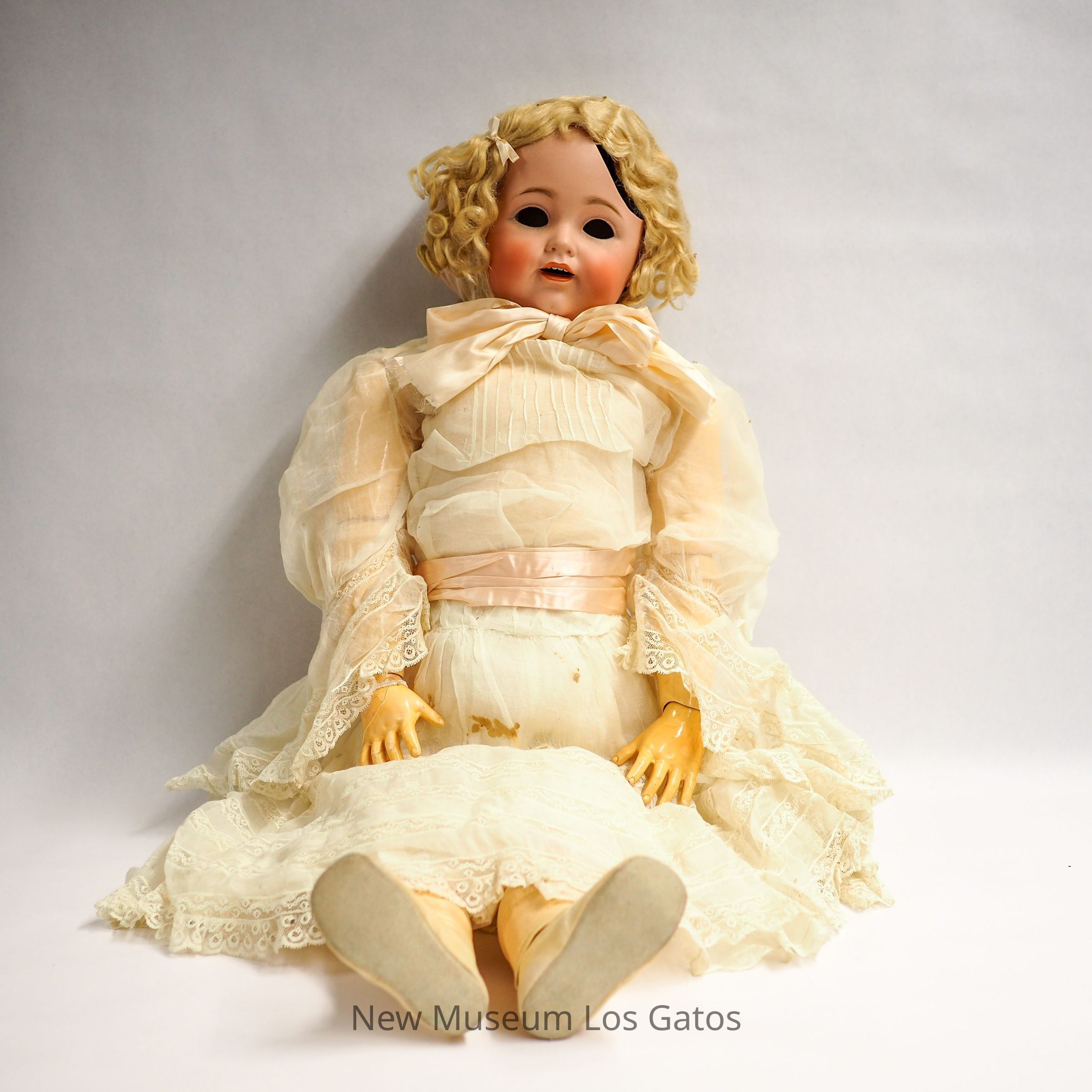 A large female baby doll with curly blonde hair and brown eyes. The doll wears a bonnet, and an off-white dress with a lace trim and light pink ribbon. In addition there are shoes, stockings, and a beaded bracelet. This doll's head is badly damaged due to a past fall.Collection