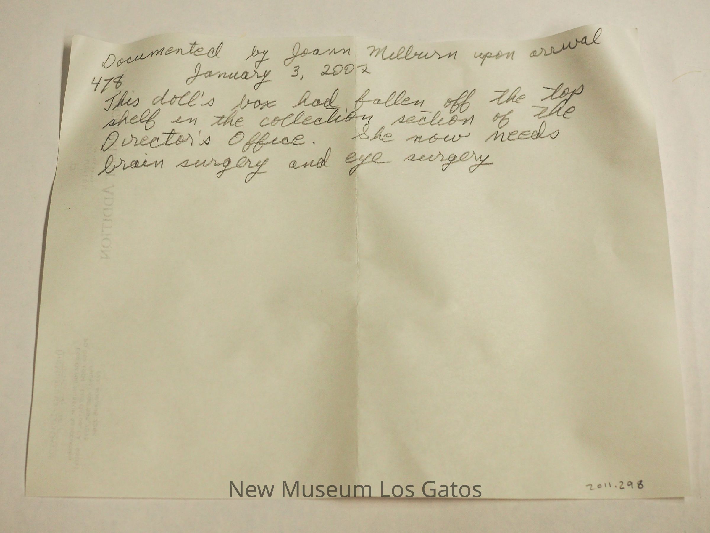 Transcription of folded note describing damageTranscription