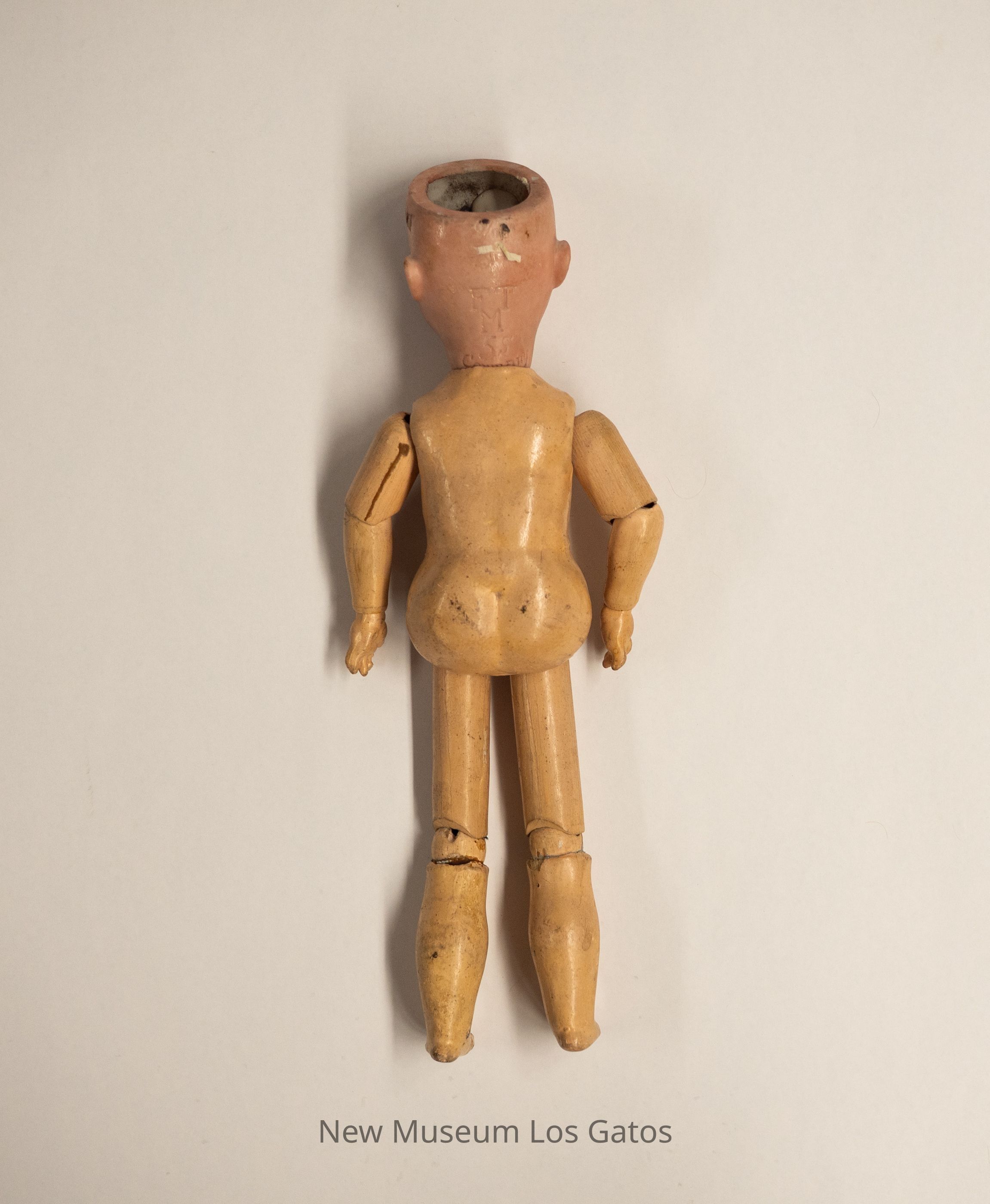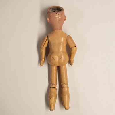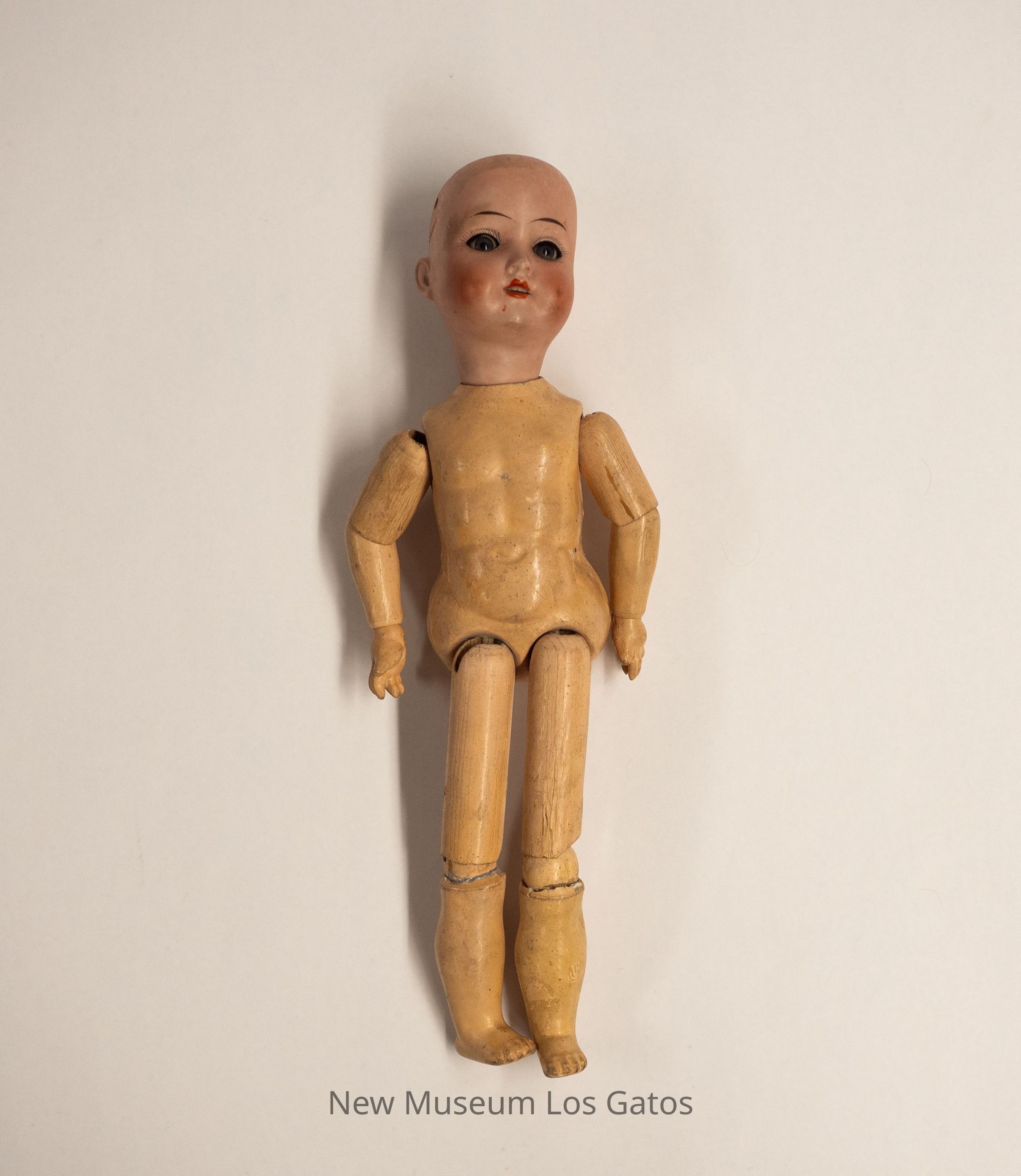 A bisque, composite, and wooden baby doll. The doll is undressed, and its arms and legs are moveable at the joints. The doll's face is painted on, and it has gray eyes. It is missing whatever hair it once had.Collection