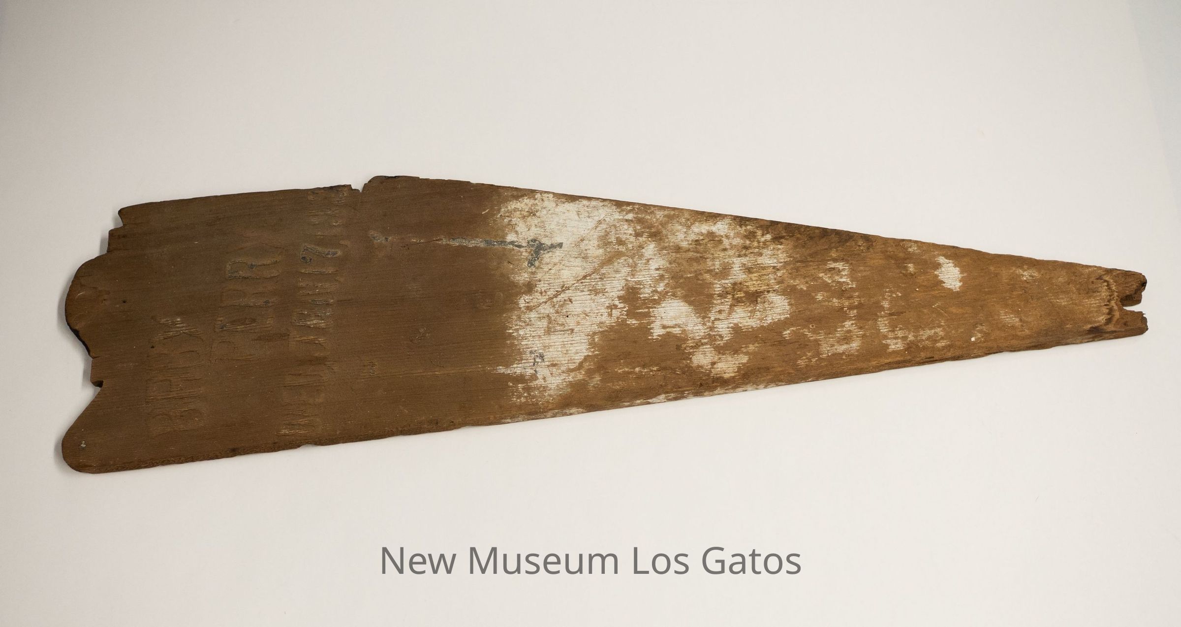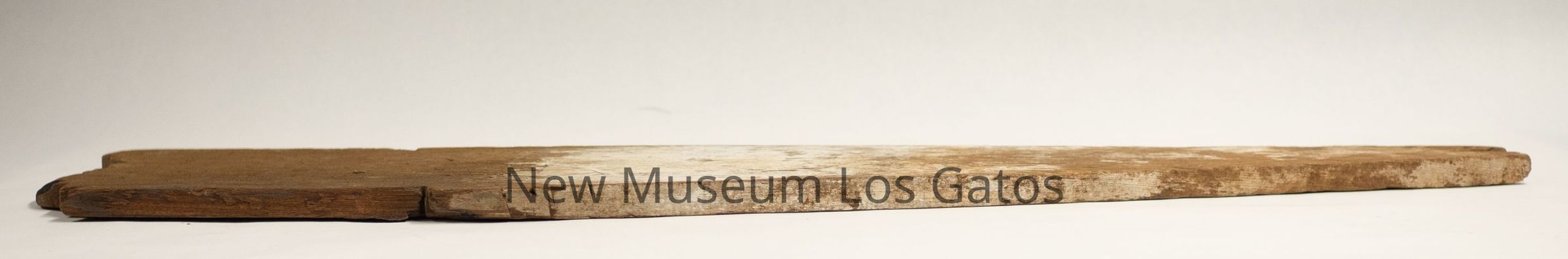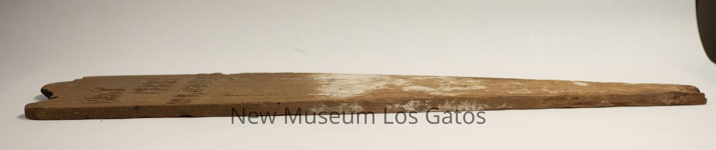 A partial wooden headstone, for a Baby Perry. The wood is vaguely triangular, and is wider at the top and tapers to a point at the bottom. There is a raised inscription at the top.Collection