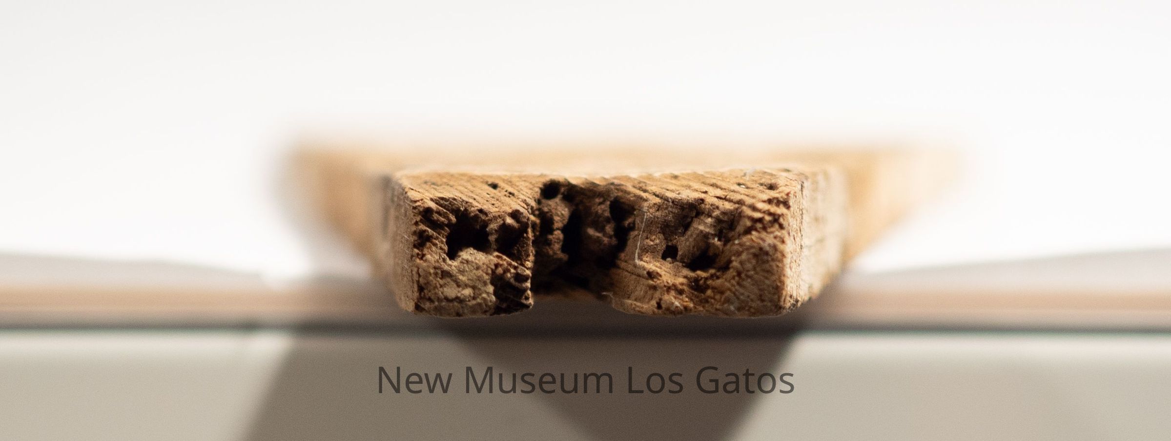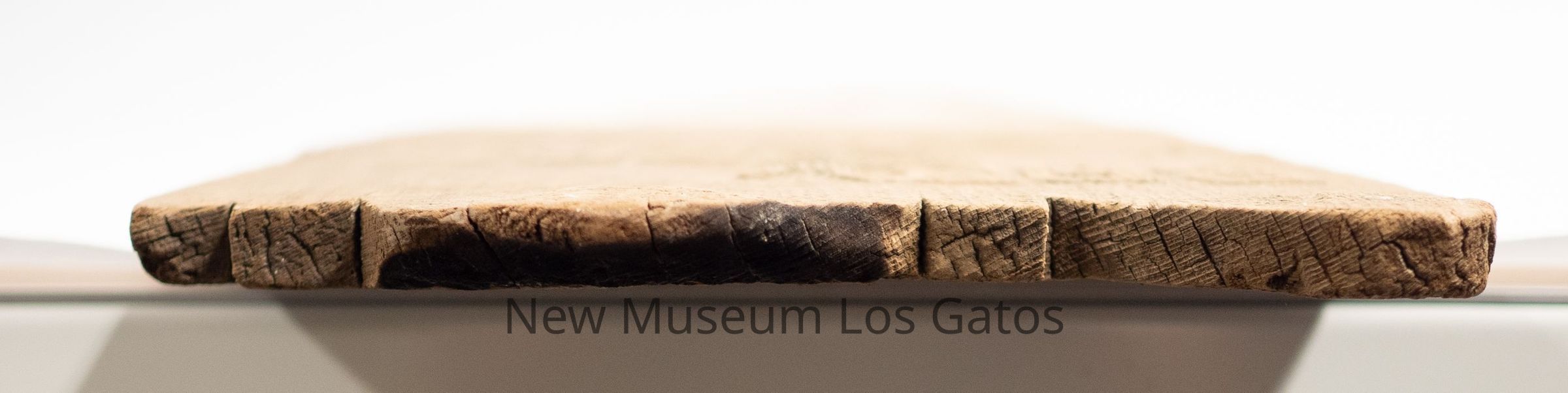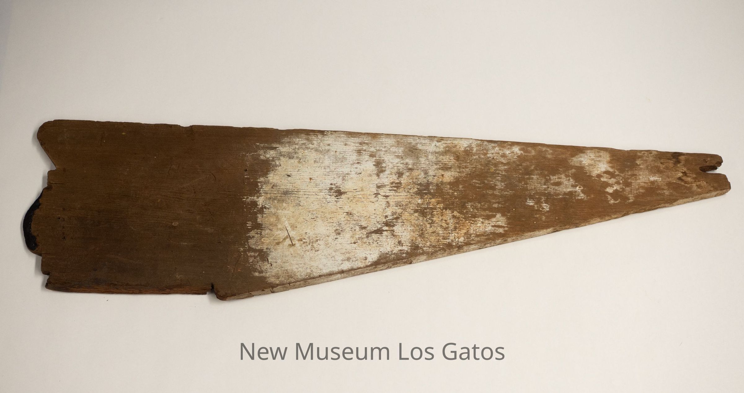 A partial wooden headstone, for a Baby Perry. The wood is vaguely triangular, and is wider at the top and tapers to a point at the bottom. There is a raised inscription at the top.Collection