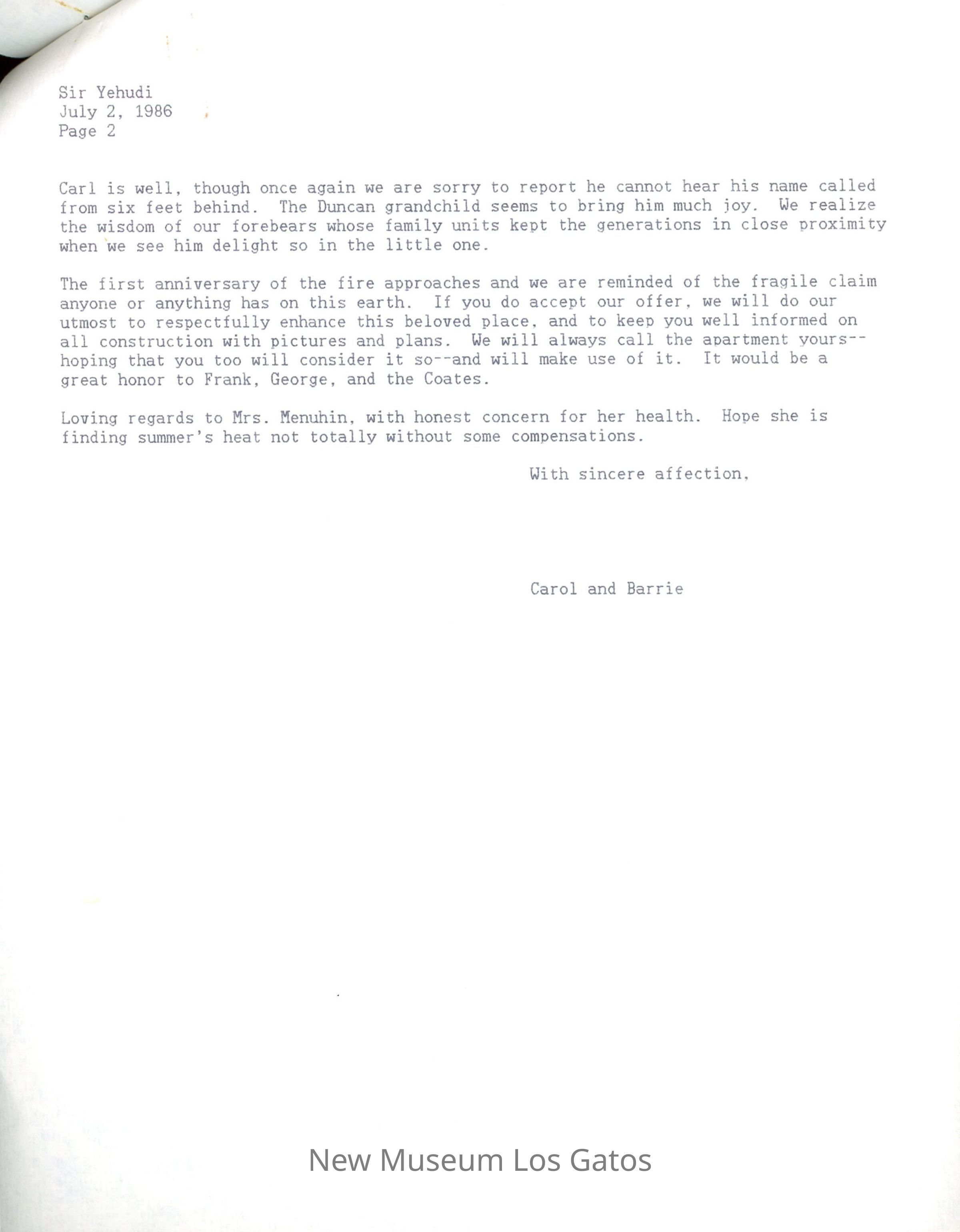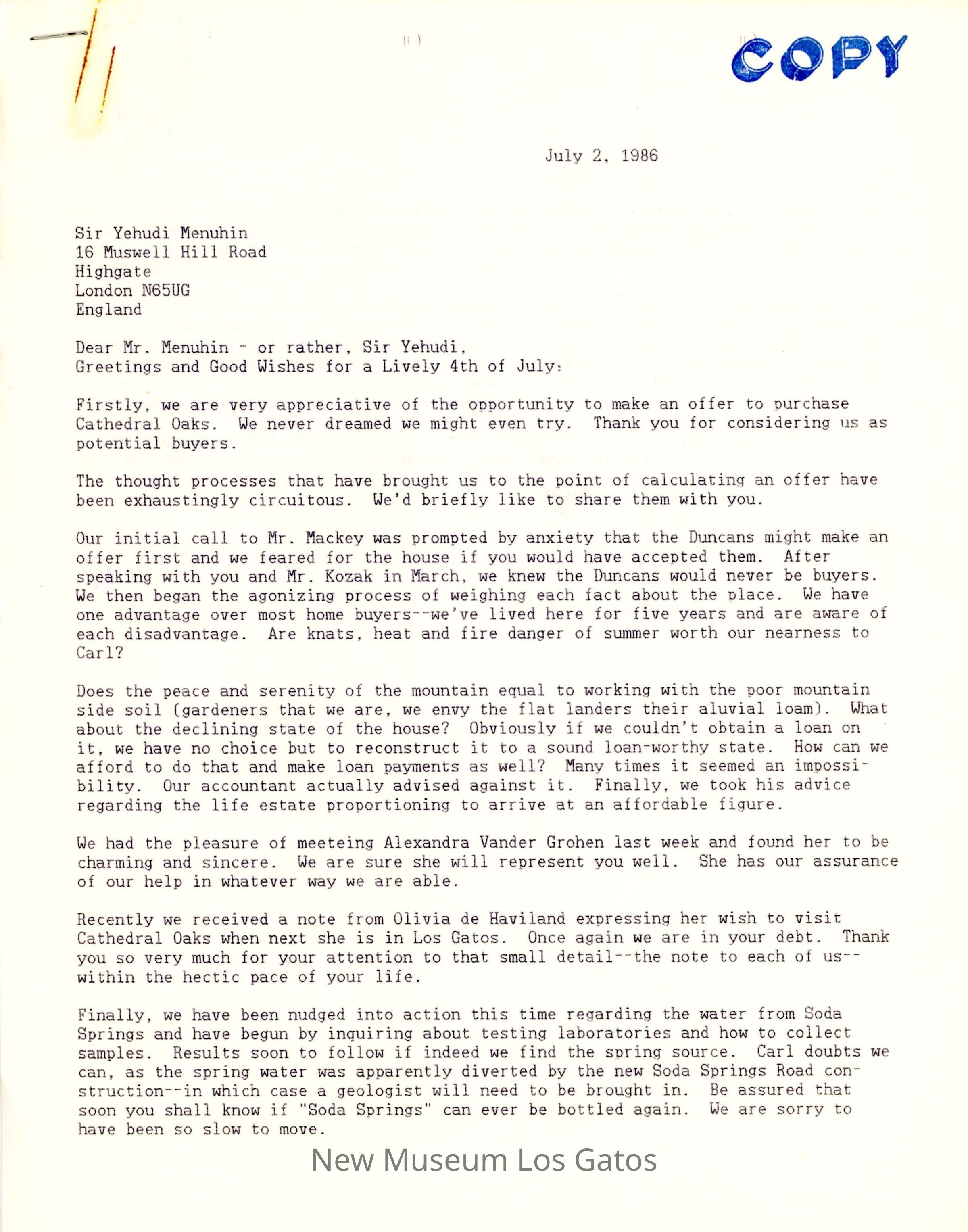 A copy of a two page letter from Barrie and Carol Coate to Yehudi Menuhin regarding his offer to purchase the Cathedral Oaks property. Written on July 2nd 1986.
