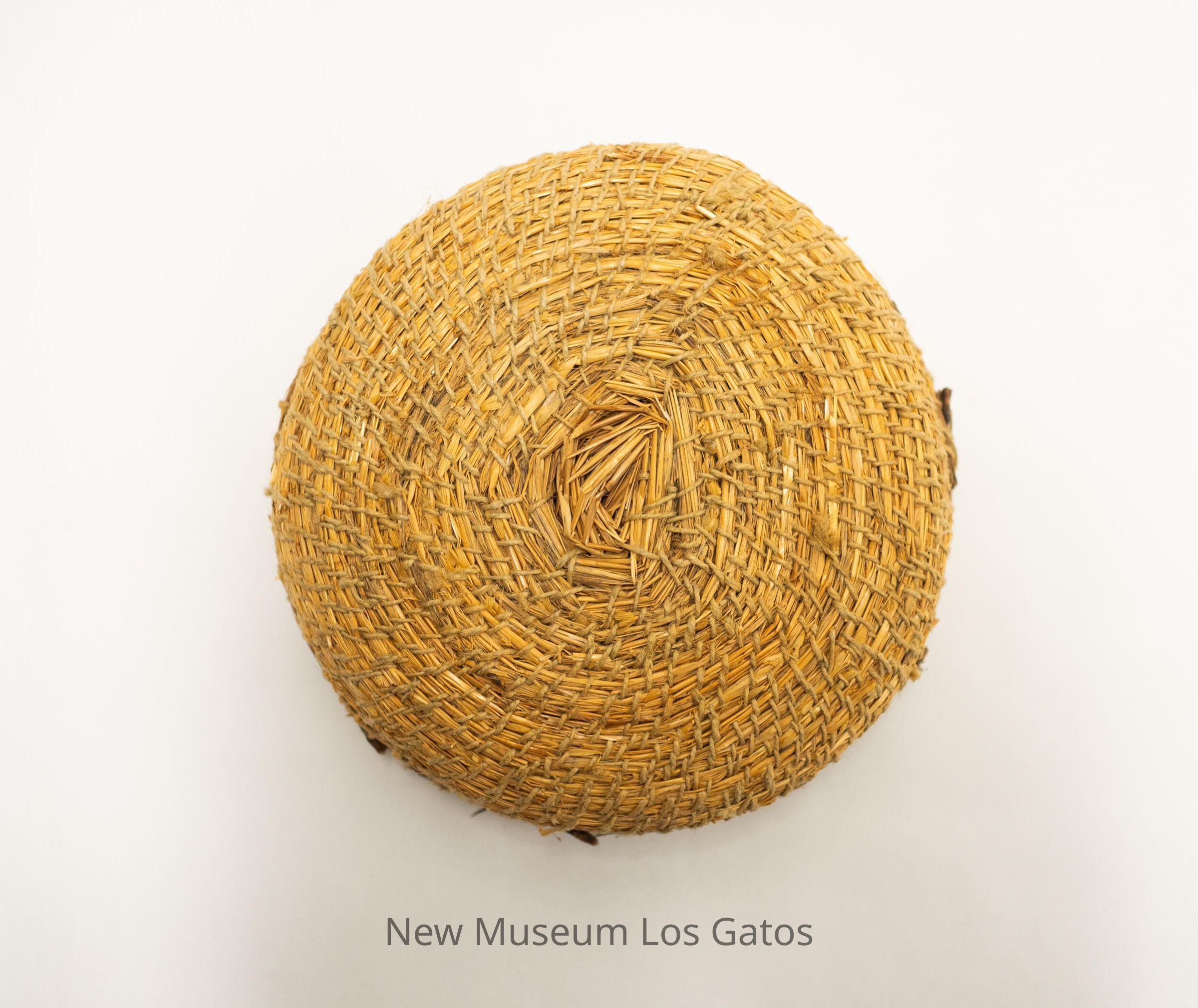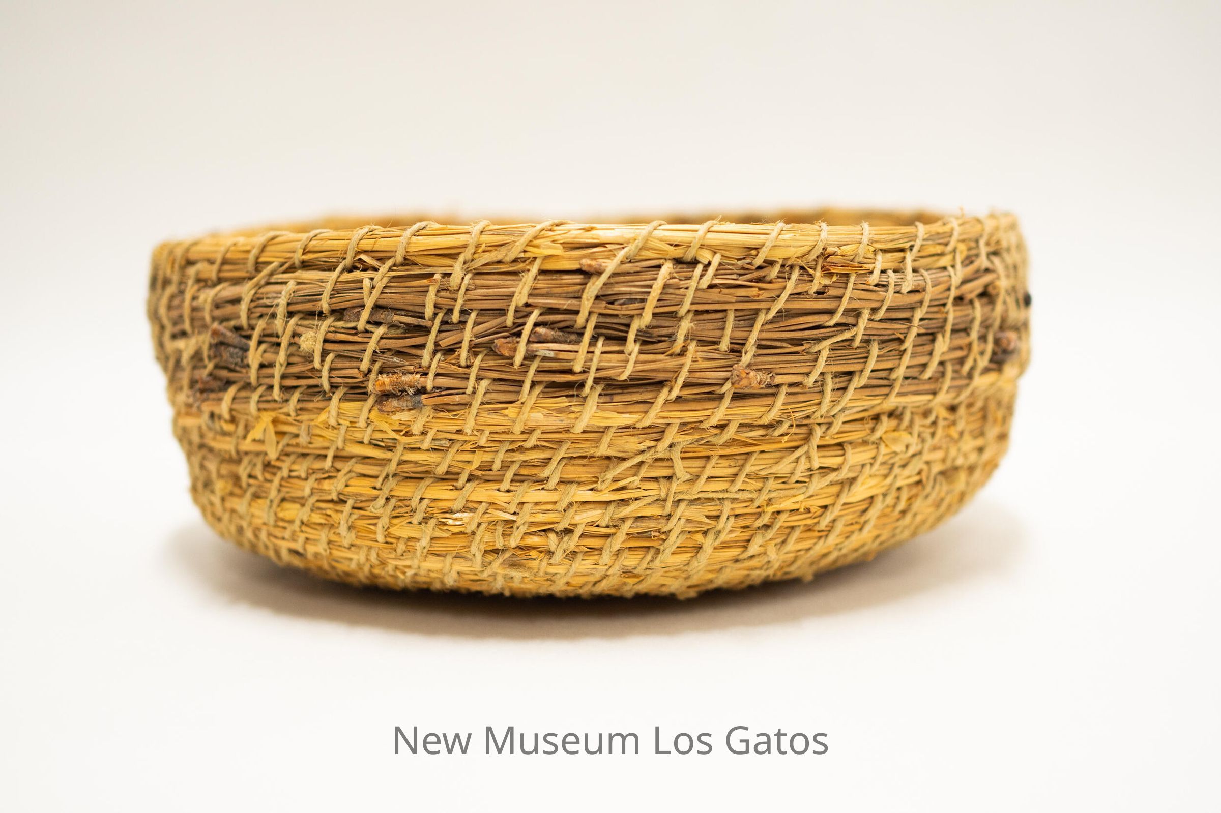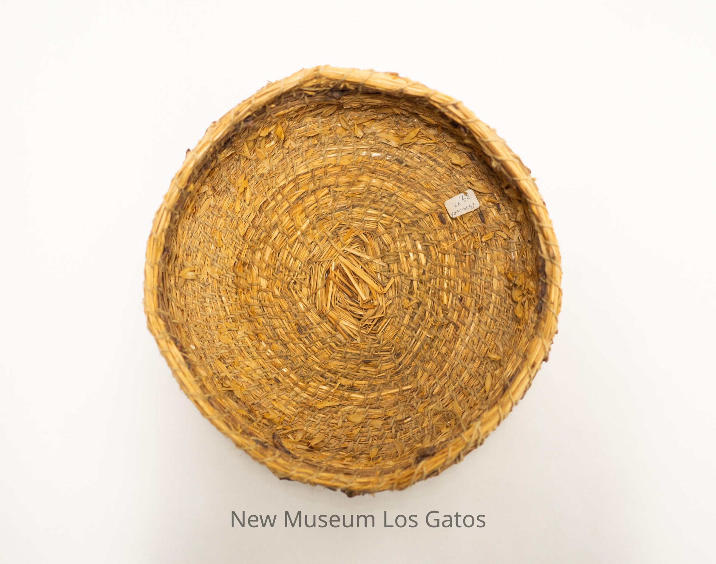 A medium-sized twined basket. The primary twined element appears to be made out of multiple materials, while the secondary twined element is a thin string. There is a small white sticker inside the basket that reads: "Basket 39.95."Collection