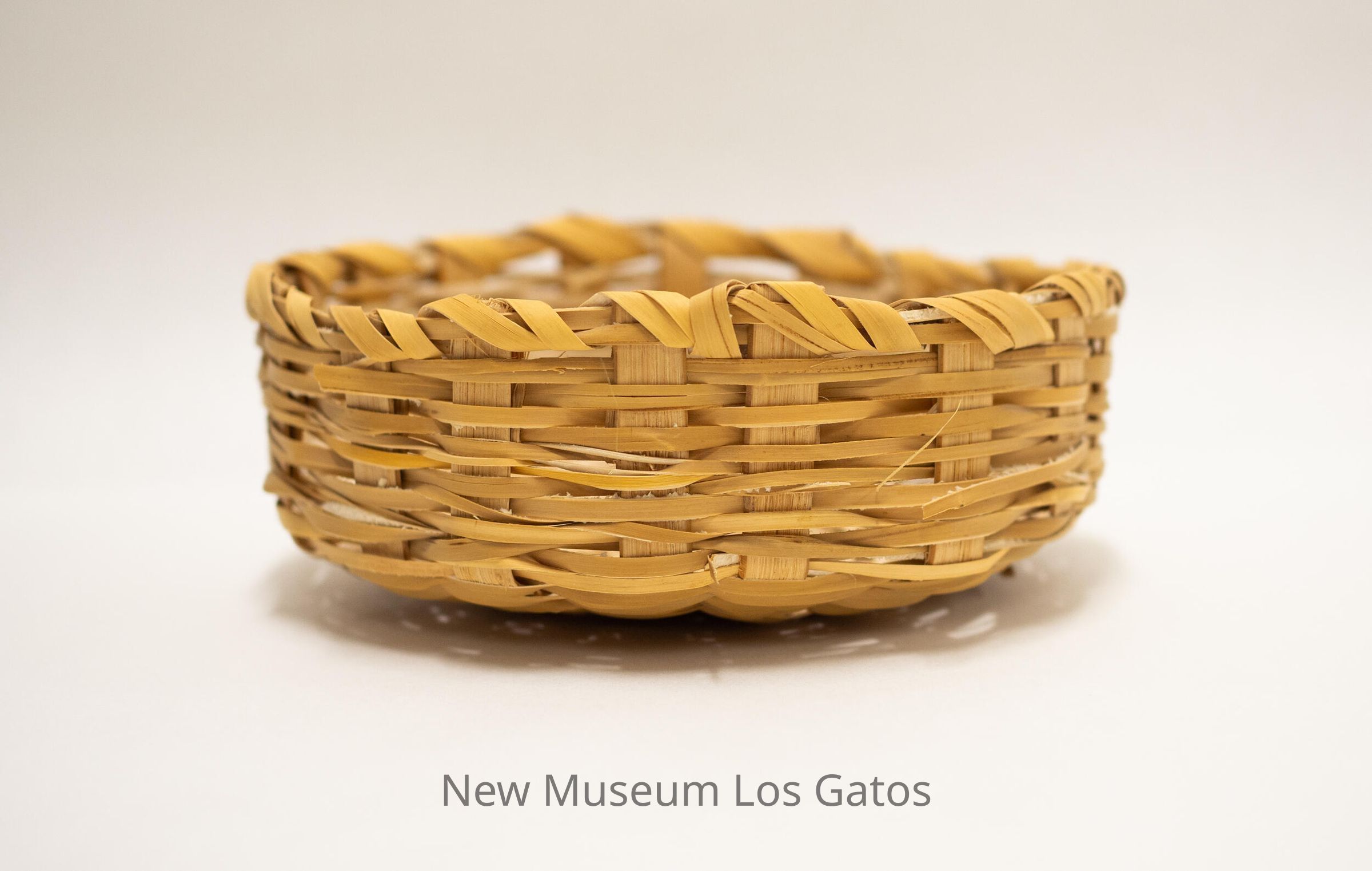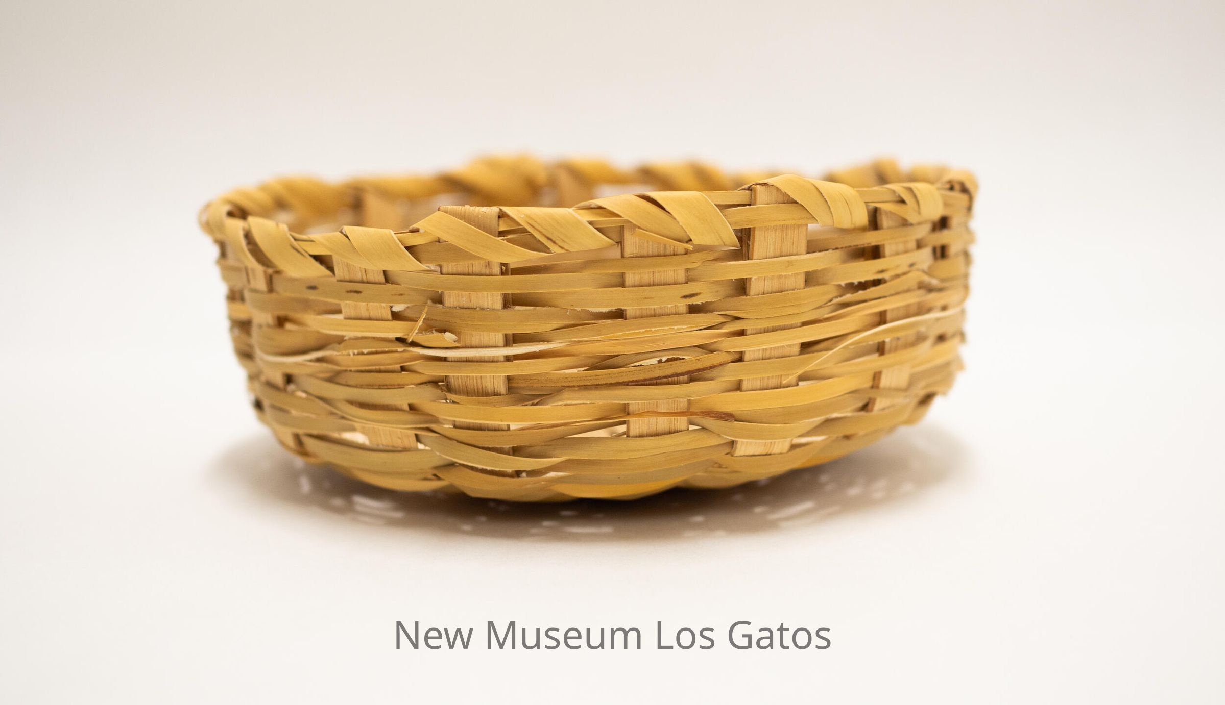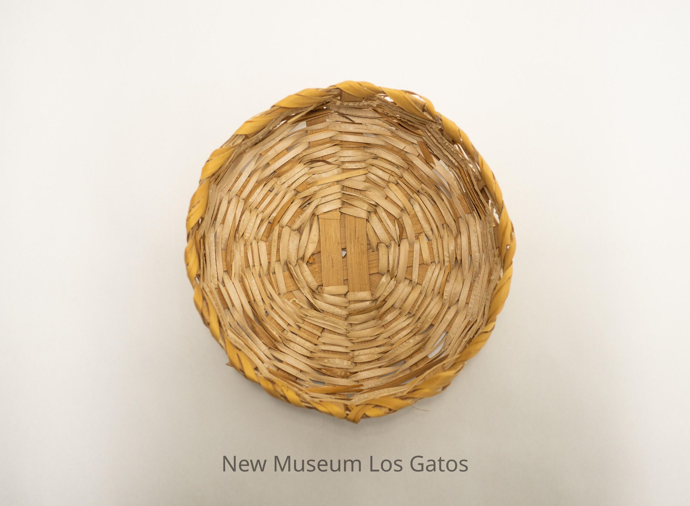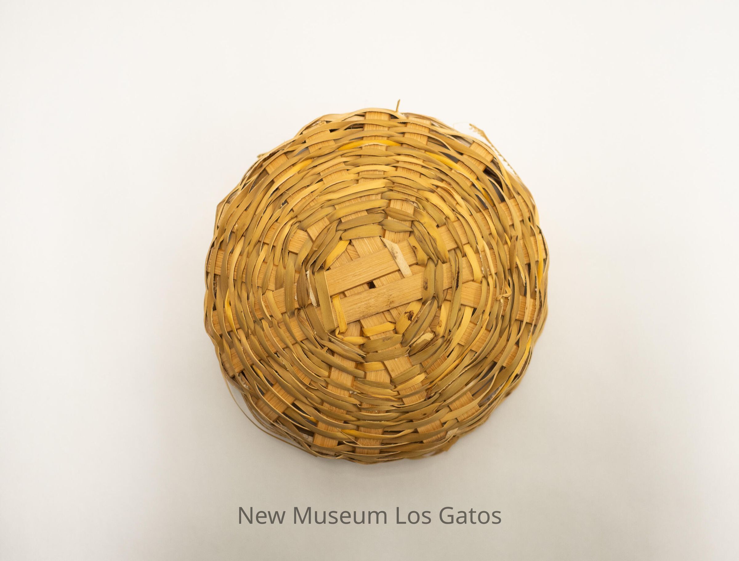 A twined basket, made out of large pieces of wood or reeds for the base material, and loosely interwoven with lighter colored reeds or grass.Collection