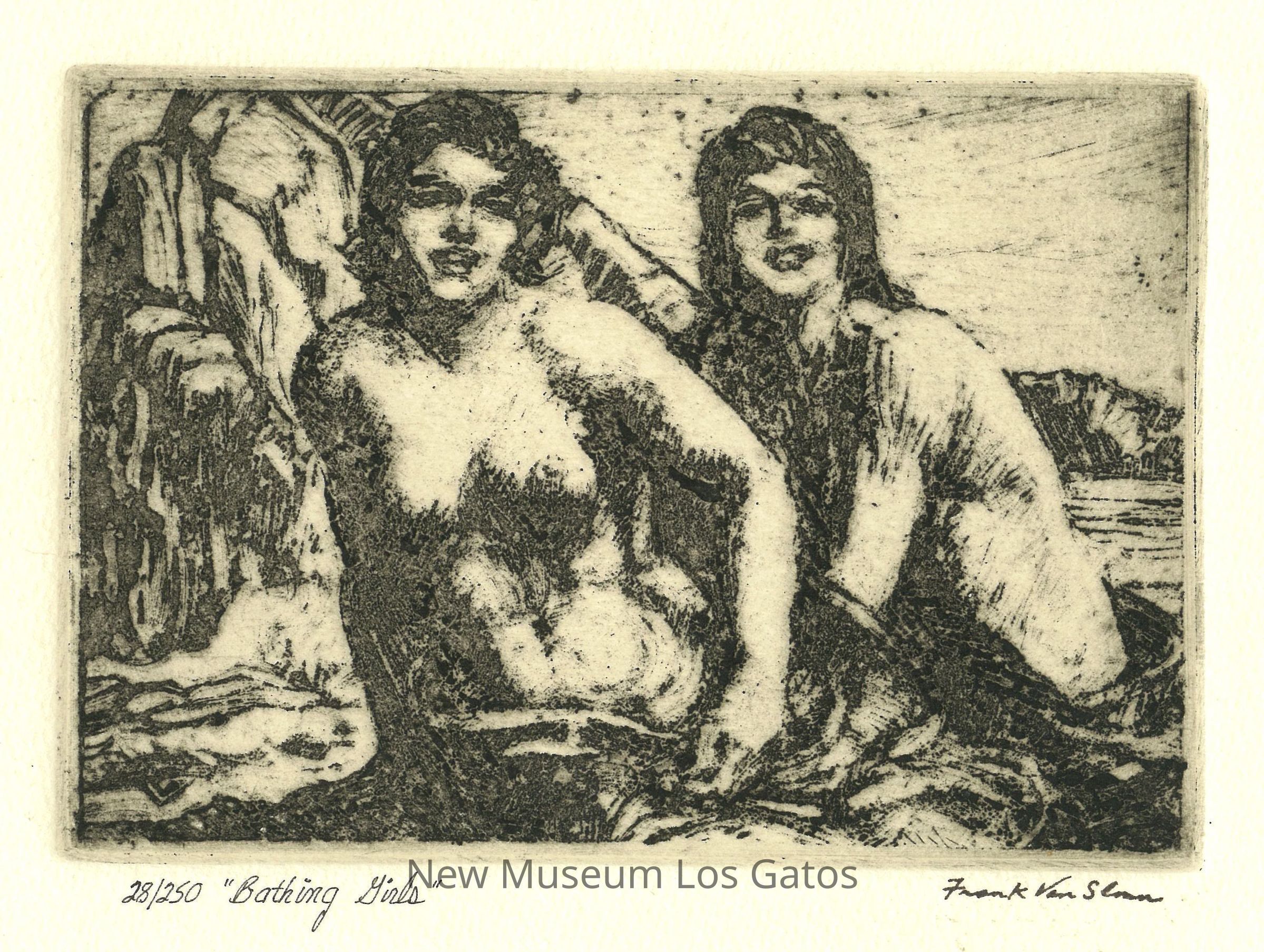 A monochrome print of two nude women bathing outdoors. There is a large rock behind the figures.