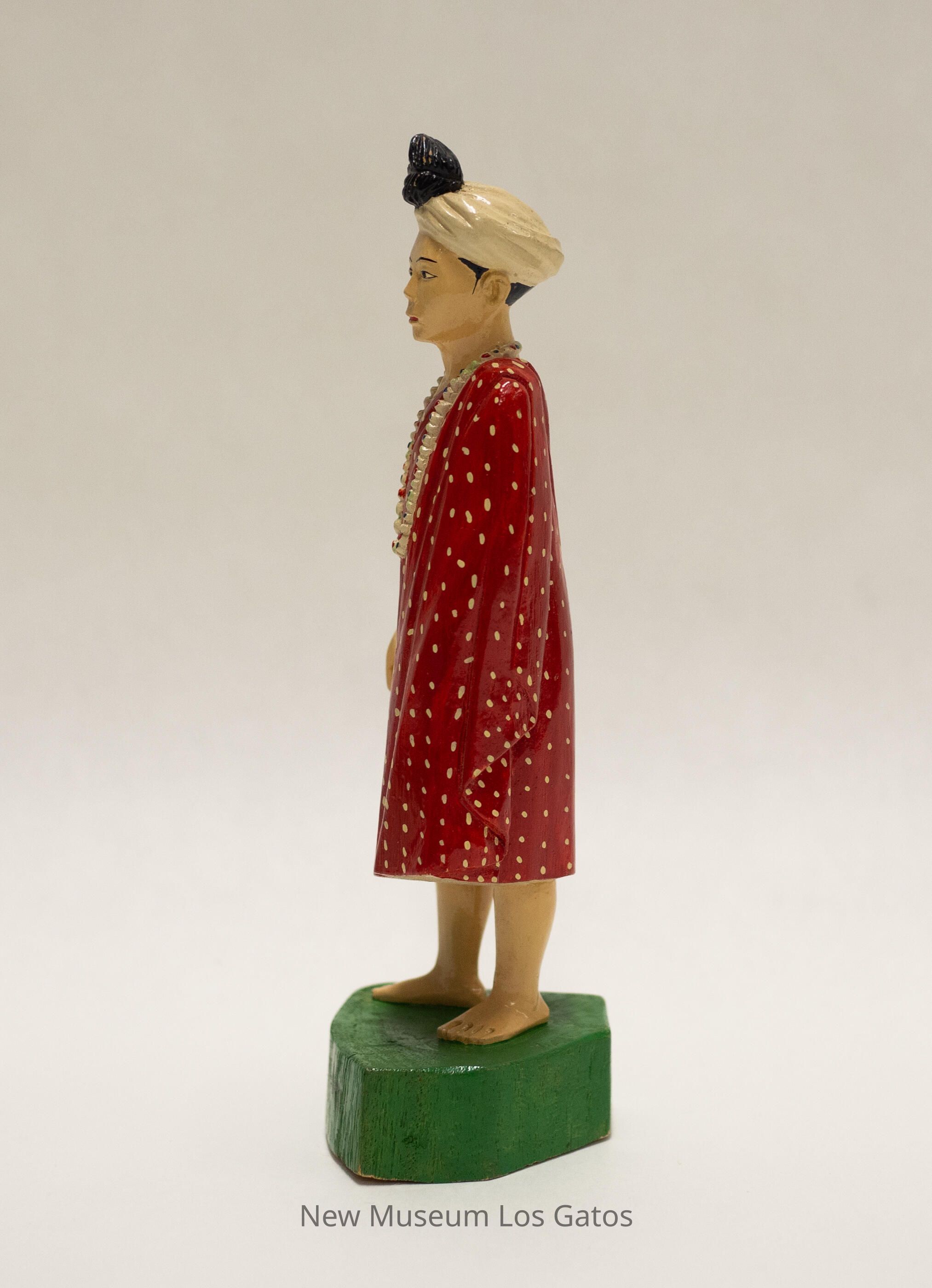 A painted carved wooden figurine depicting a man standing on a patch of grass. The grass/base is roughly triangular, and painted green with black Burmese characters. The man has cream-colored skin, and is wearing a red over-the-shoulder wrap, exposing the right arm. The wrap has tan polka dots throughout, with two vertical stripes on the right side. The man is wearing a black, red, and green beaded necklace as well as a white turban with a black knot towards the front.Collection