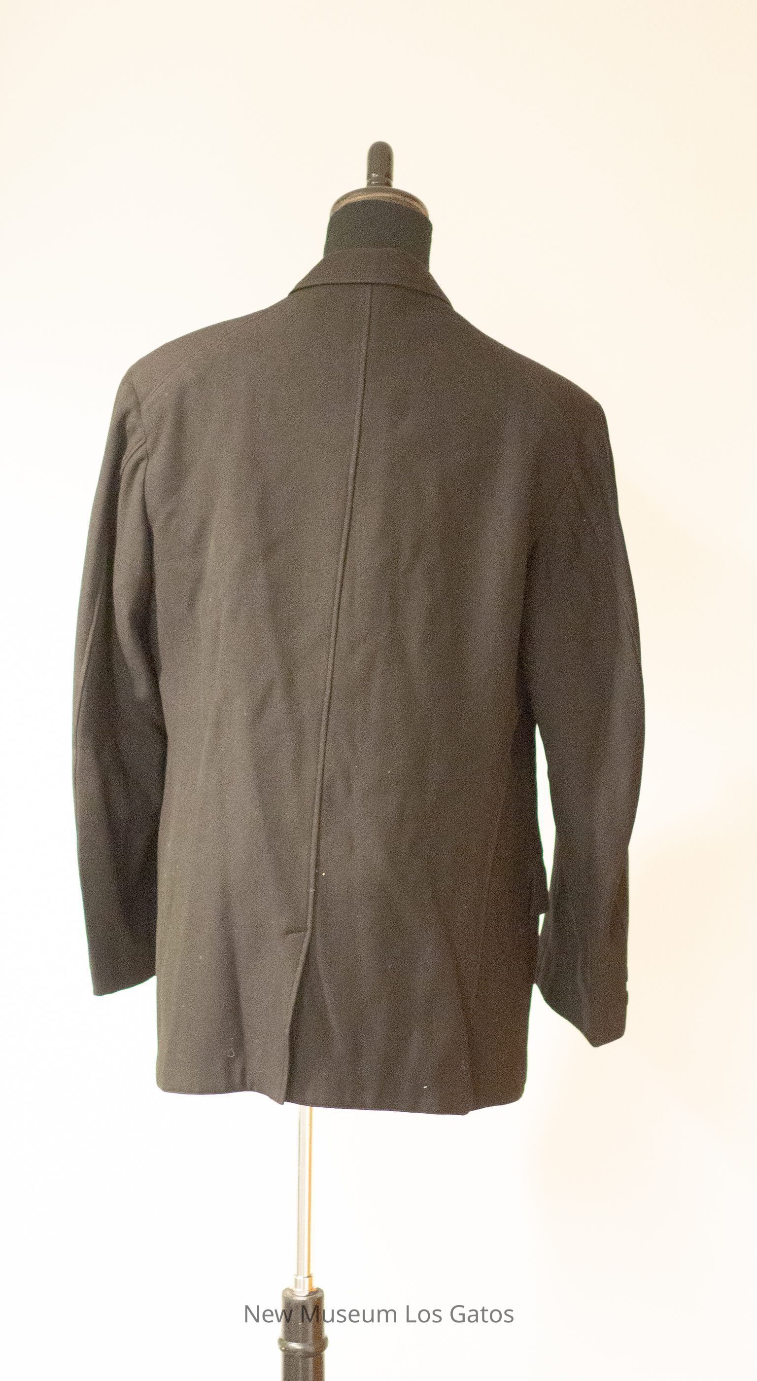 A black wool dress jacket. There are two pockets with flaps on the right side, and one pocket with a flap on the left side. There is also a pocket without a flap, on the left chest area. The jacket closes with four black buttons. There are also two decorative black buttons on each sleeve.Collection