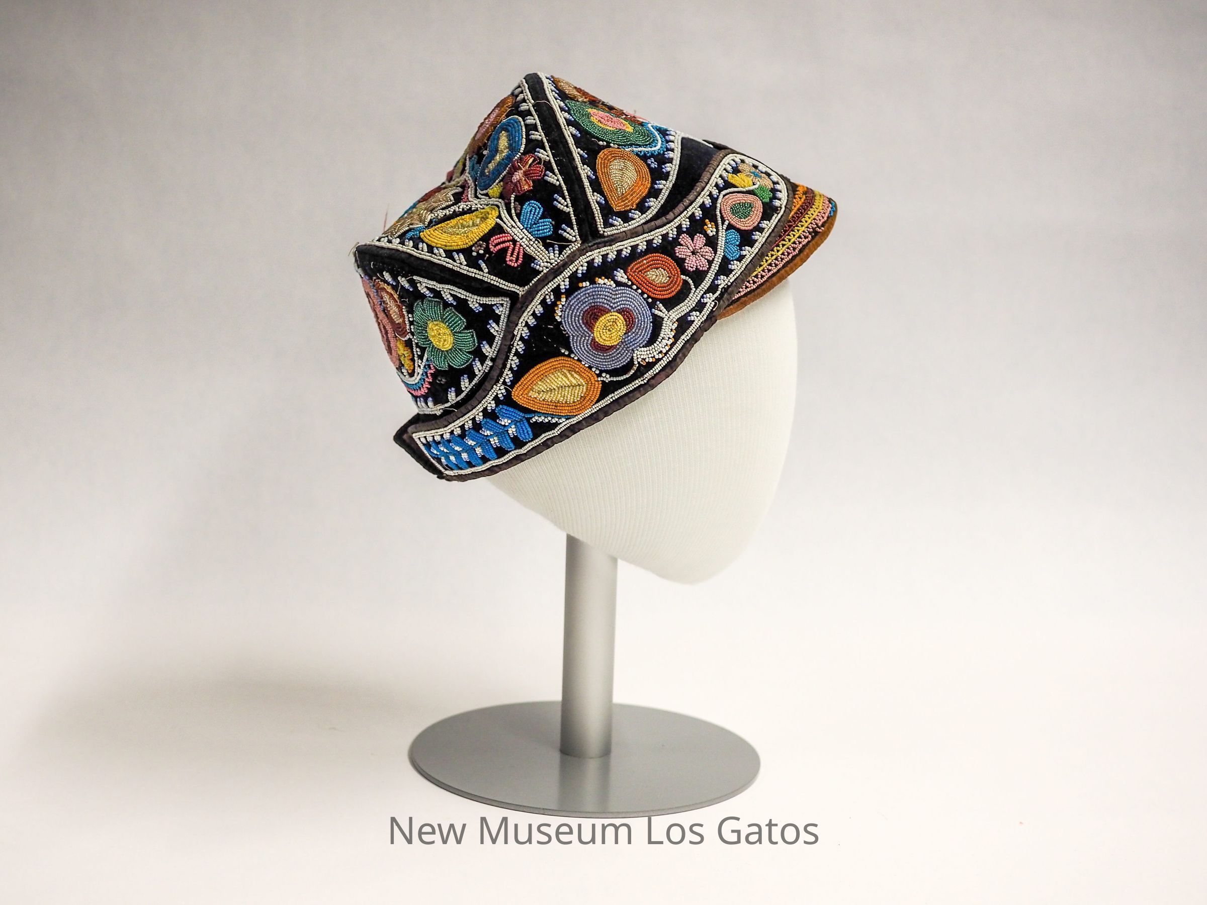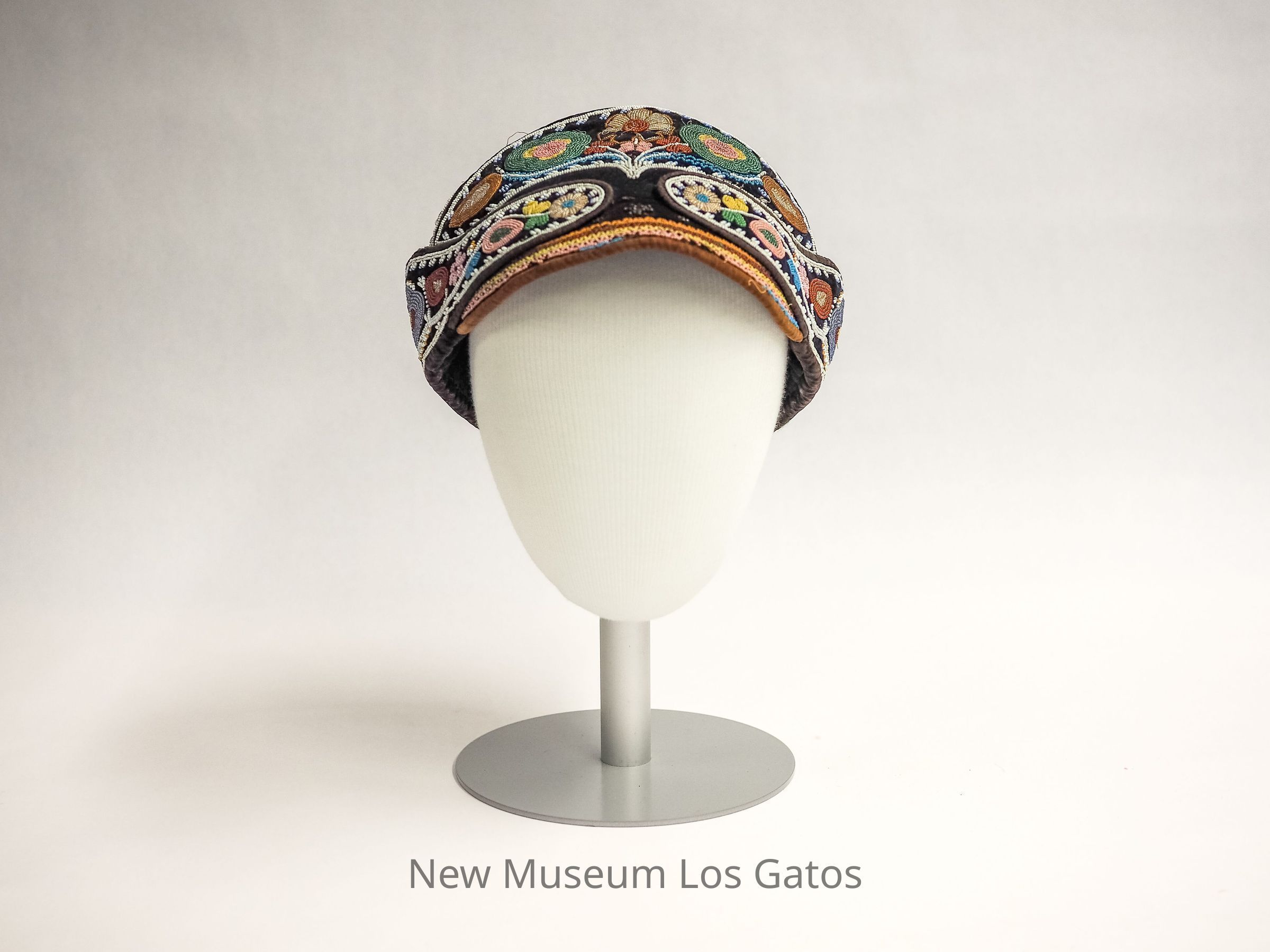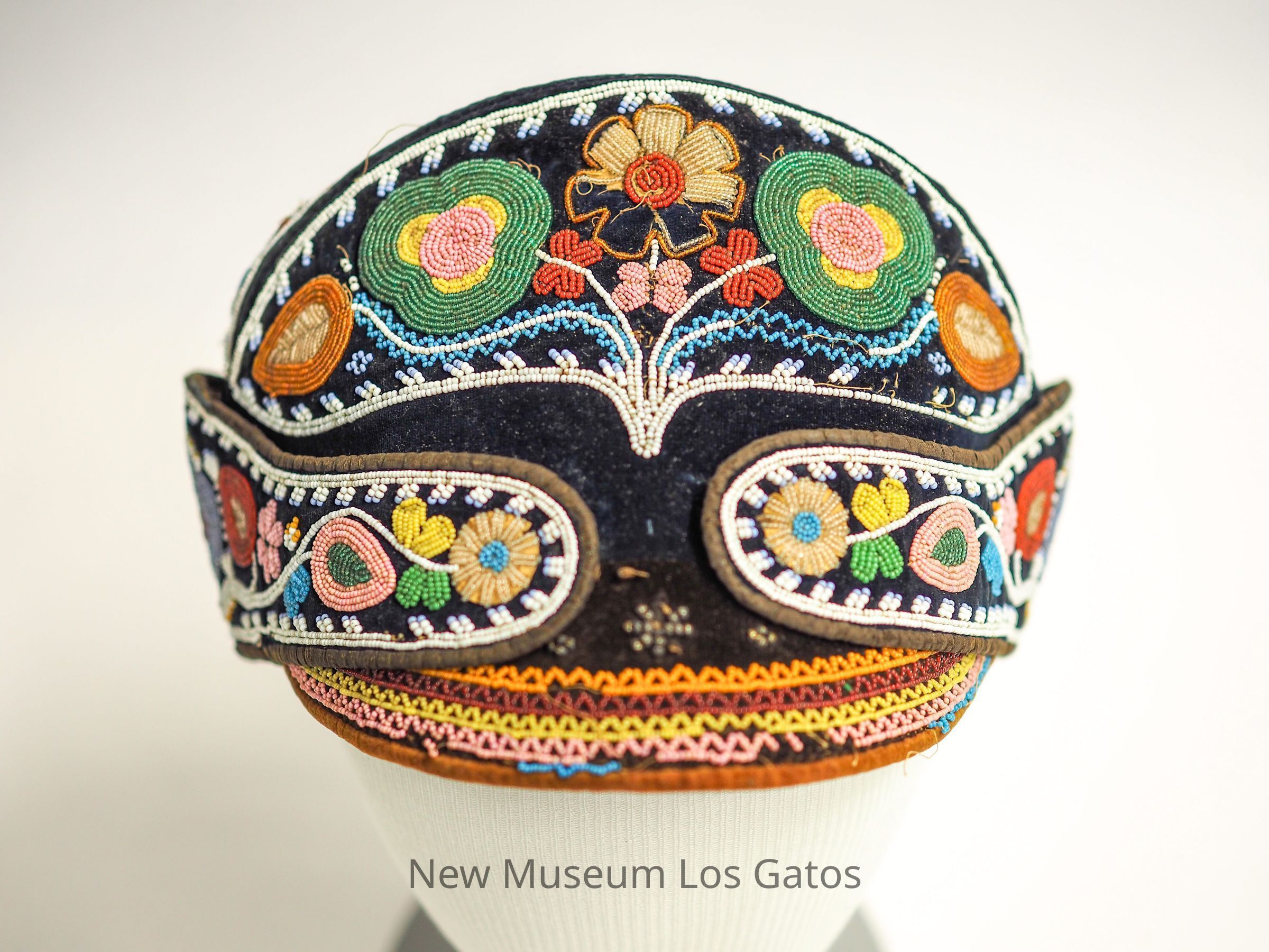An indigenous beaded cap of similar structure to a military cap. The cap consists of many colored beads over black velveteen. The interior lining is of an unidentified brown fabric and has a spherical pouch where the head would fit.