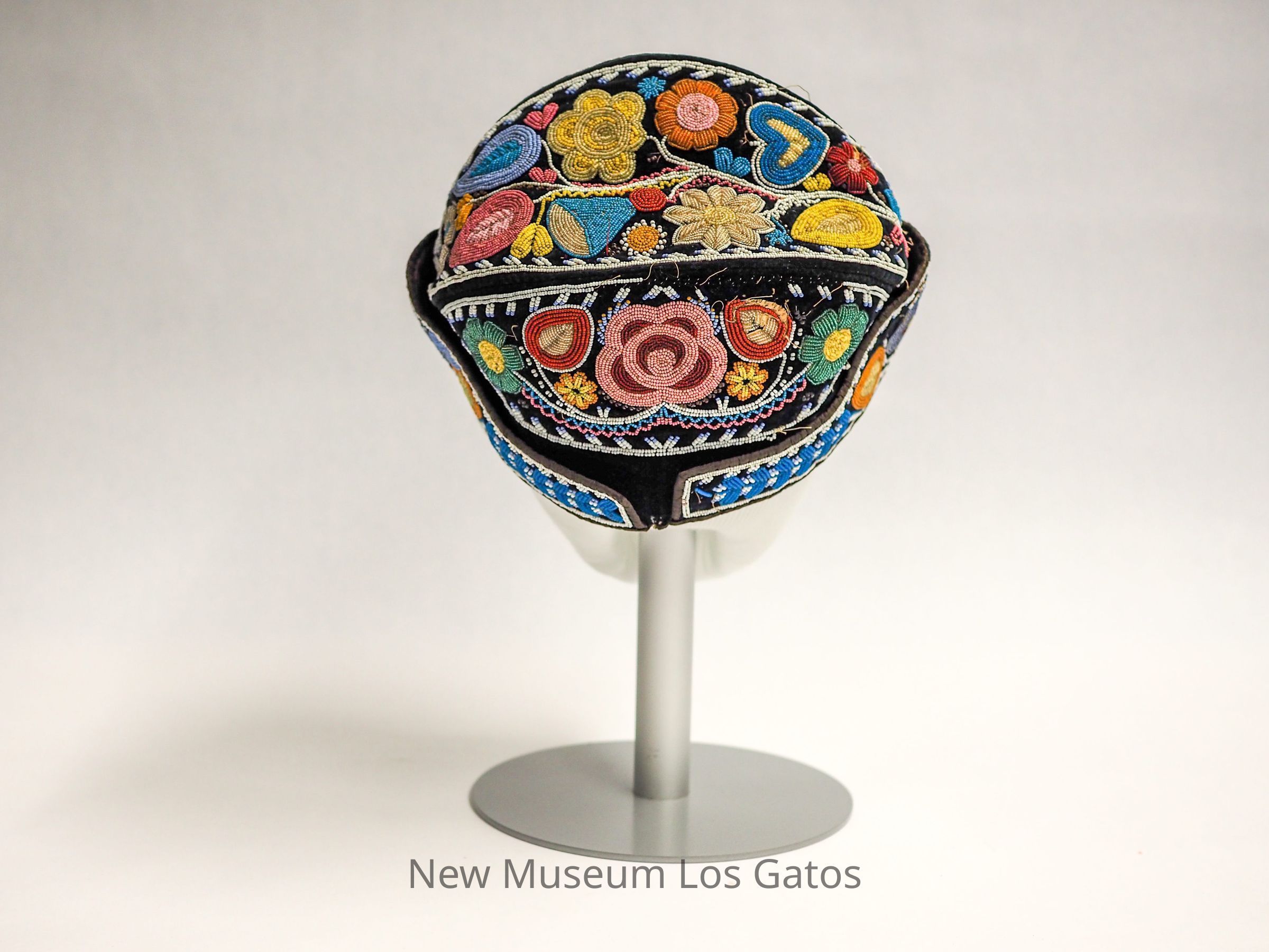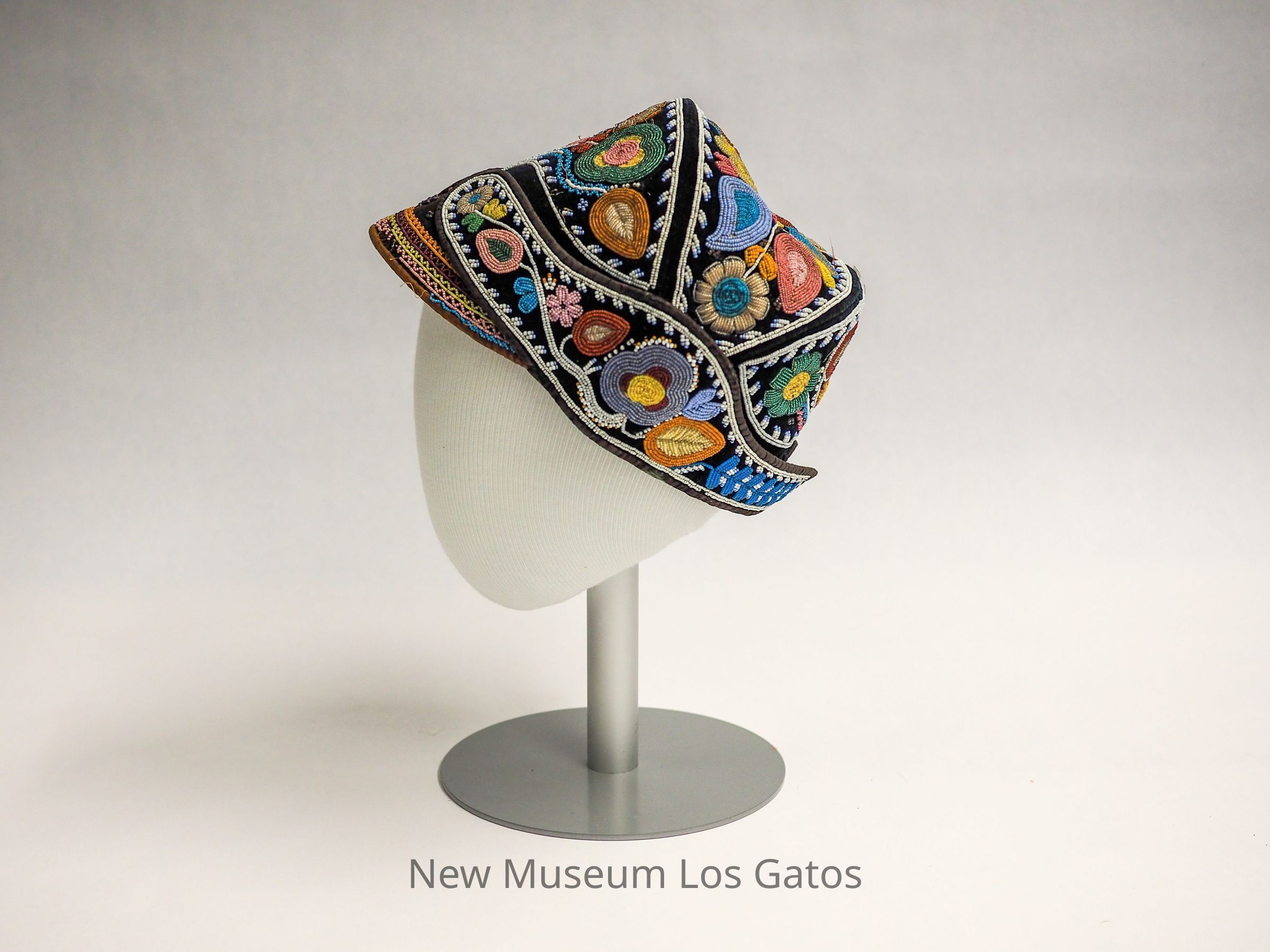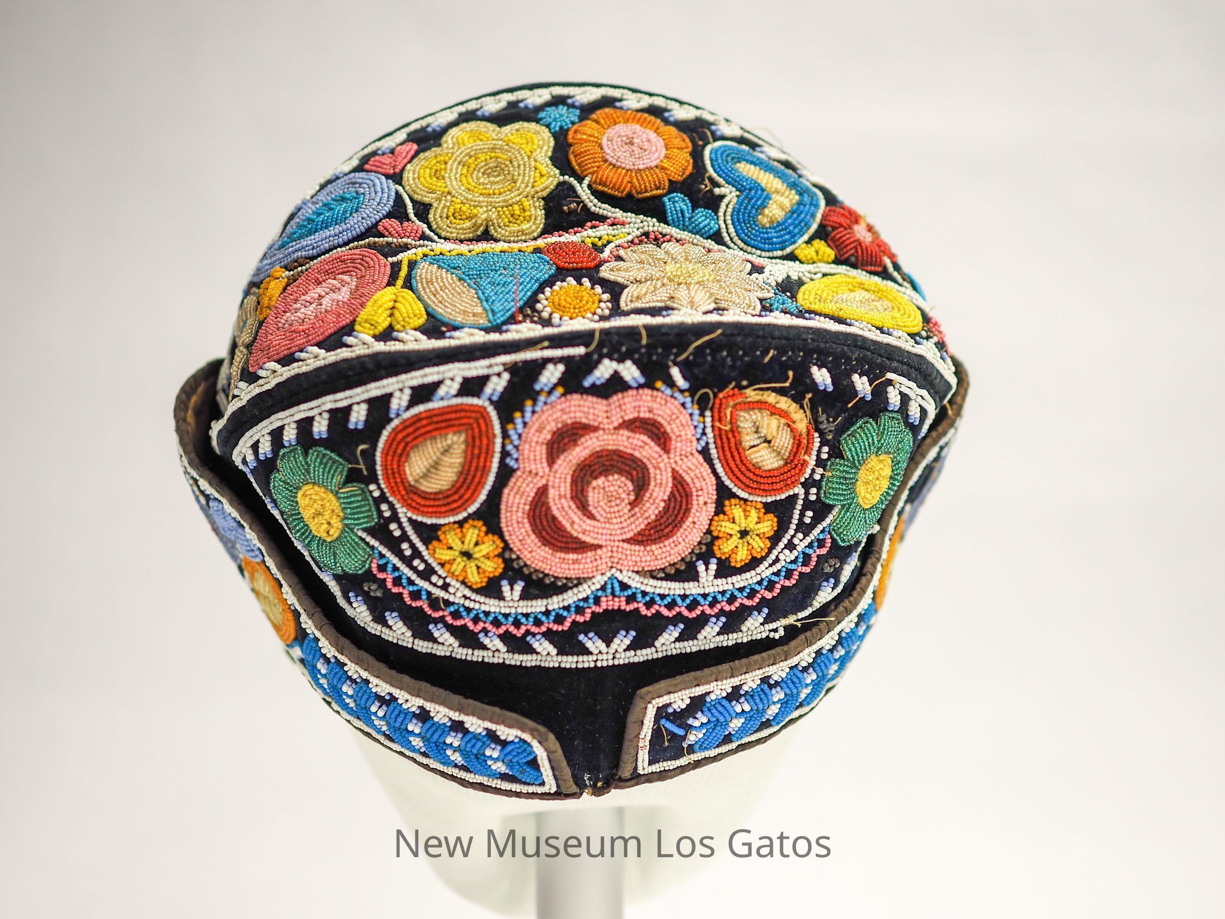 An indigenous beaded cap of similar structure to a military cap. The cap consists of many colored beads over black velveteen. The interior lining is of an unidentified brown fabric and has a spherical pouch where the head would fit.