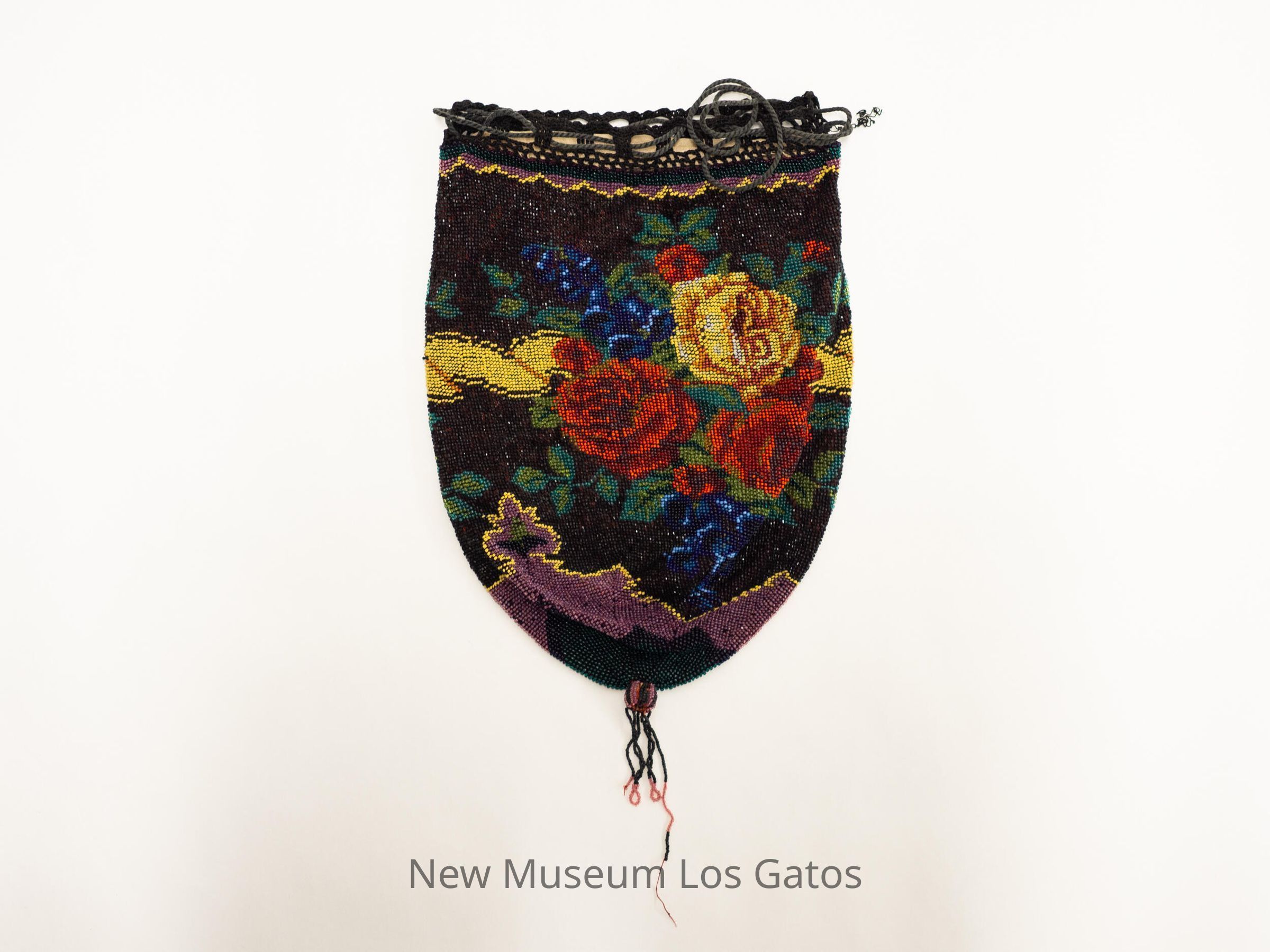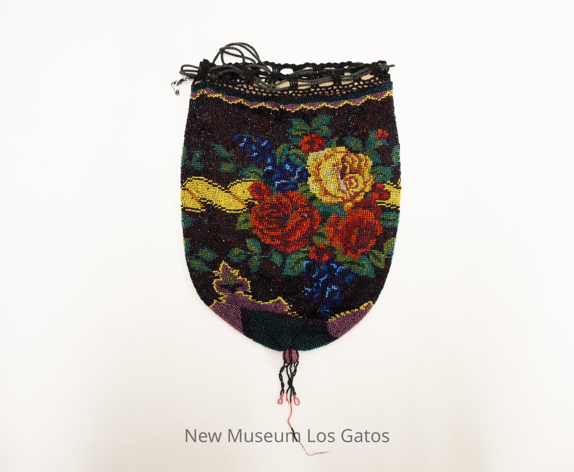 An intricately beaded, elongated drawstring purse. The background of the purse is black, with yellow, red, and blue flowers and green leaves. There is green, purple, and yellow geometric patterning along the top and bottom of the purse, and a black and purple beaded ball and fringe at the bottom. The fabric of the purse lining is tan.Collection