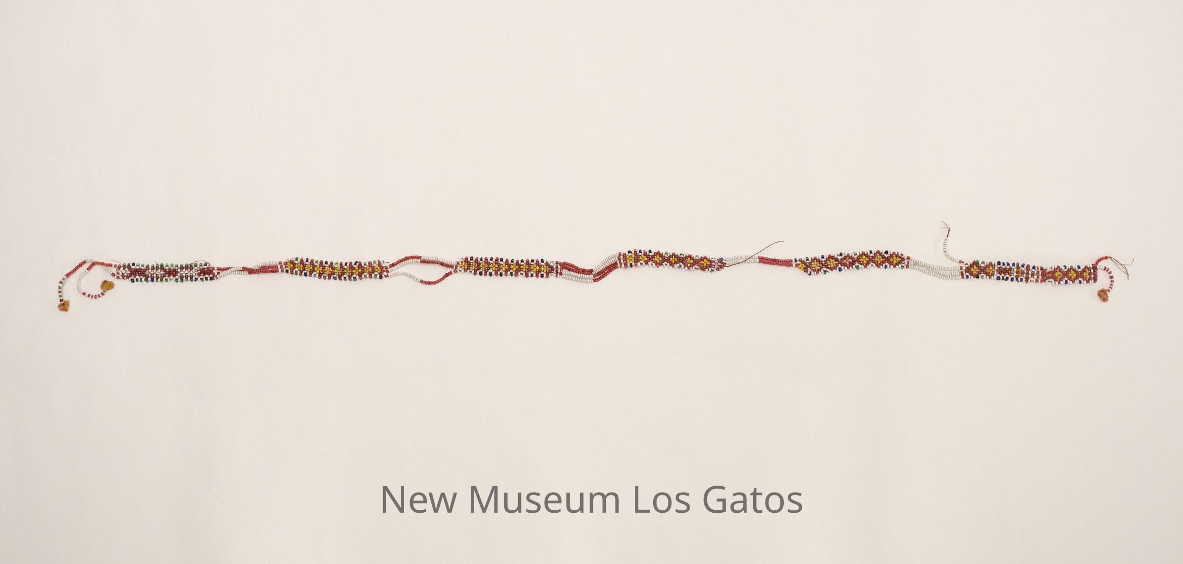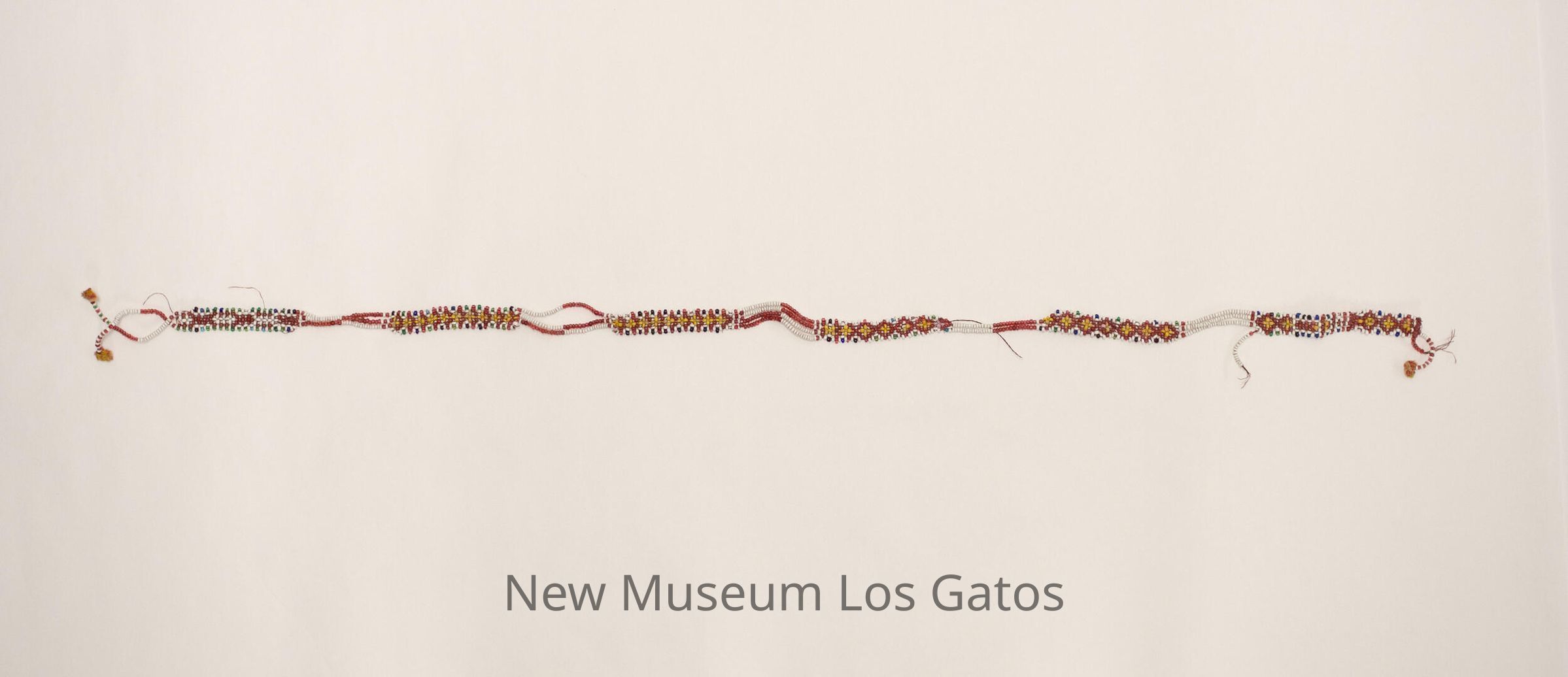 Long, beaded necklace with five rectangular sections that have yellow or white 'x' patterns on a red background, surrounded by white and other color beads. The five sections are connected to each other by four strands of red and white beads.Item Type