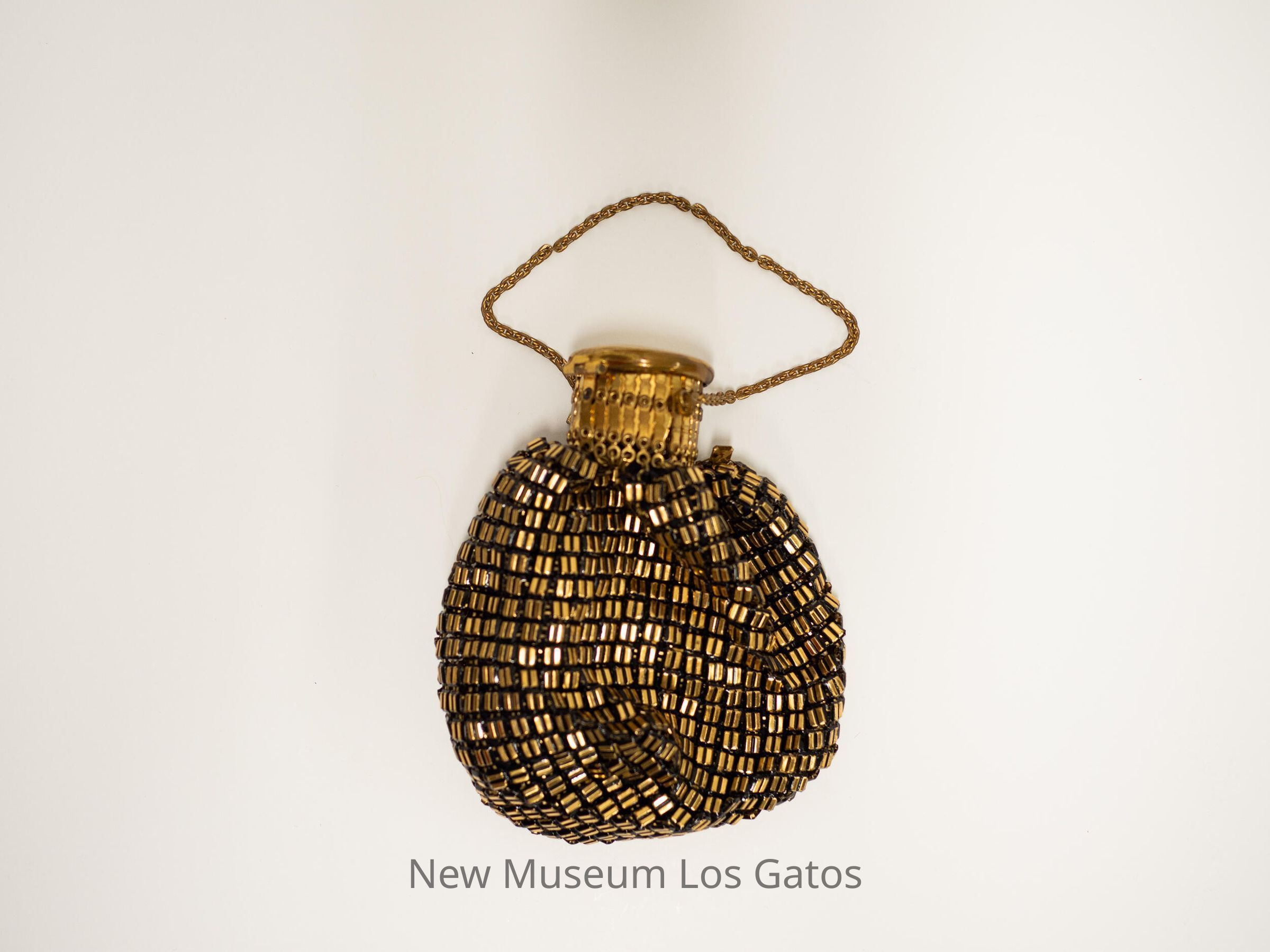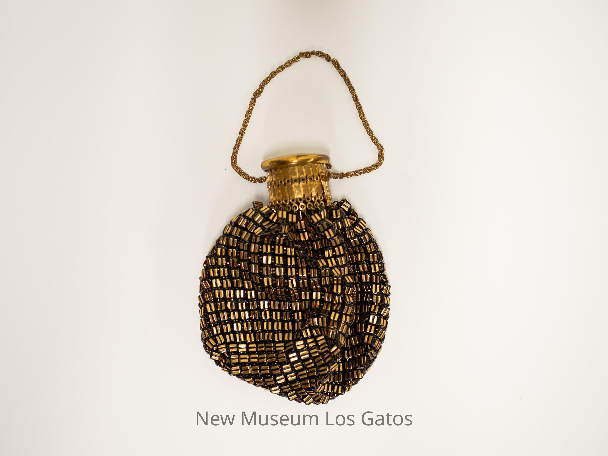 Black and gold beaded purse, with gold metallic top and cover and gold carry chain. There is black fabric lining inside the purse.