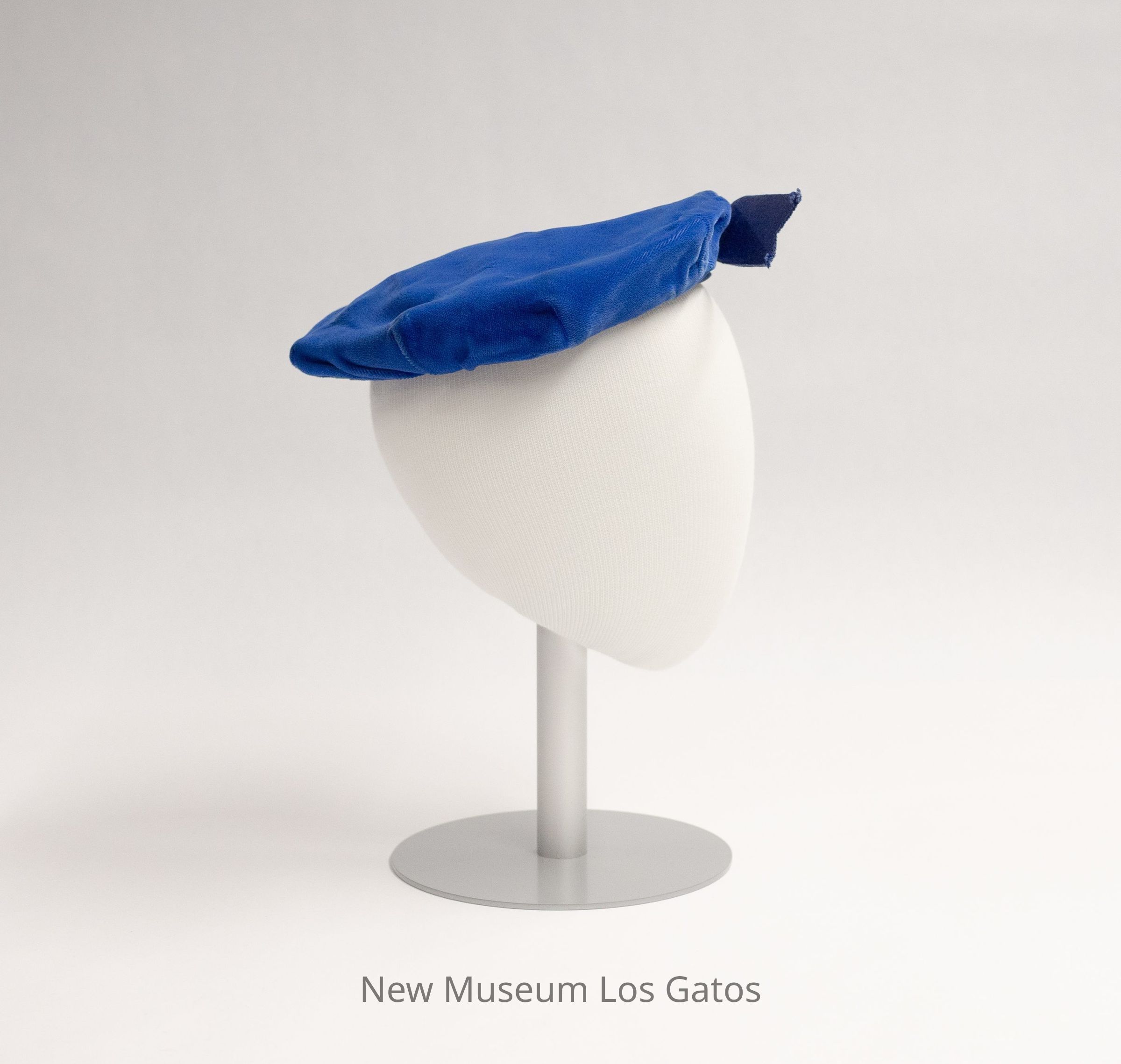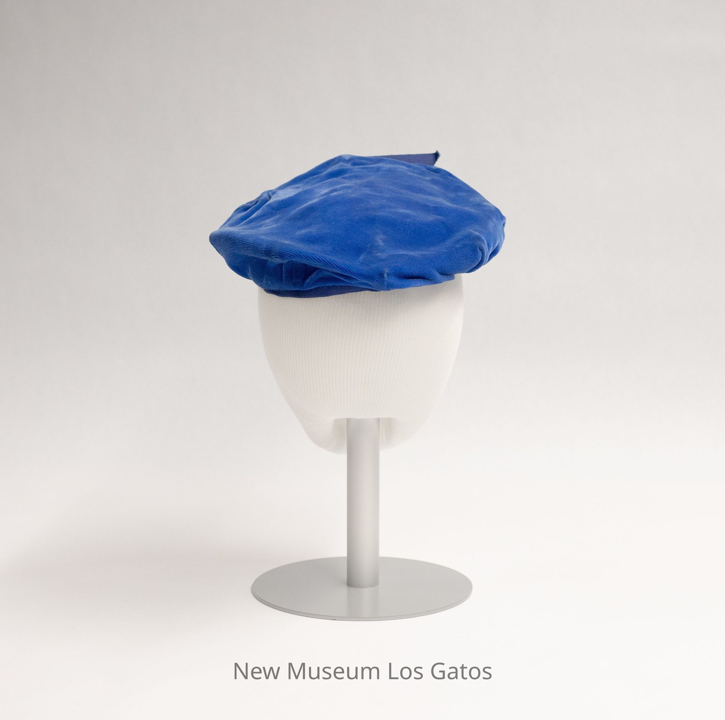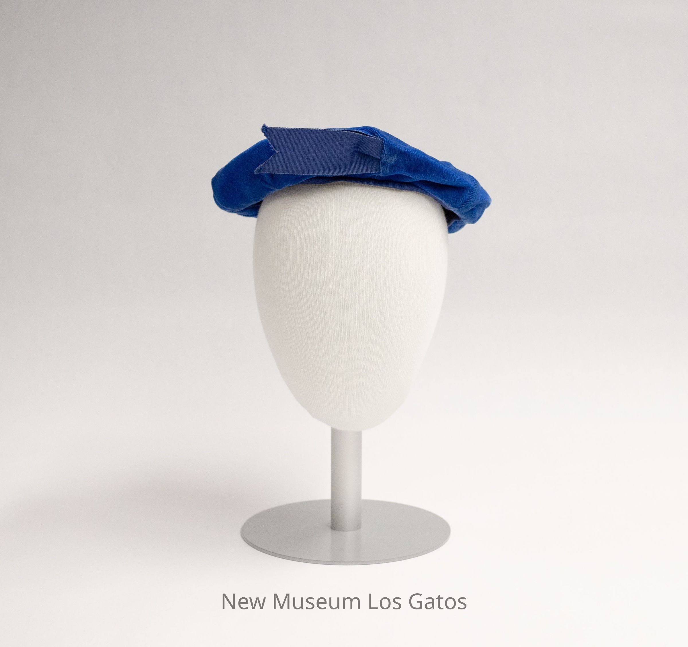 A blue velvet beret, with navy blue ribbon trim around the bottom edge and a straight navy blue ribbon coming out of the front. The interior of the beret is black.