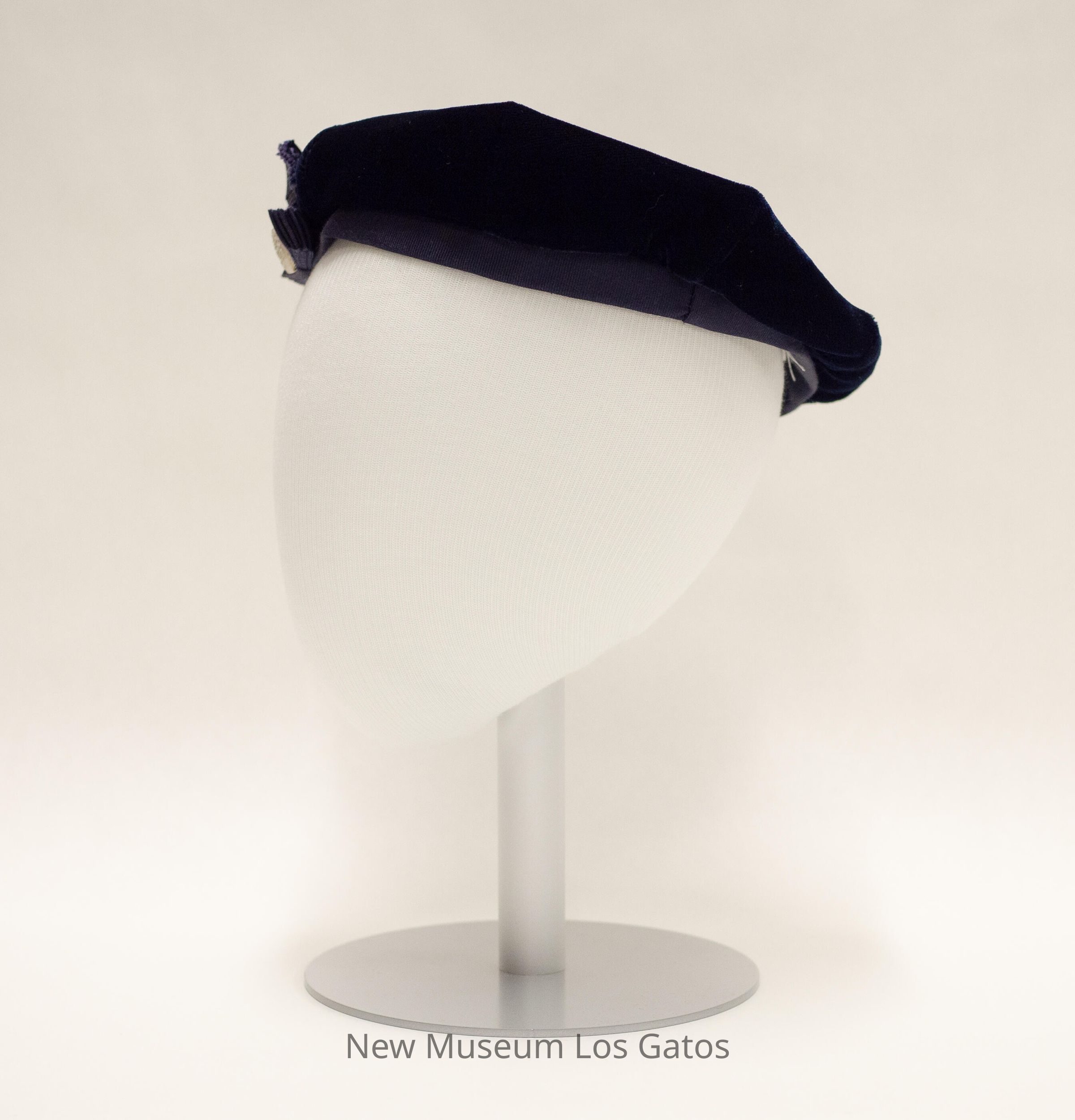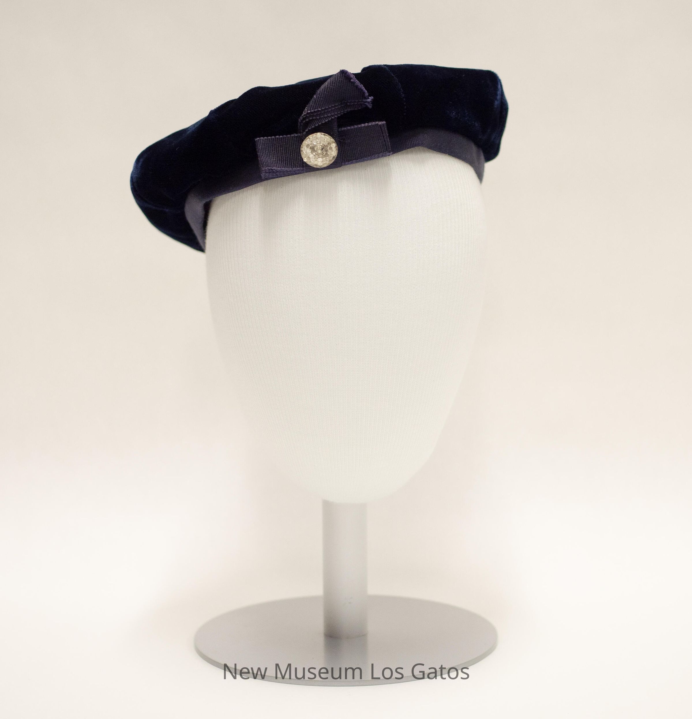 A navy blue velvet beret, with a blue ribbon bow and clear decorative button at the front of the beret. The interior of the beret is magenta.